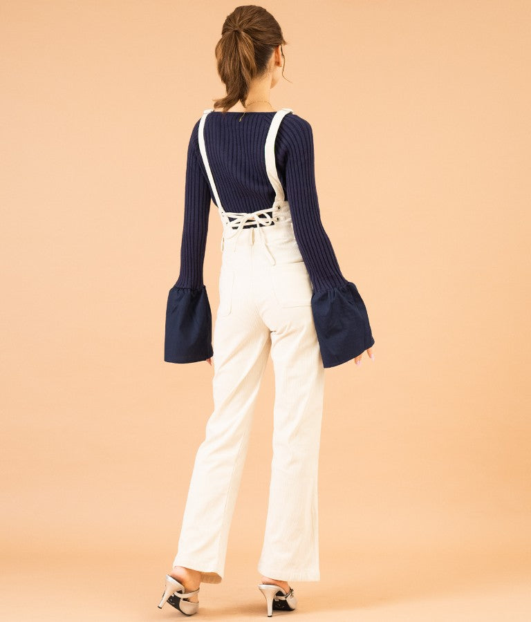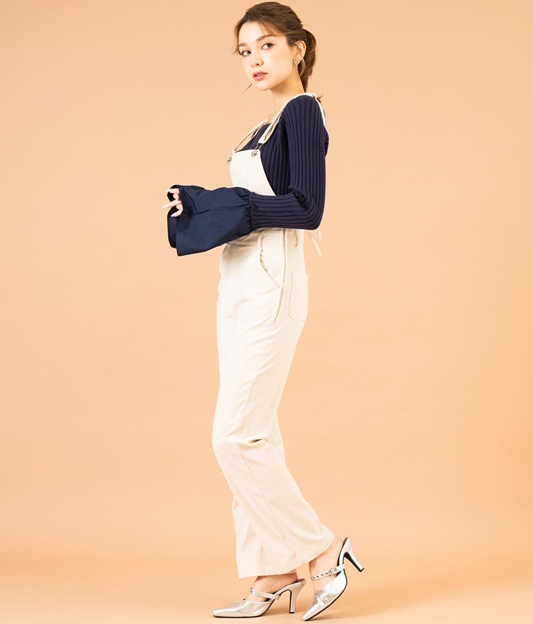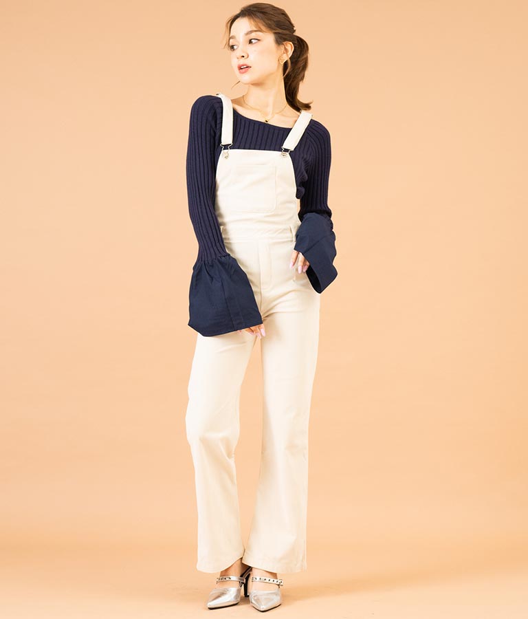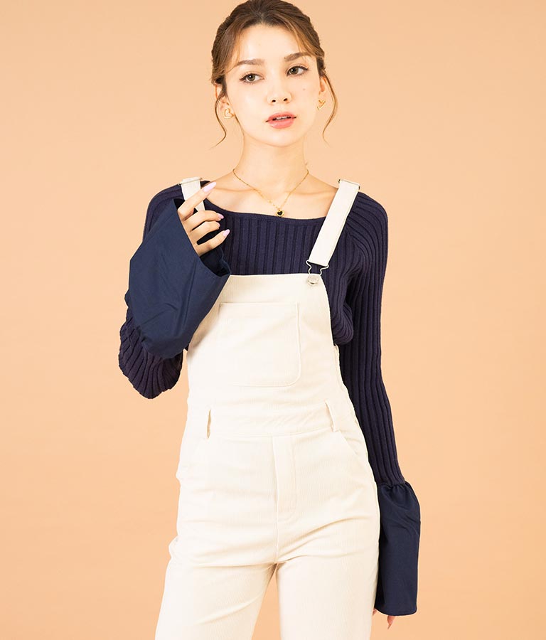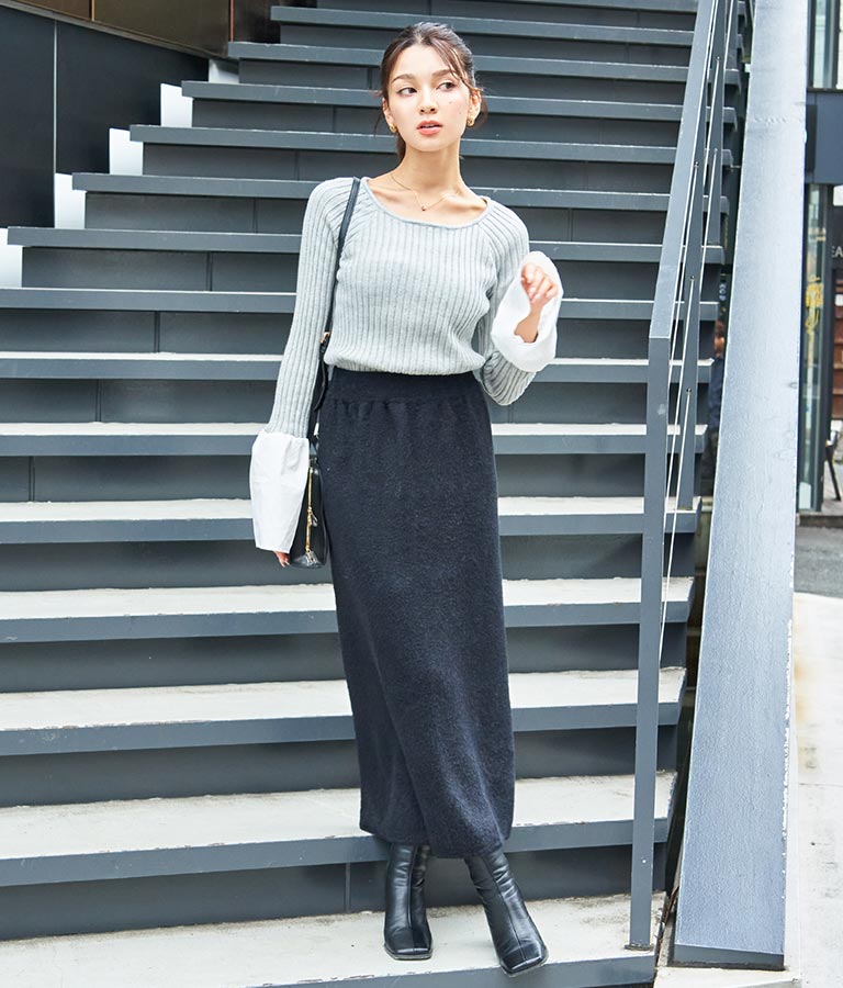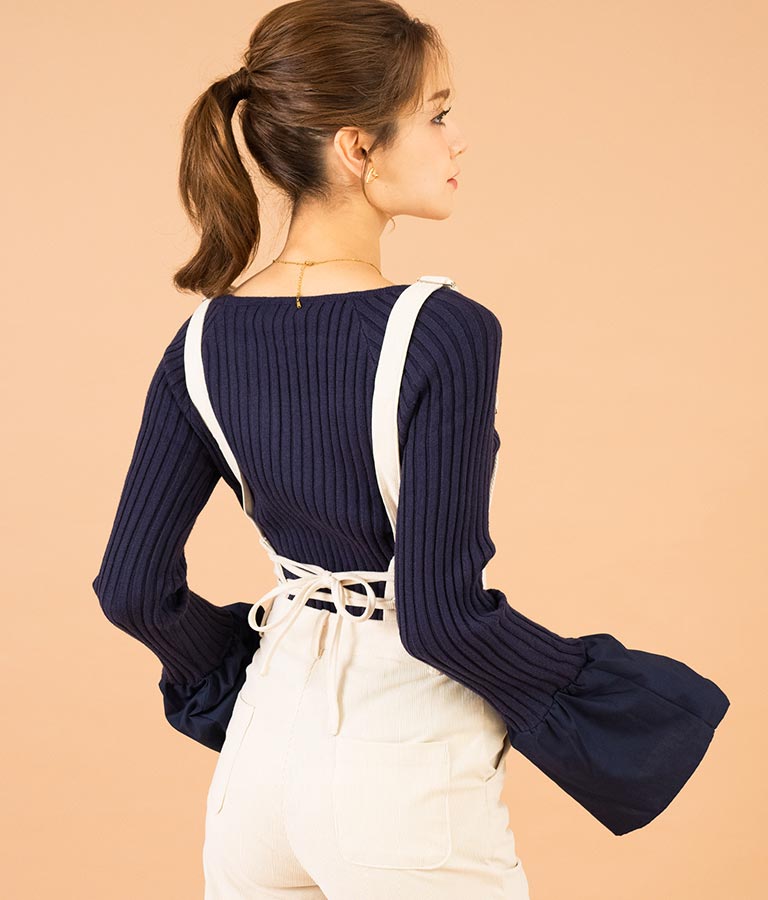 異素材に切り替えたベルスリーブがアクセントのニットトップス。