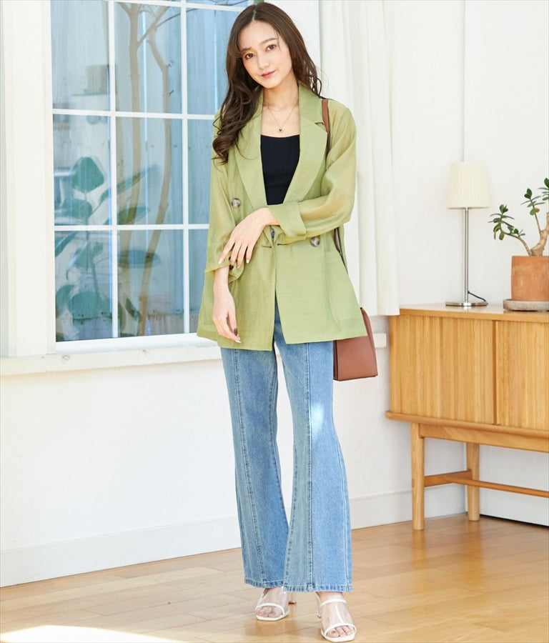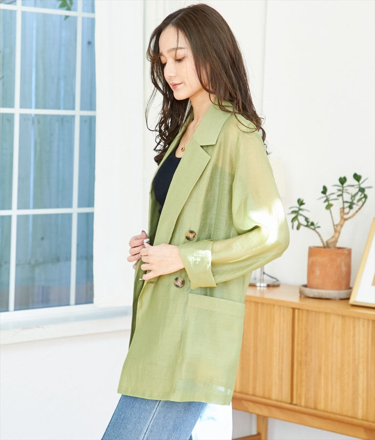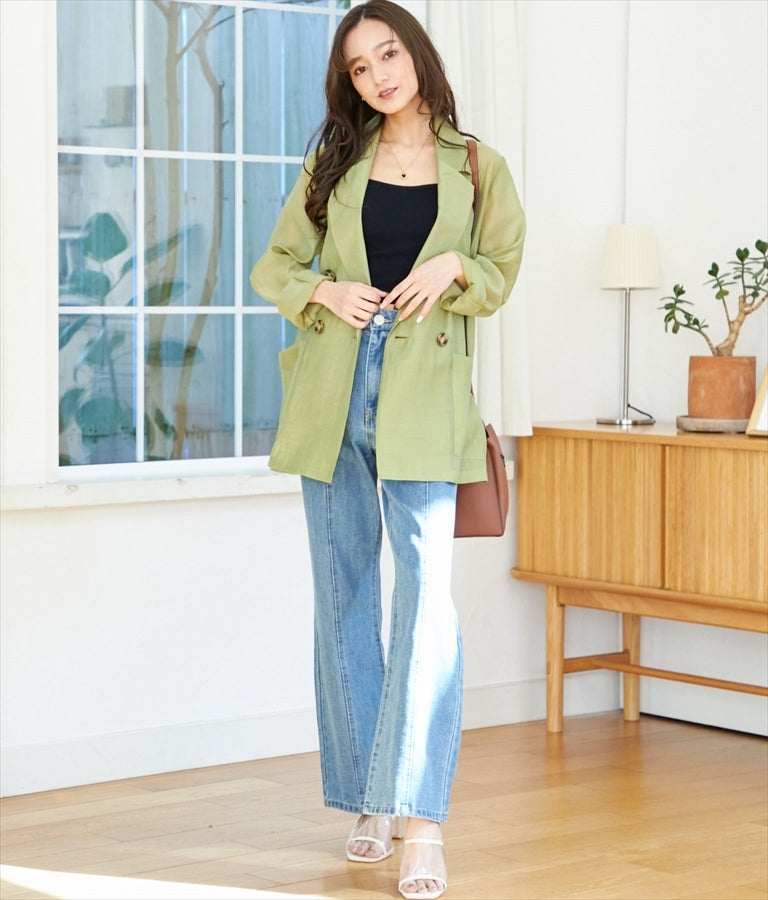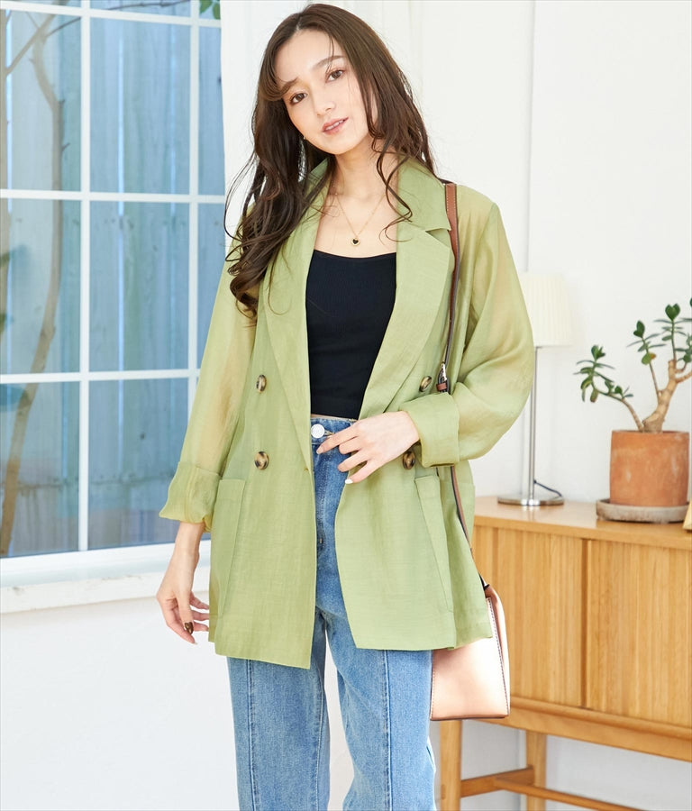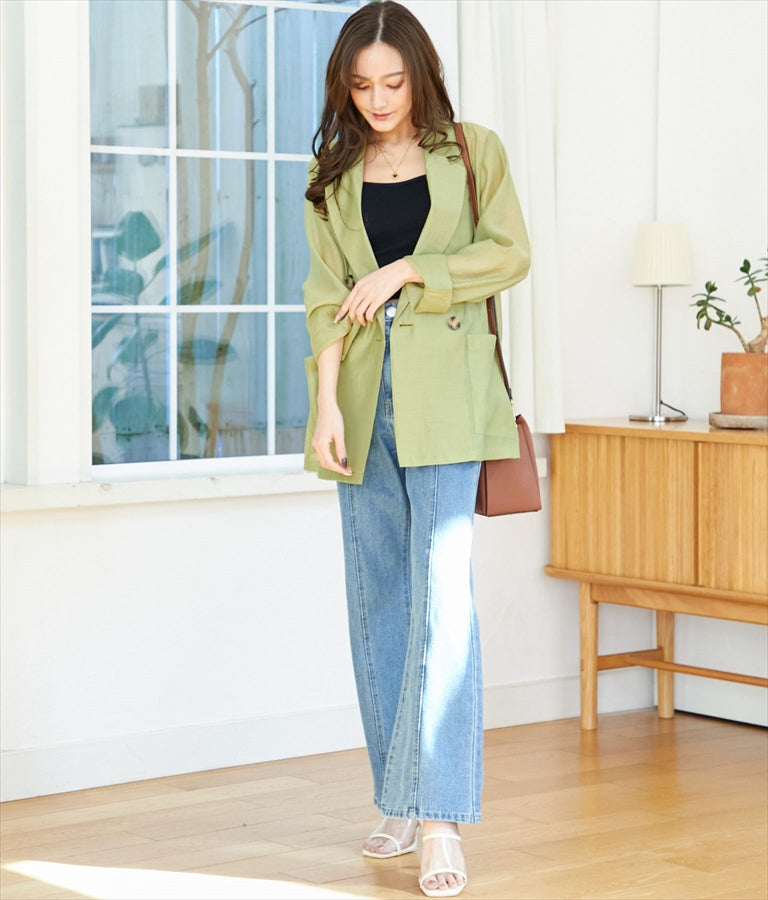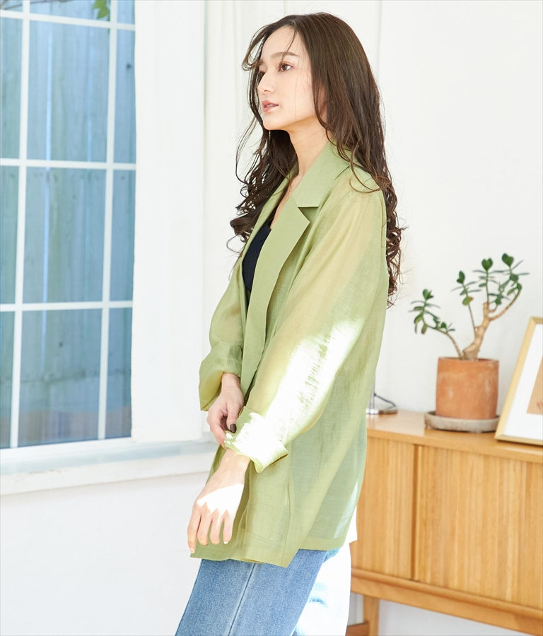 シアー素材で柔らかい印象になり、テーラードジャケットでもかっちりしすぎず着こなせます。