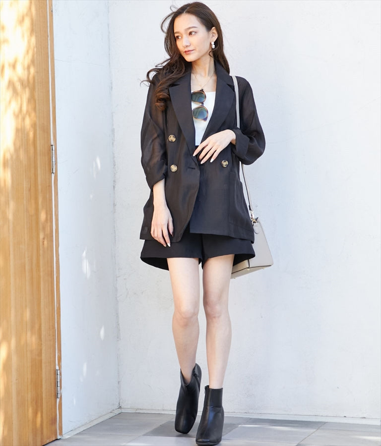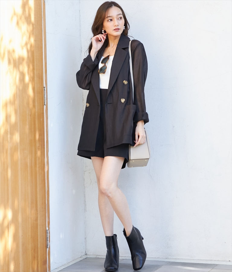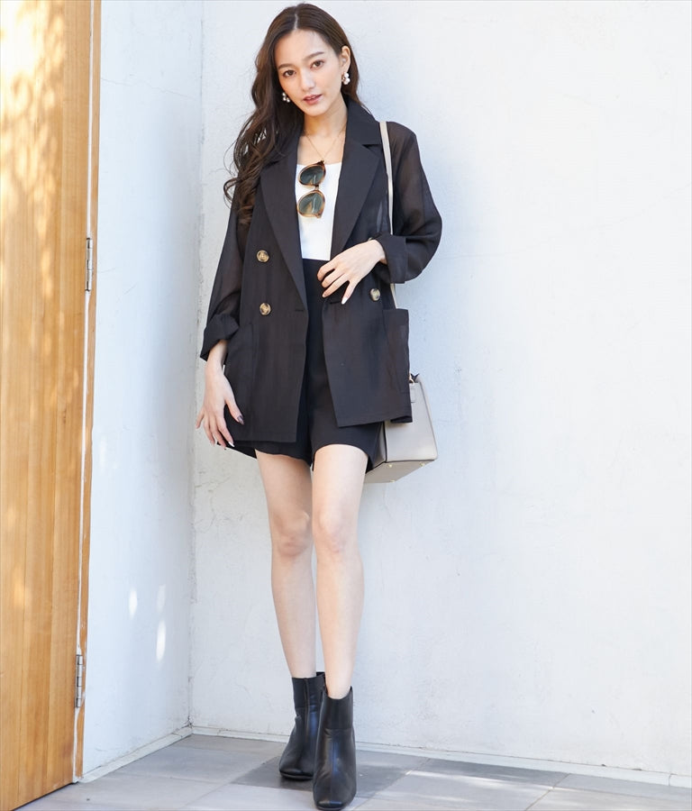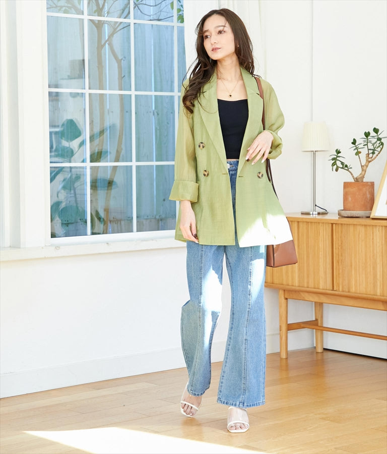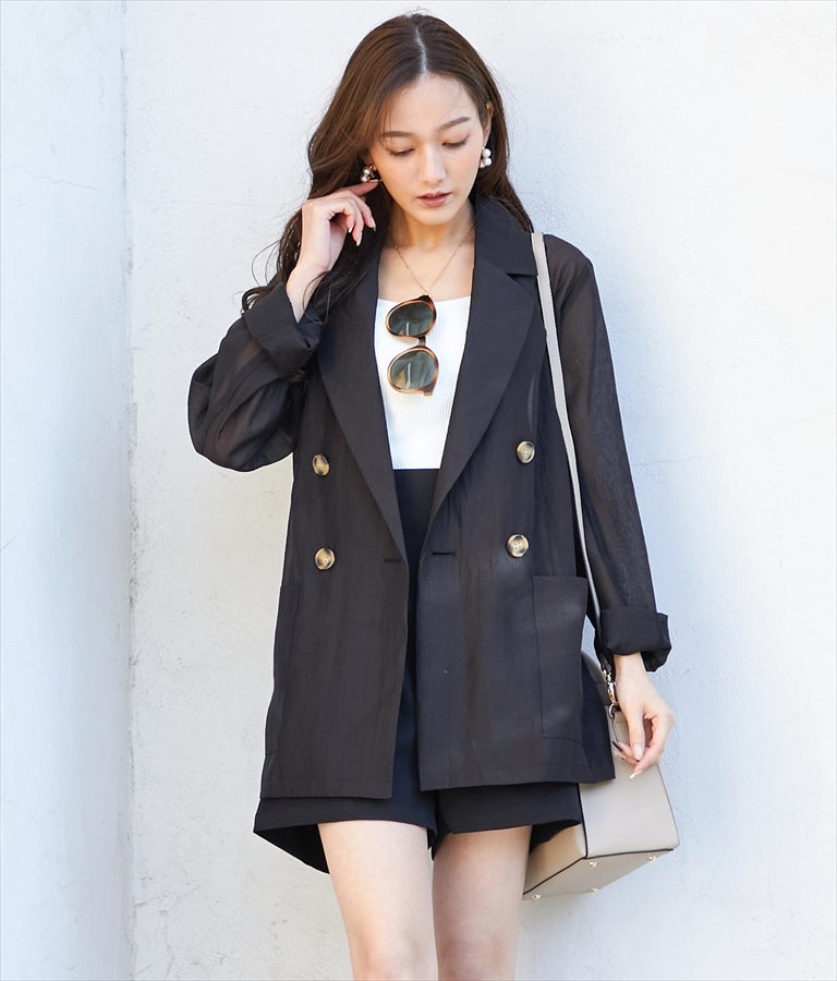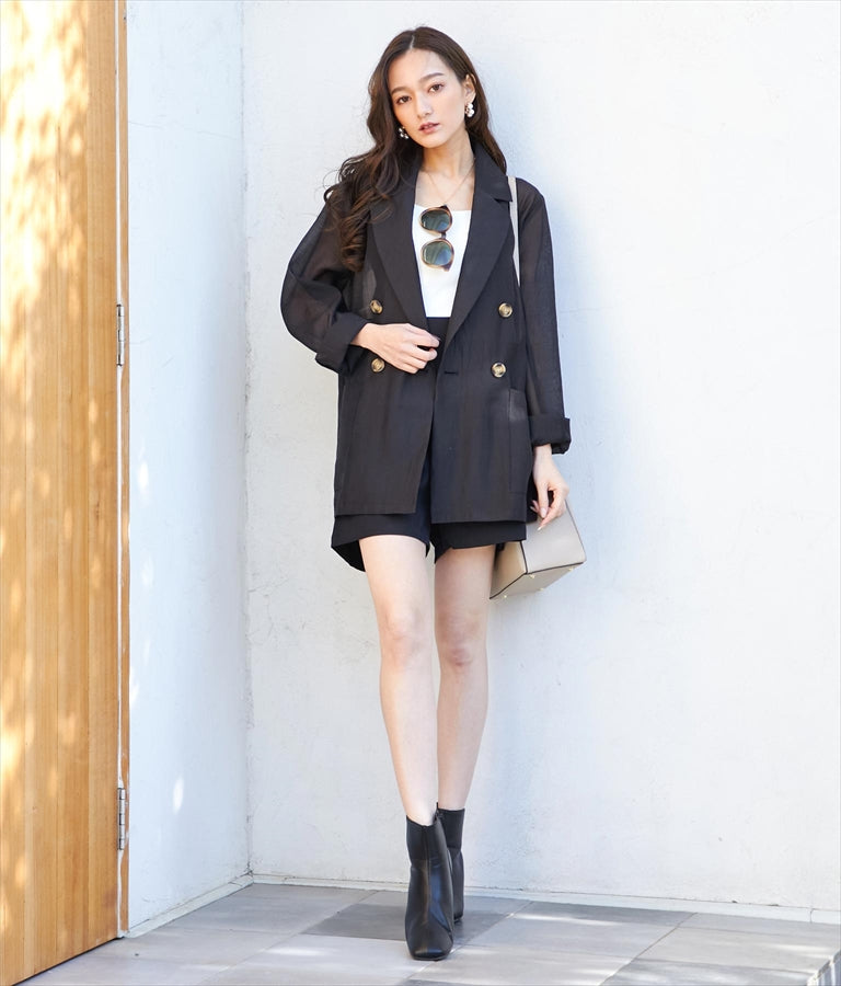 シアー素材で柔らかい印象になり、テーラードジャケットでもかっちりしすぎず着こなせます。