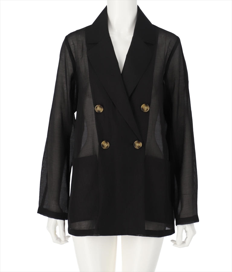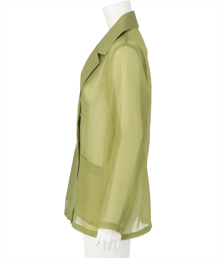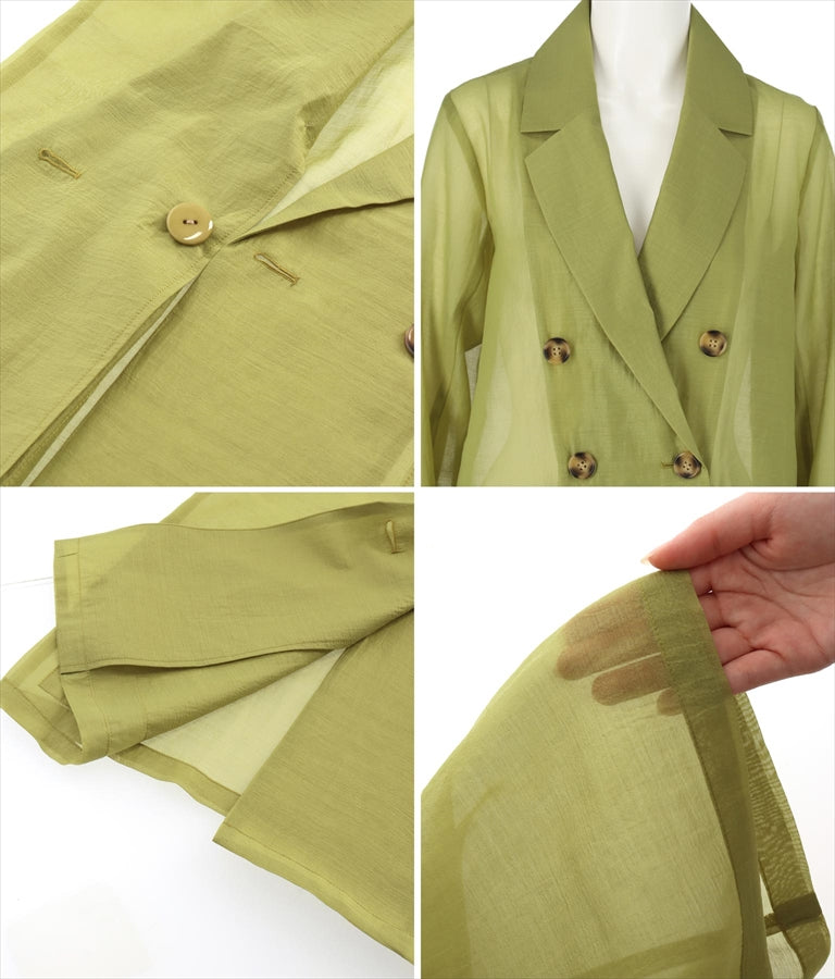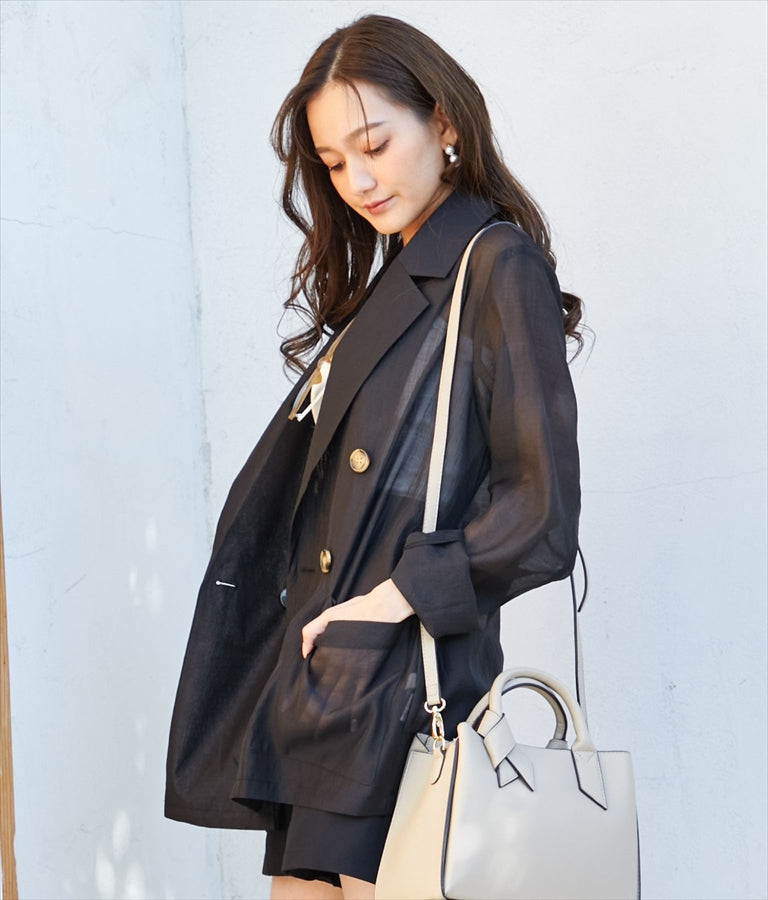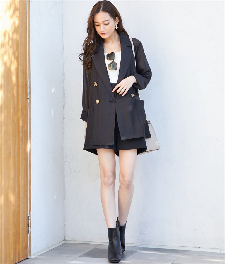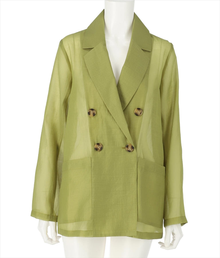 シアー素材で柔らかい印象になり、テーラードジャケットでもかっちりしすぎず着こなせます。