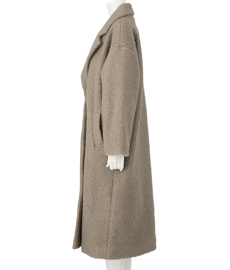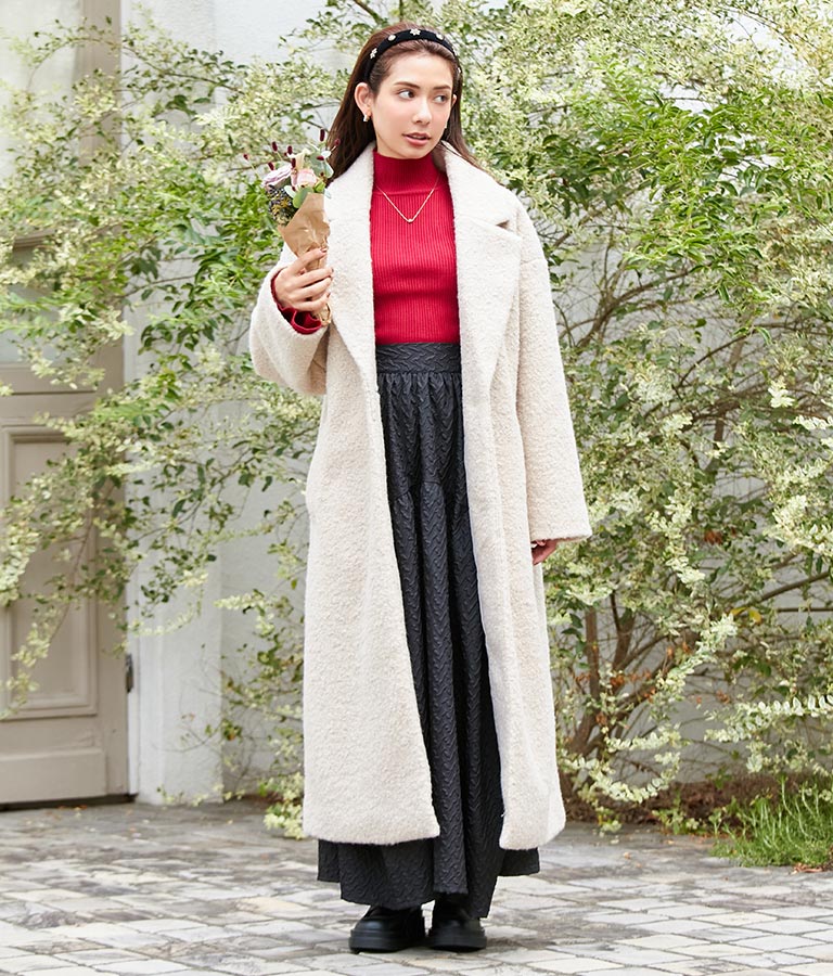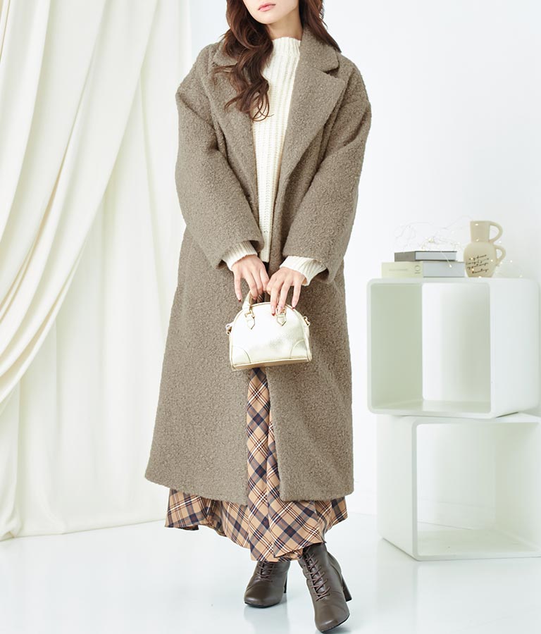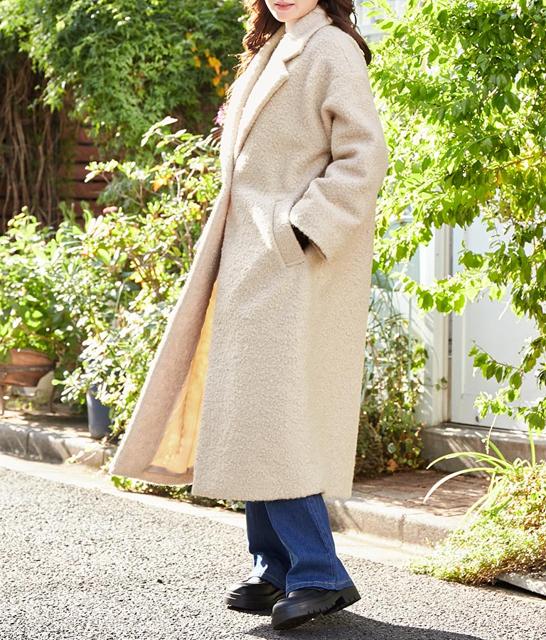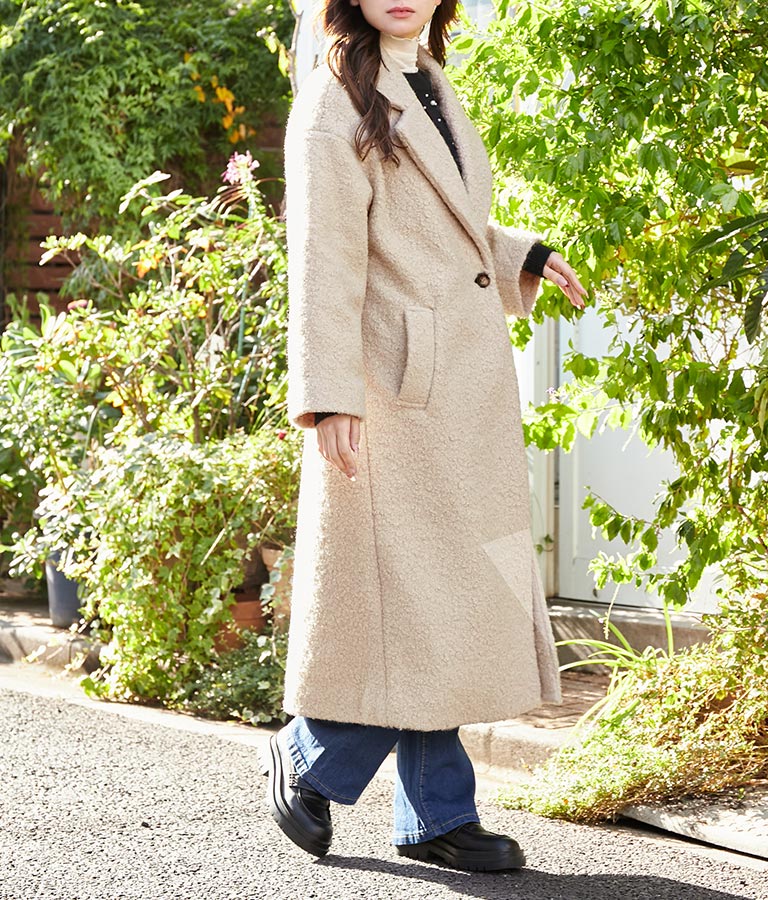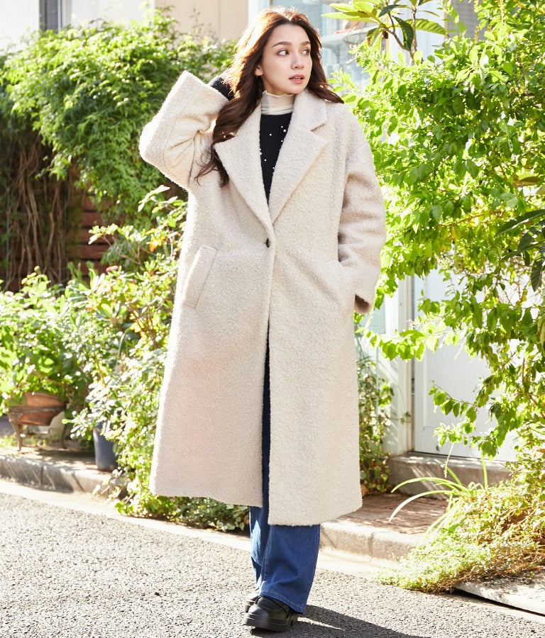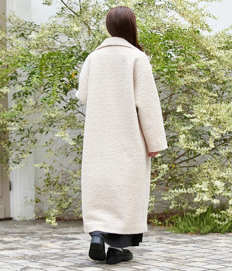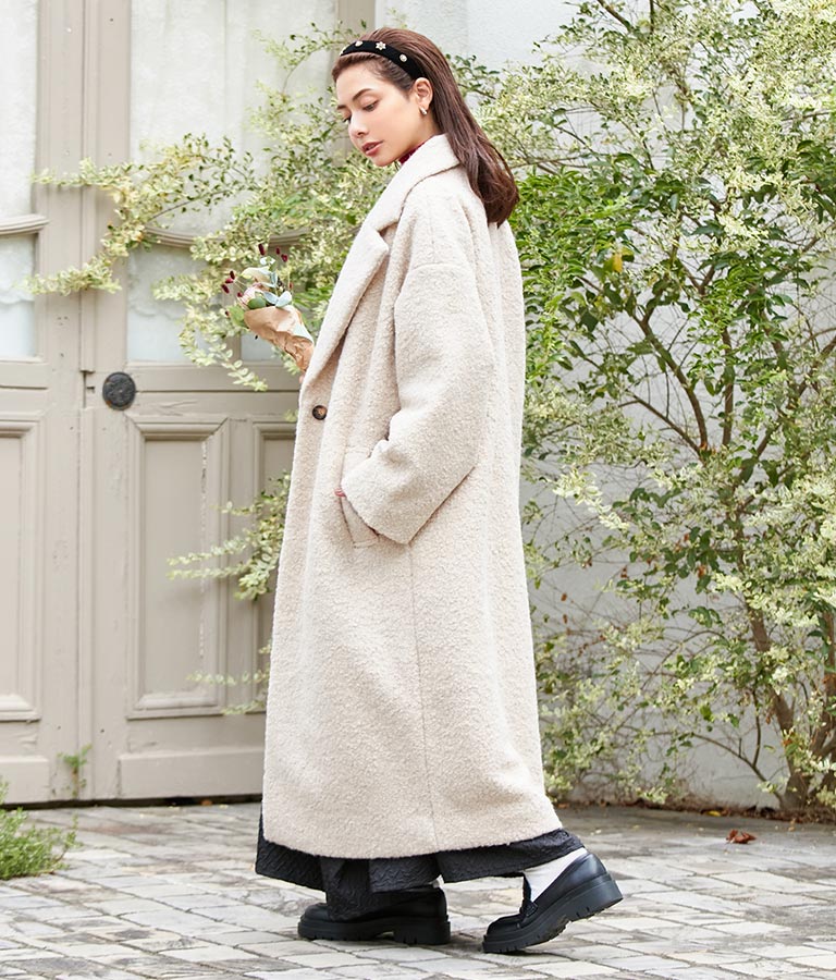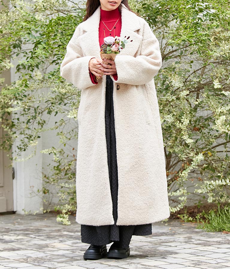 リングボアのふっくらしたシルエットがかわいいテーラードロングコート。