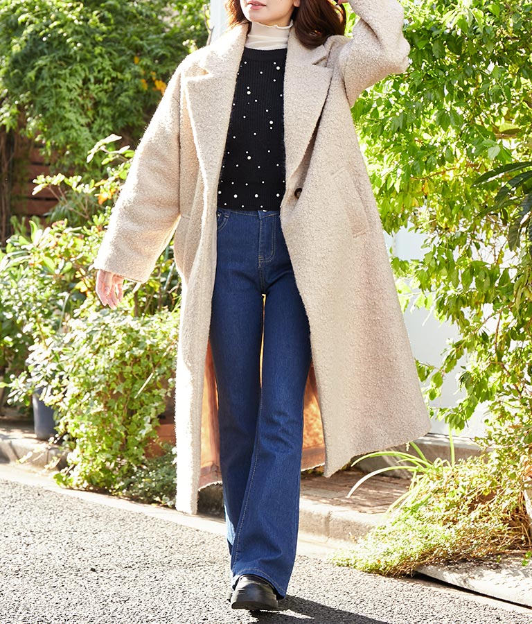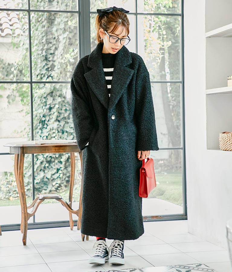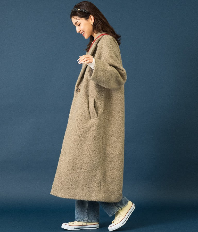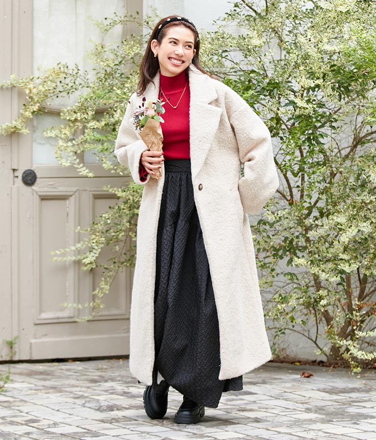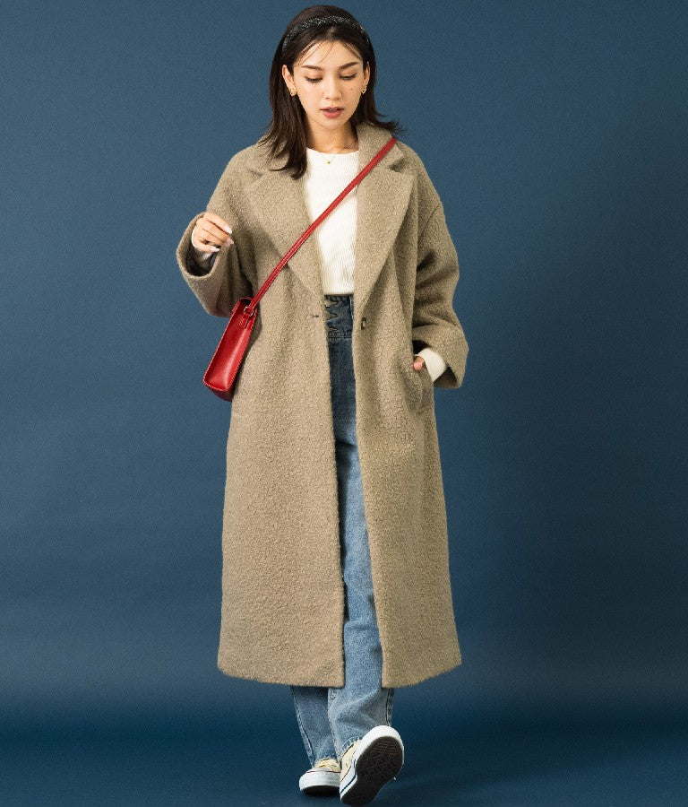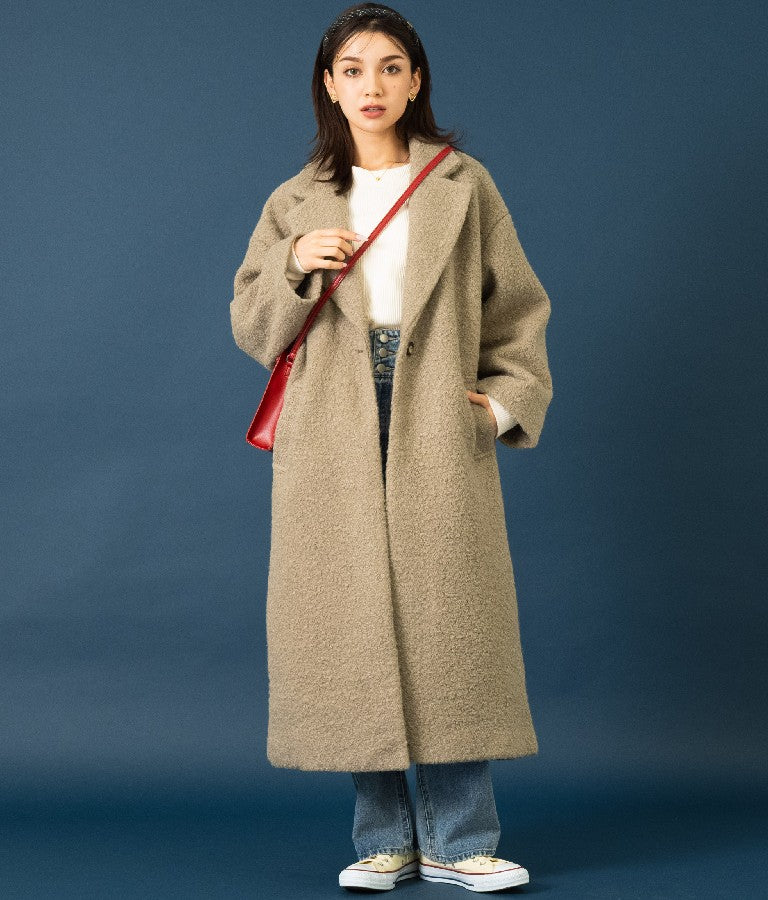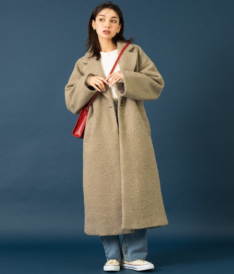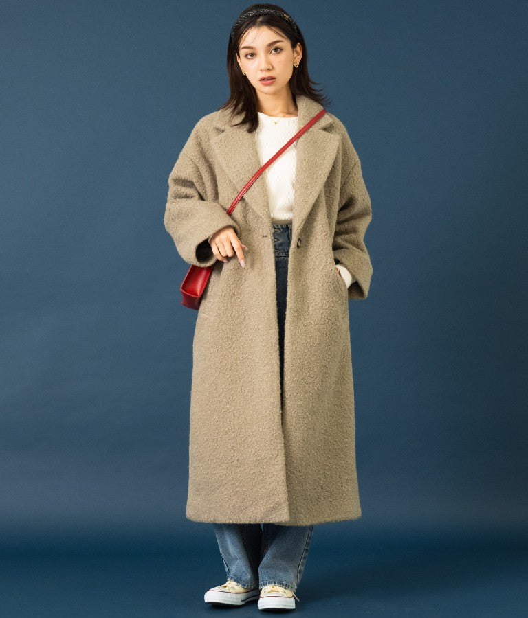 リングボアのふっくらしたシルエットがかわいいテーラードロングコート。