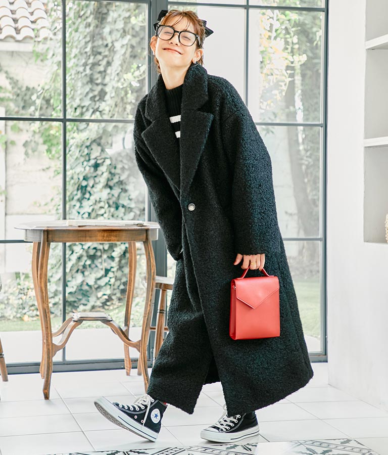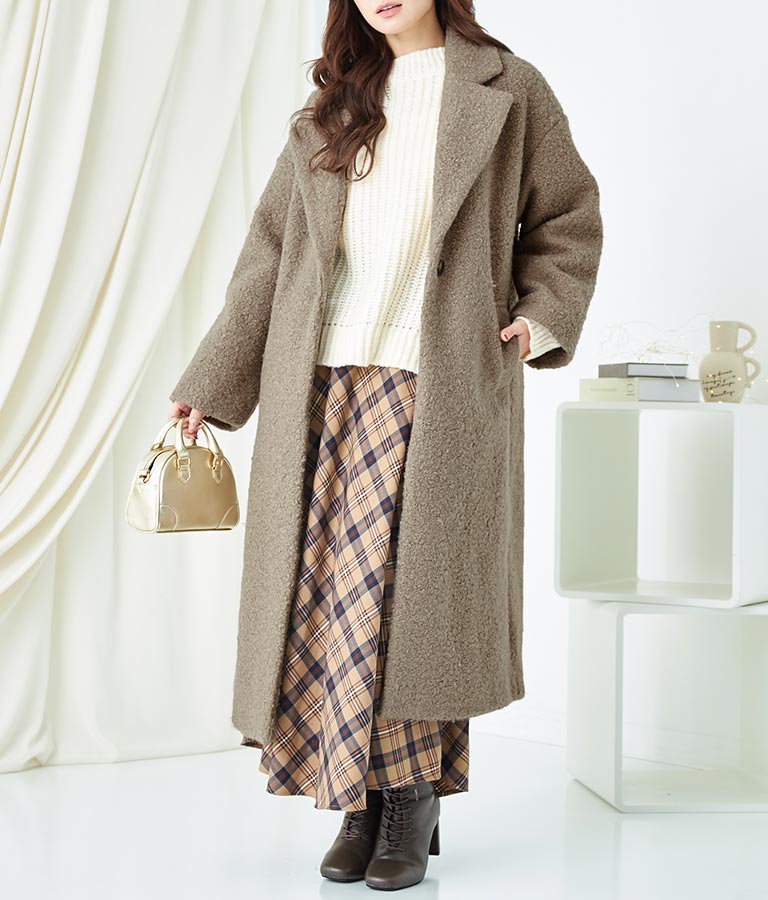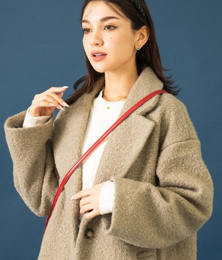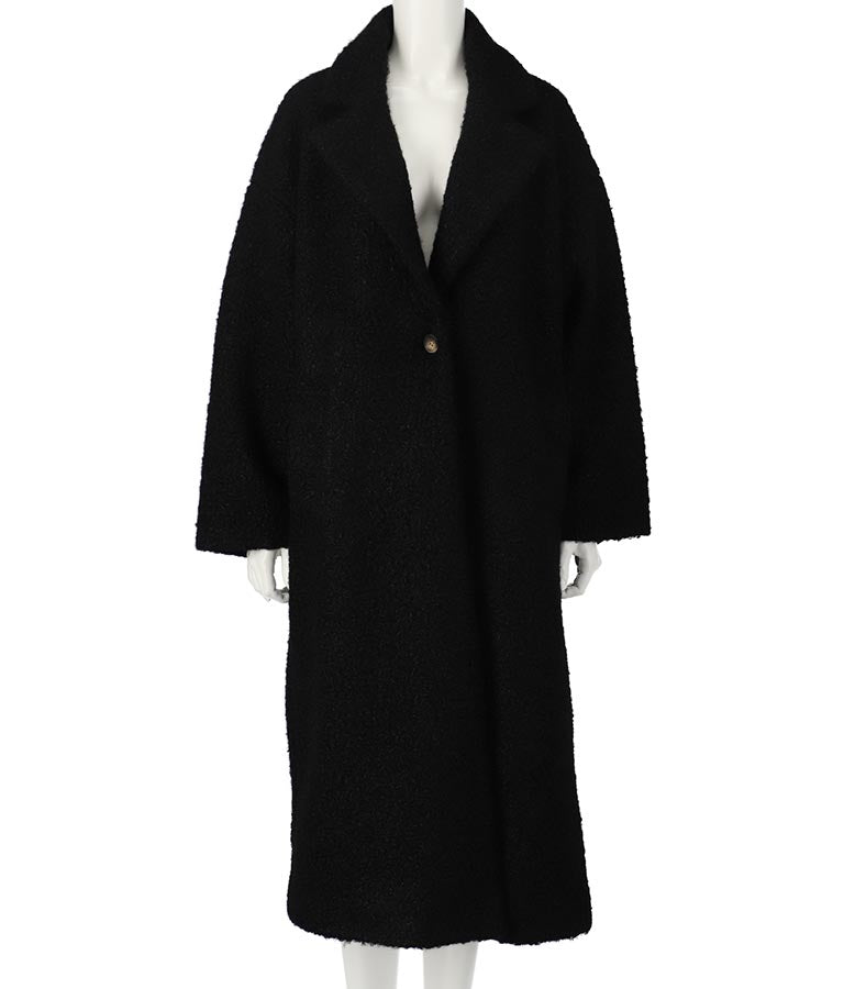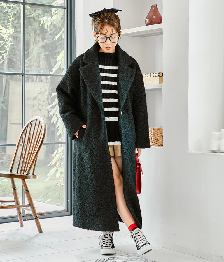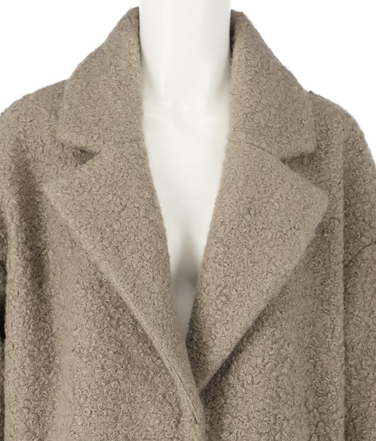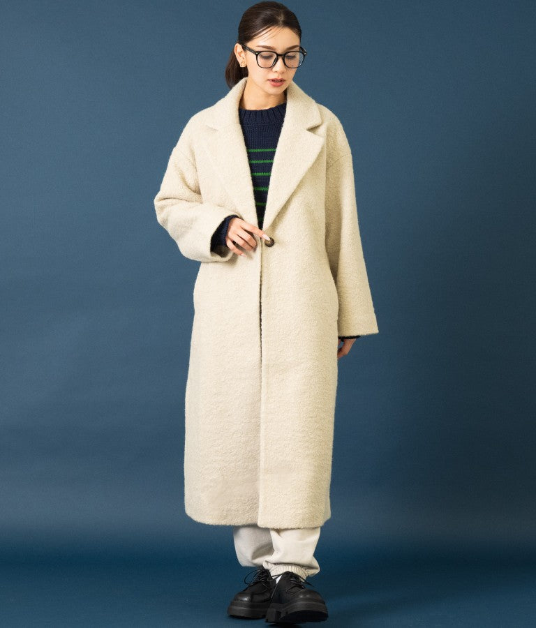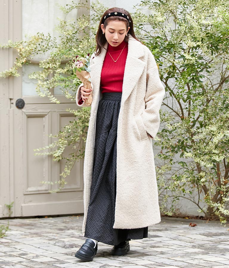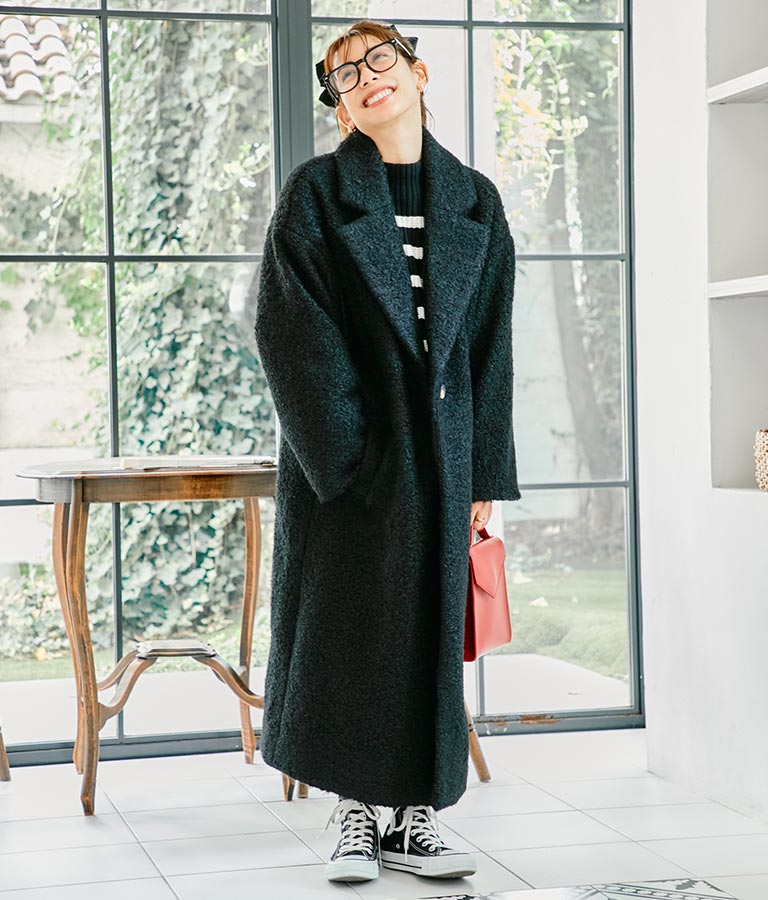 リングボアのふっくらしたシルエットがかわいいテーラードロングコート。