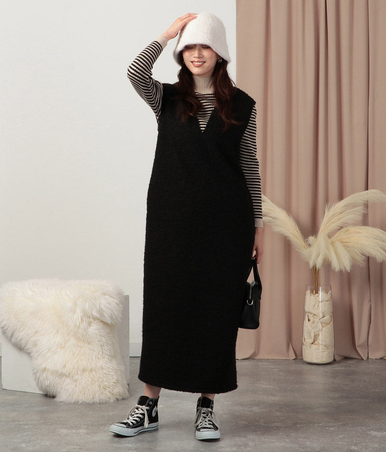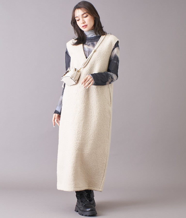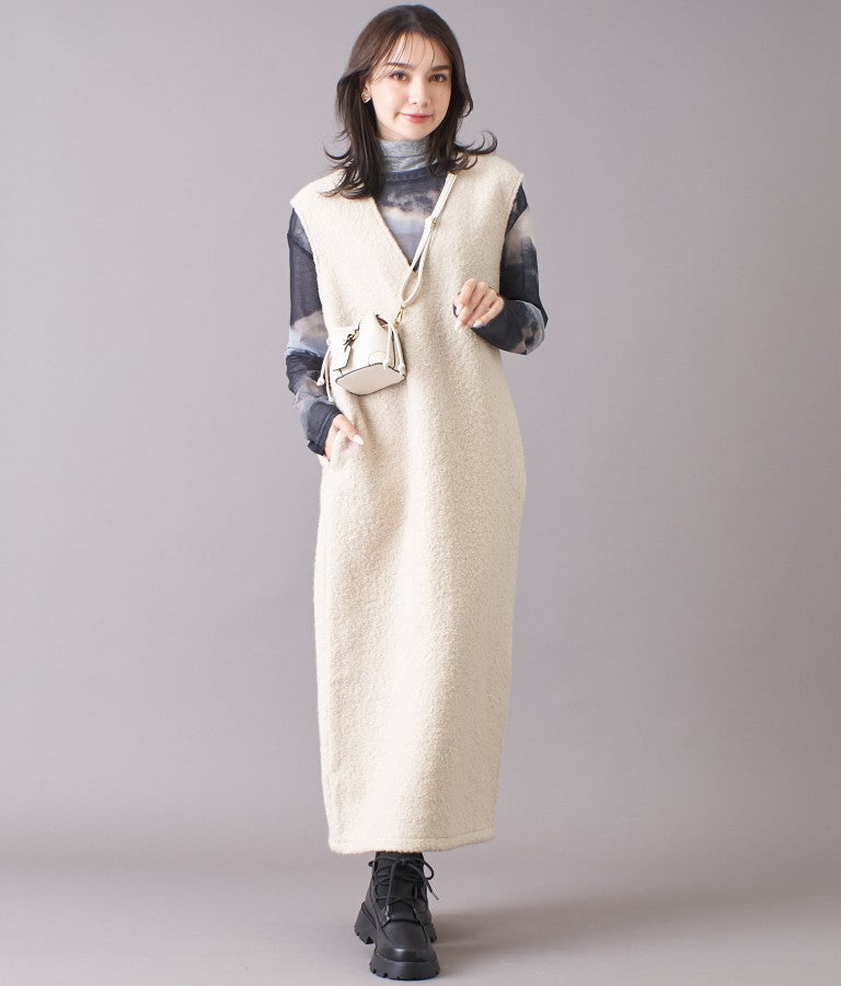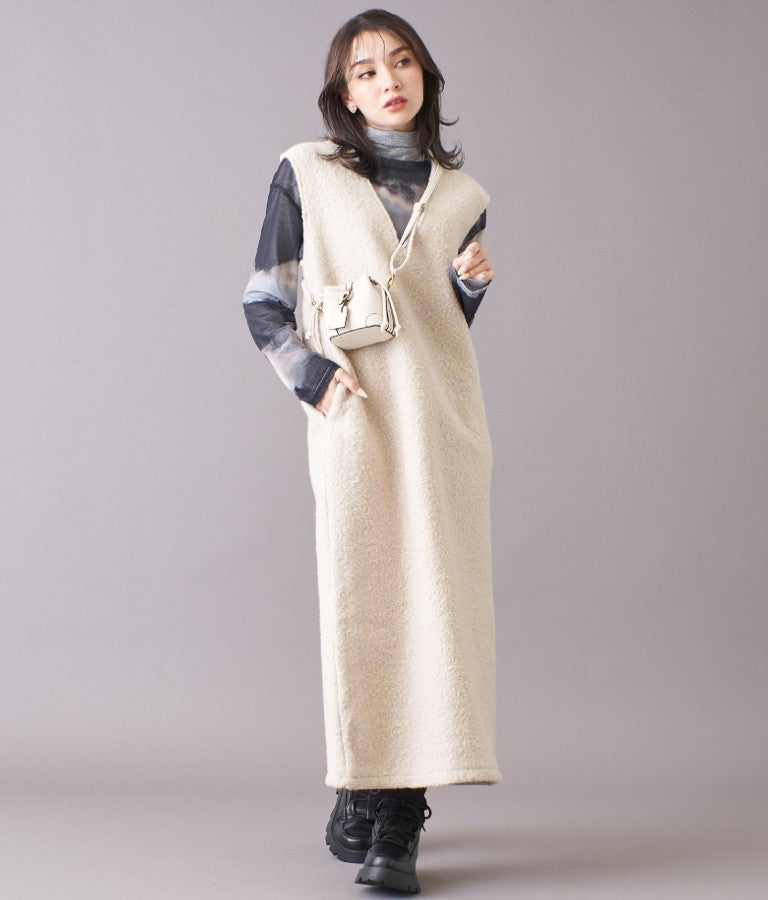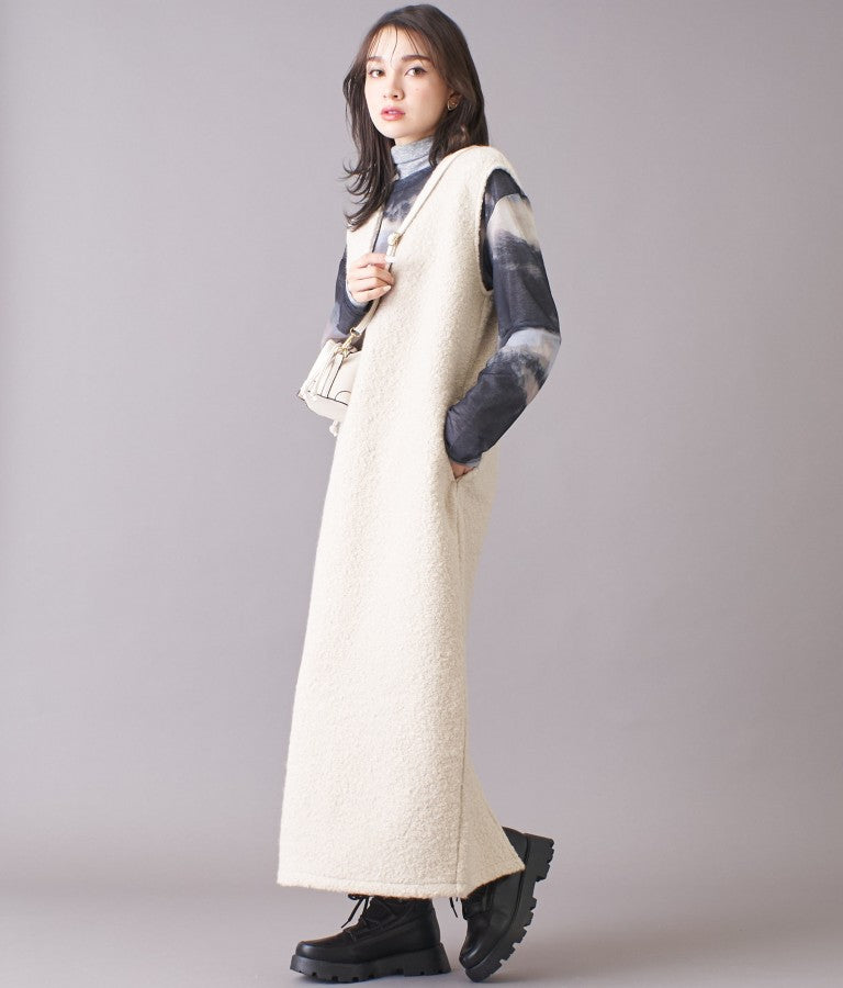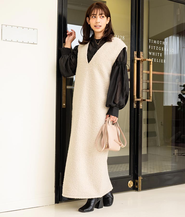 もこもこのリングボアが暖かくかわいらしい雰囲気のジャンパーワンピース。