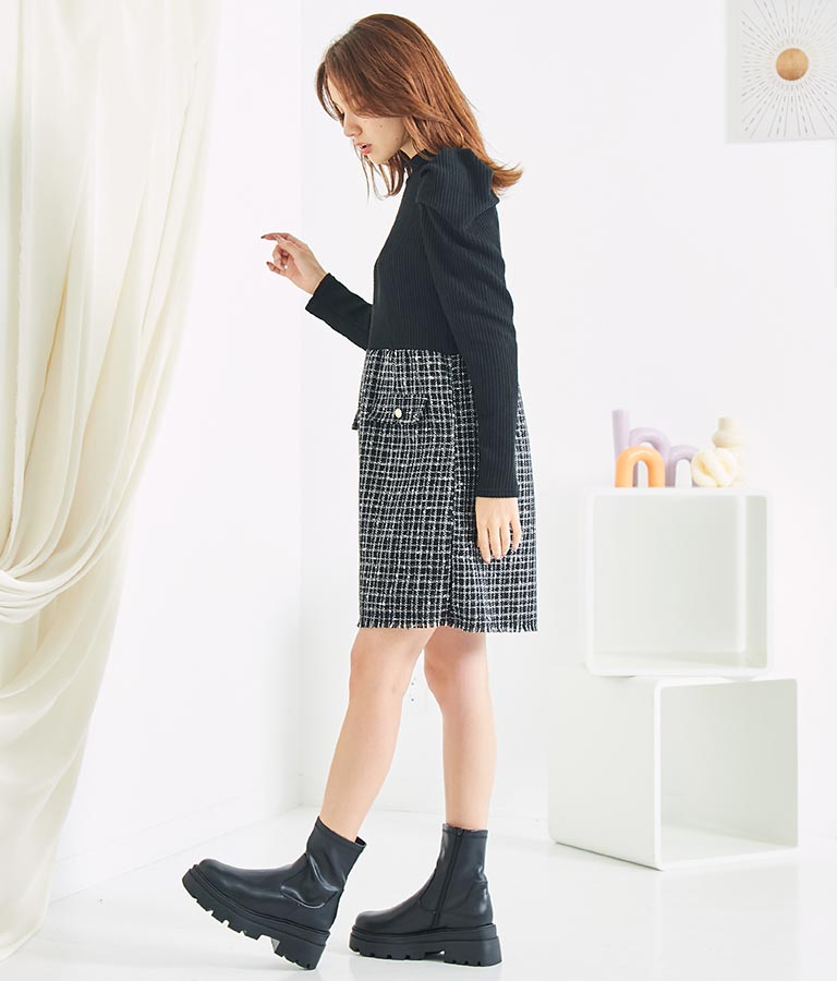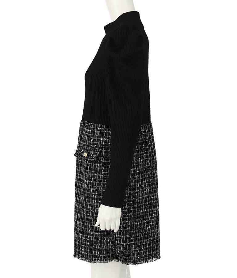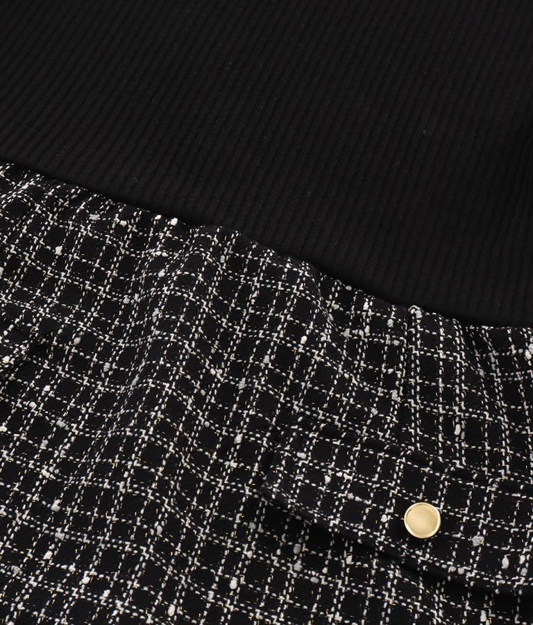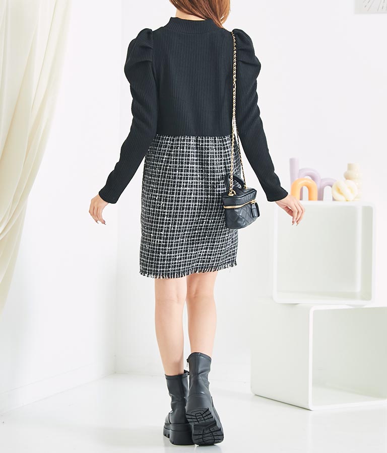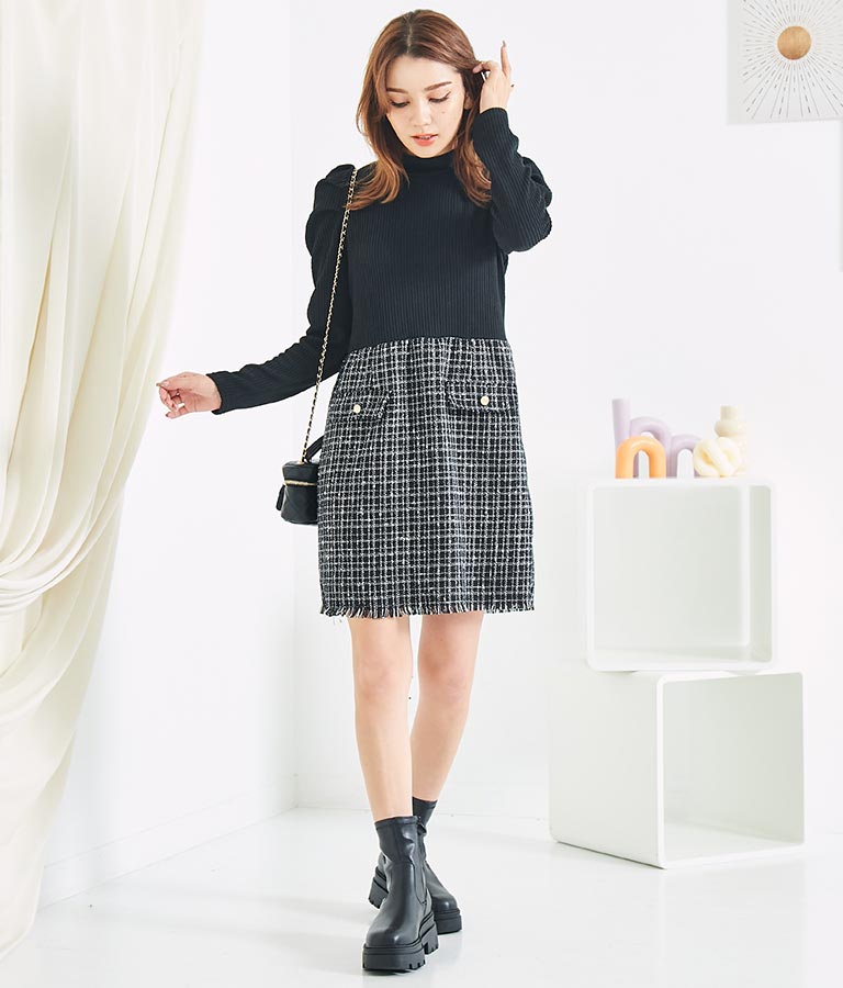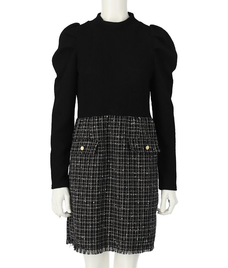 リブニットトップスとツイードスカートを合わせたコーデ風のデザインで、1枚でコーデが完成するミニワンピース。