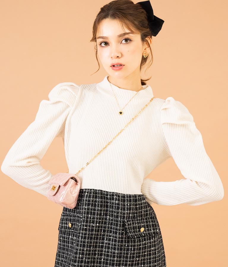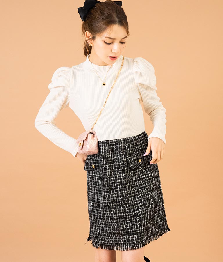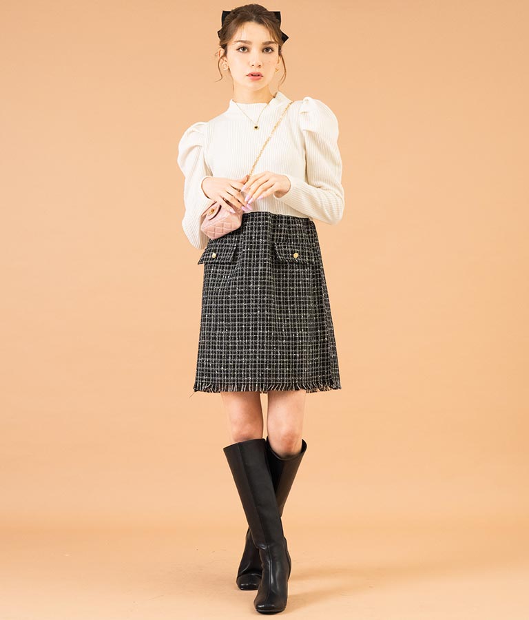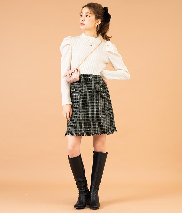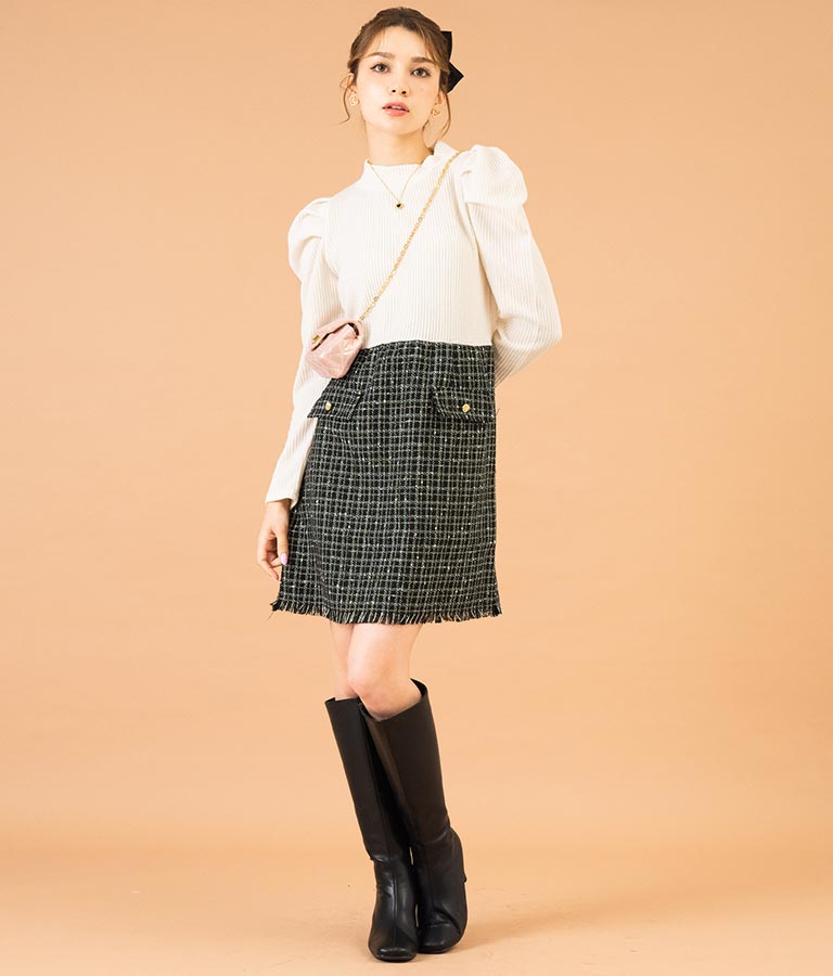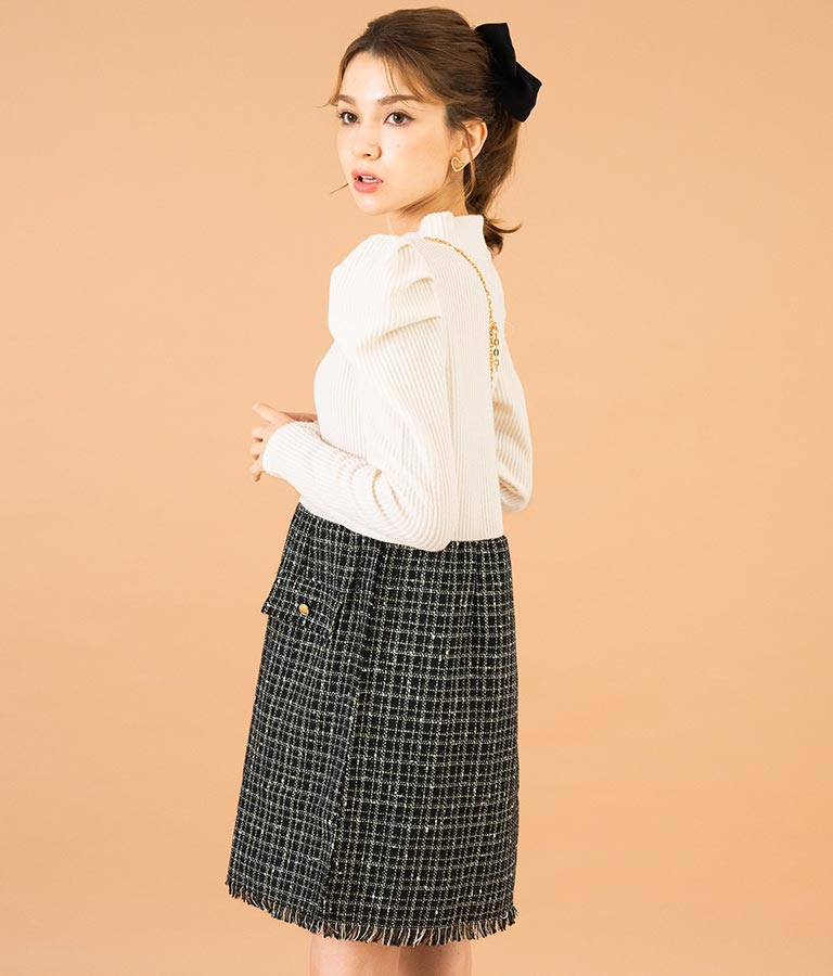 リブニットトップスとツイードスカートを合わせたコーデ風のデザインで、1枚でコーデが完成するミニワンピース。