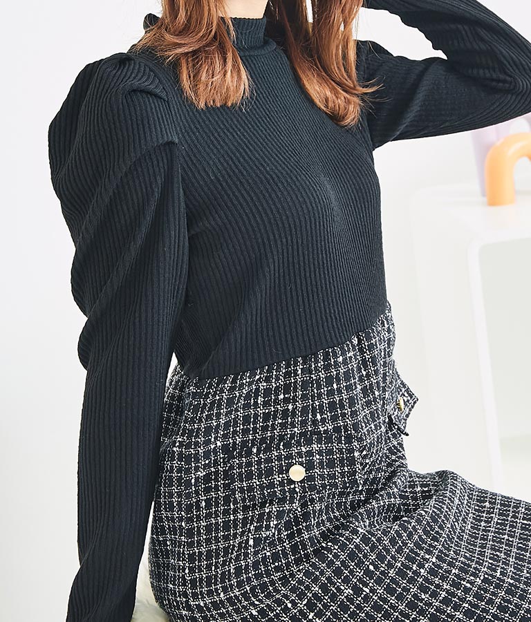 肩のパフスリーブとすとんと落ちるシルエットが女性らしい印象です。