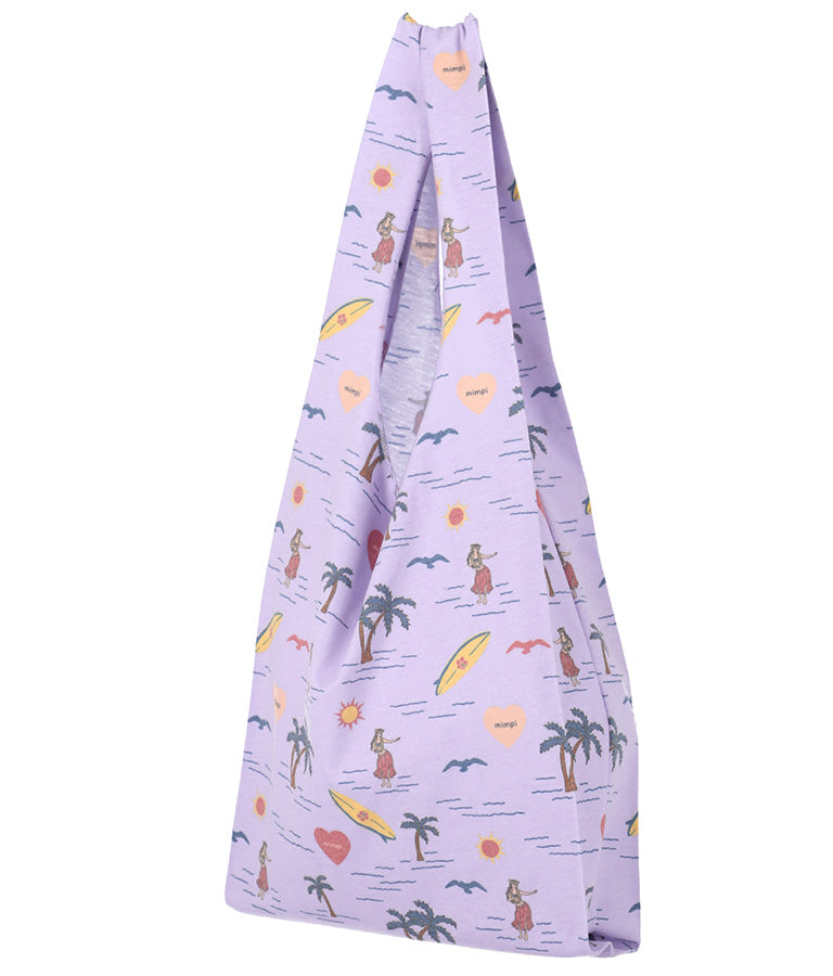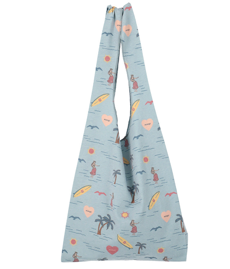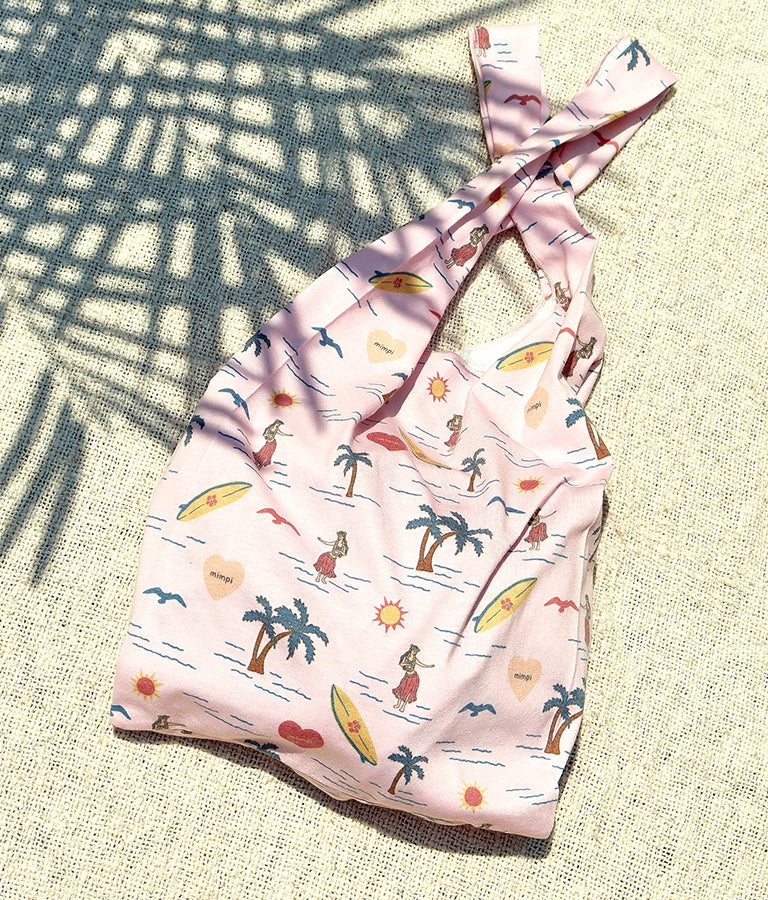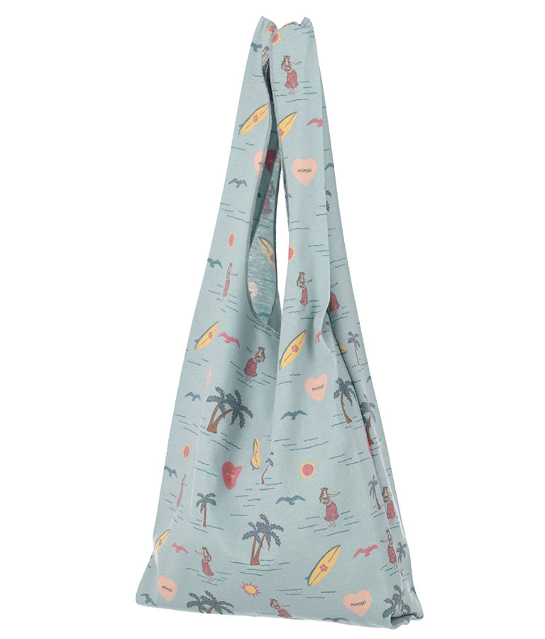 フラガールやサーフボードなど海を感じさせるモチーフを散りばめたパターンが飛び切りキュートなマルシェバッグ。