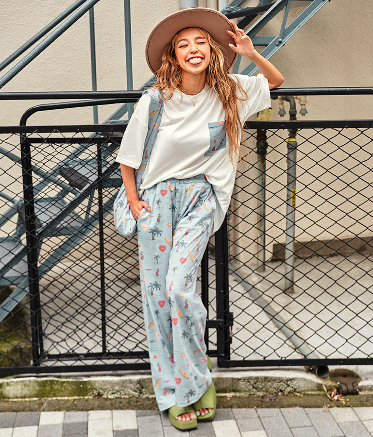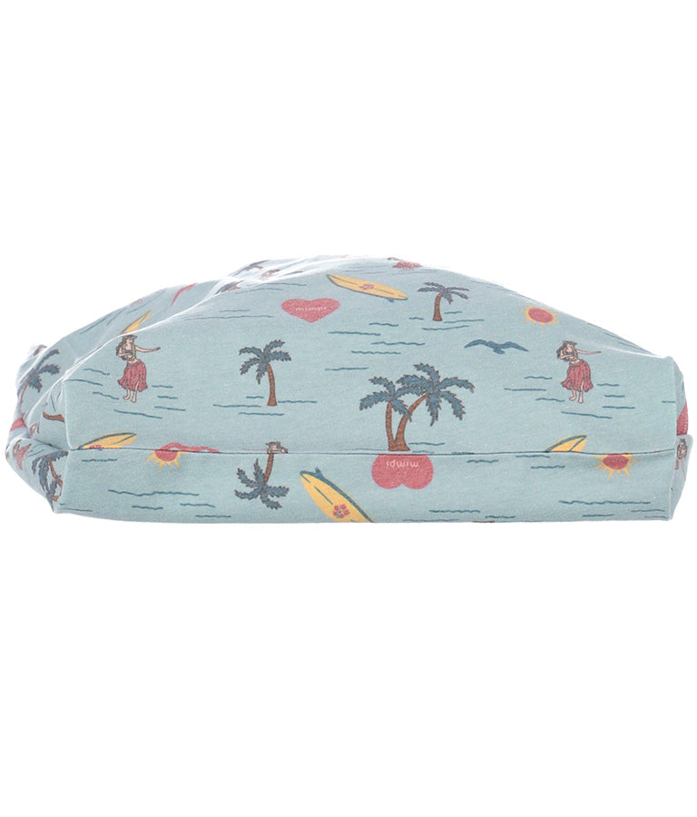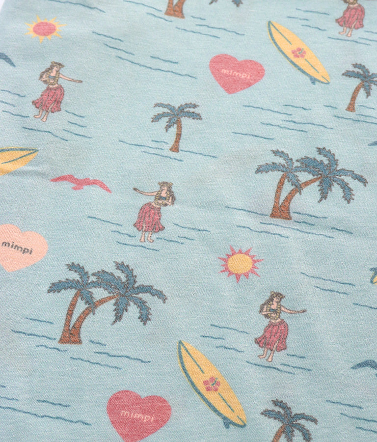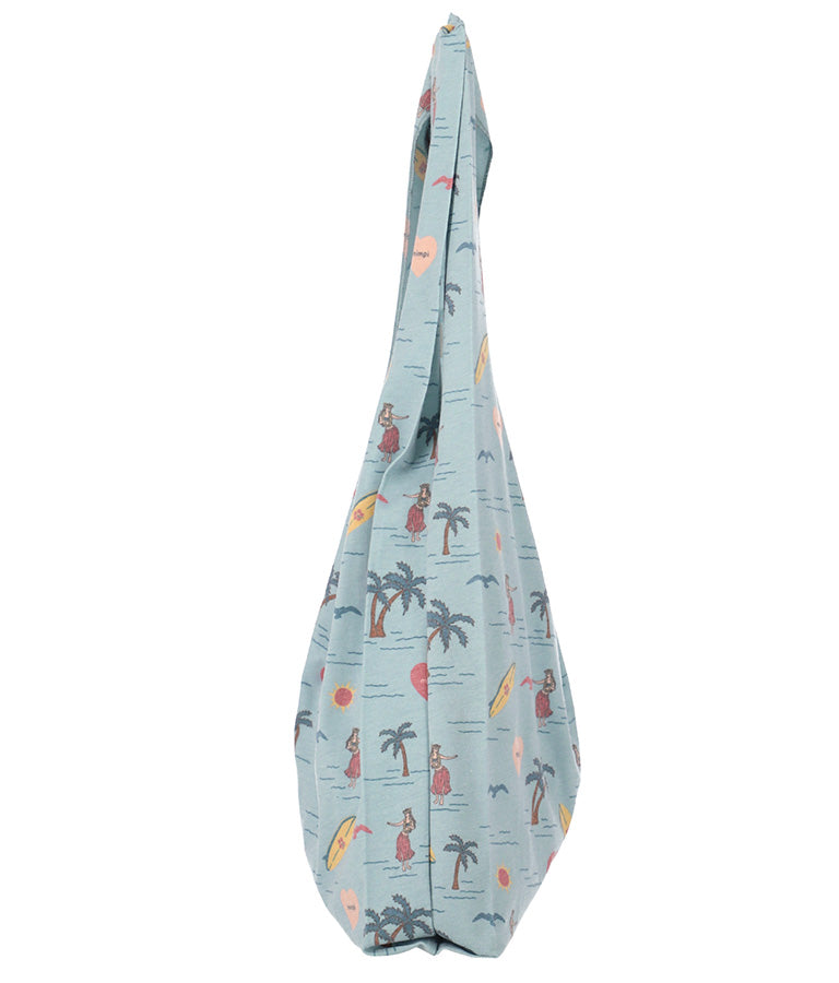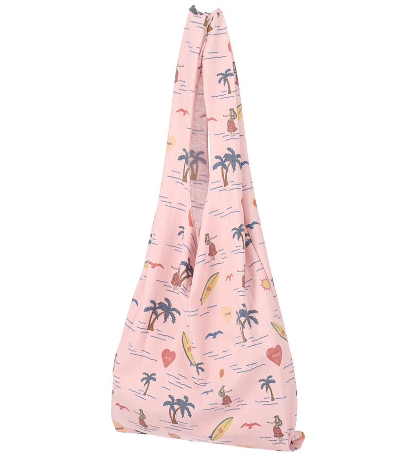 フラガールやサーフボードなど海を感じさせるモチーフを散りばめたパターンが飛び切りキュートなマルシェバッグ。