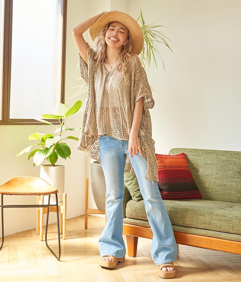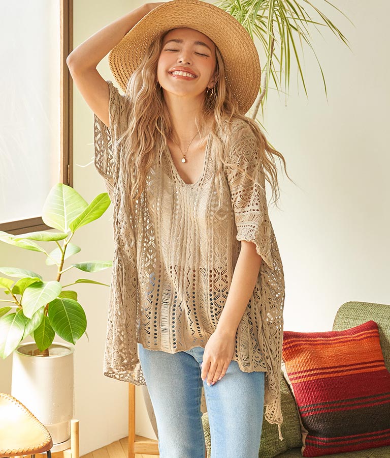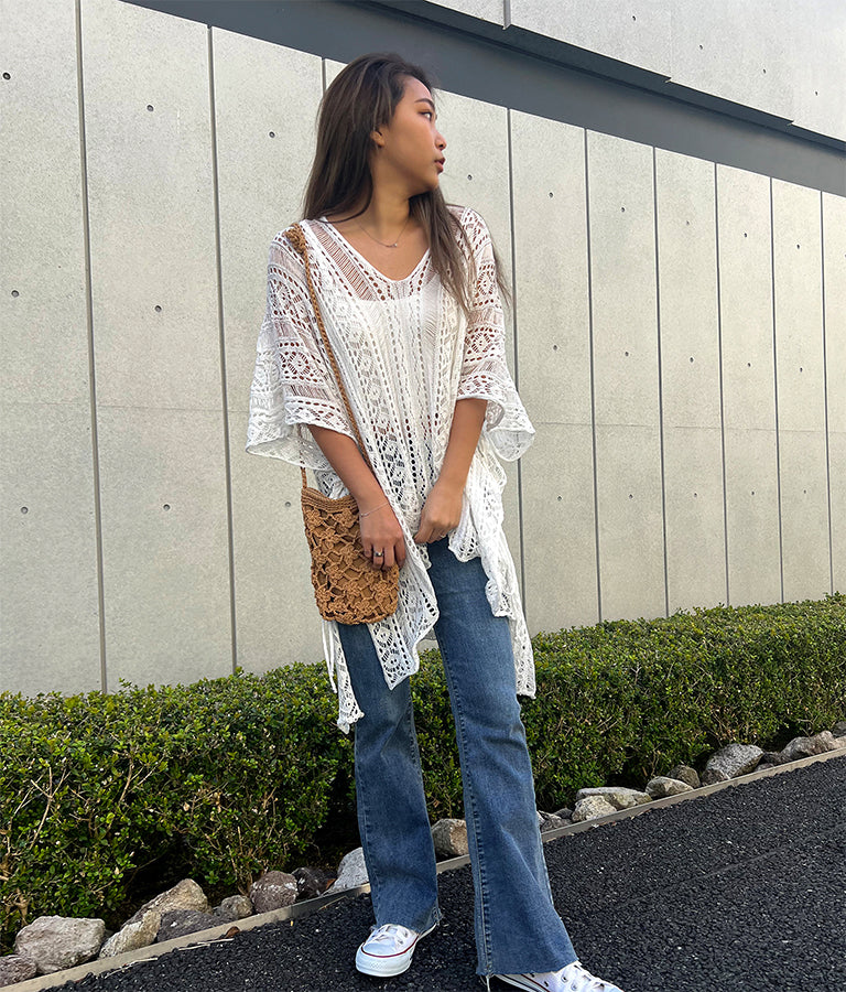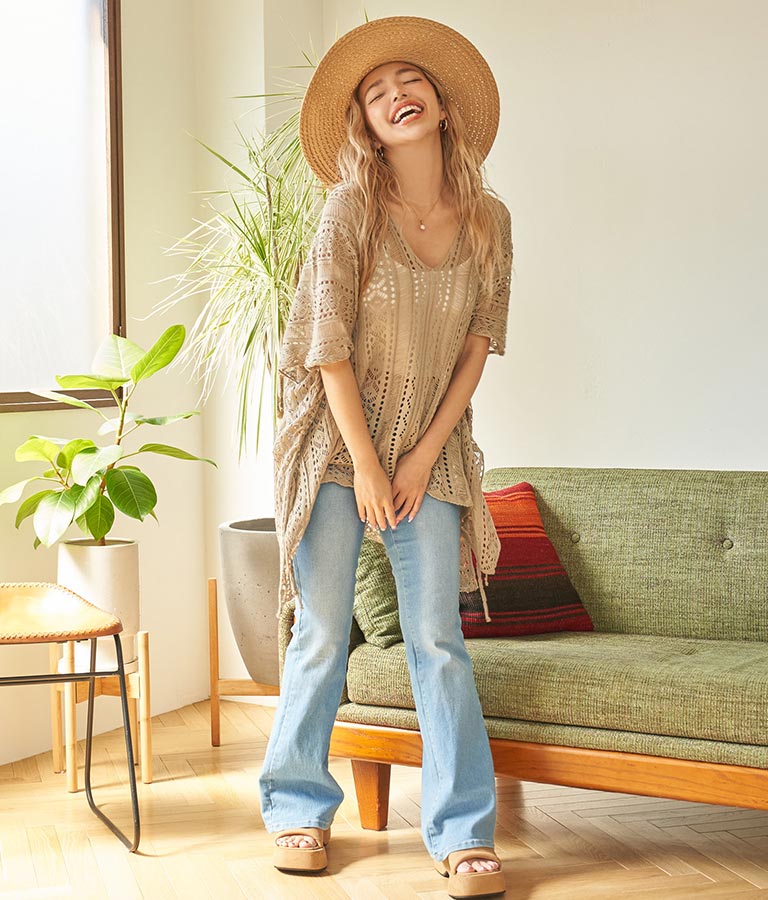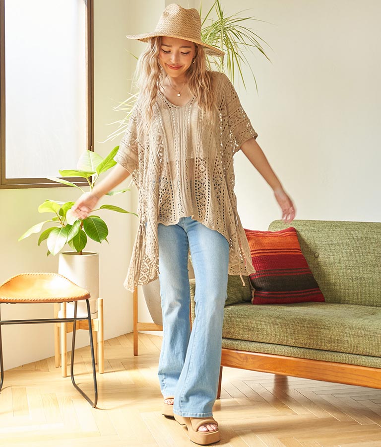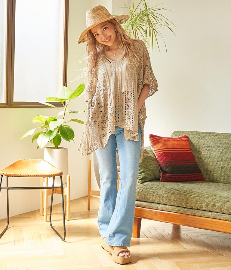 ヘルシーなシアー感が楽しめるクロシェ編みのニットトップス。