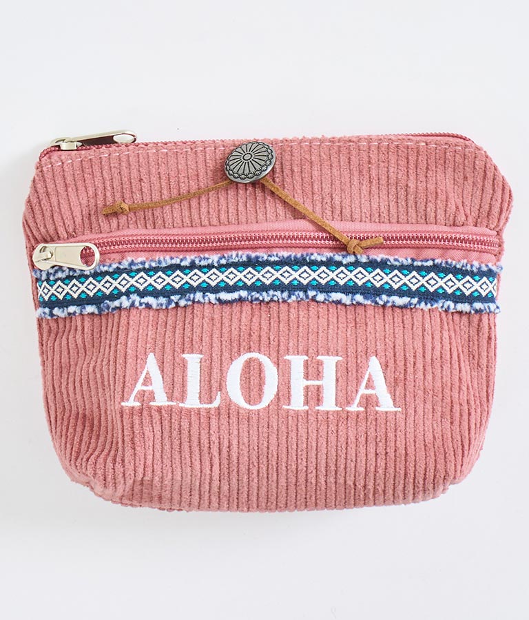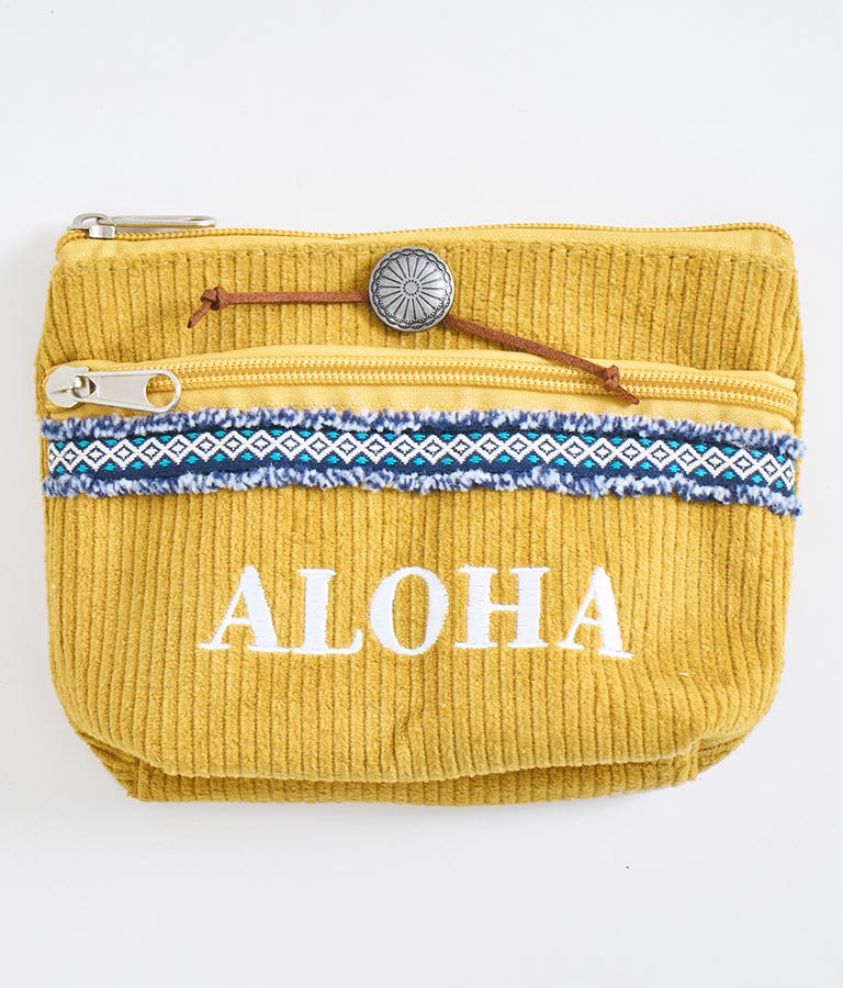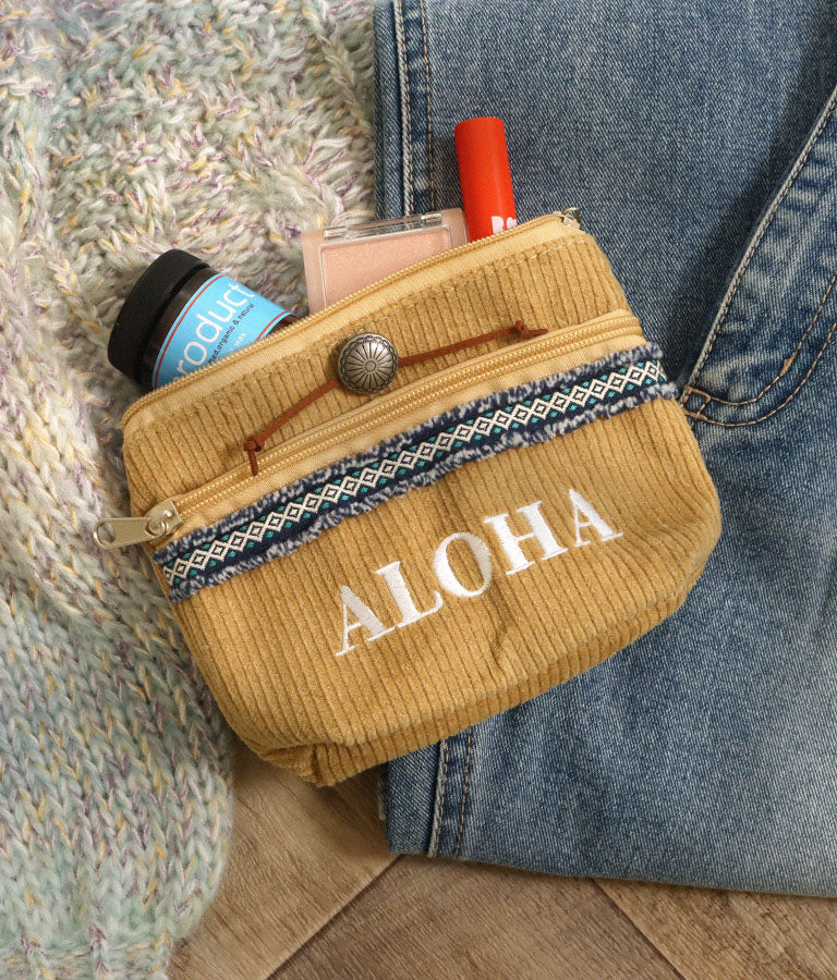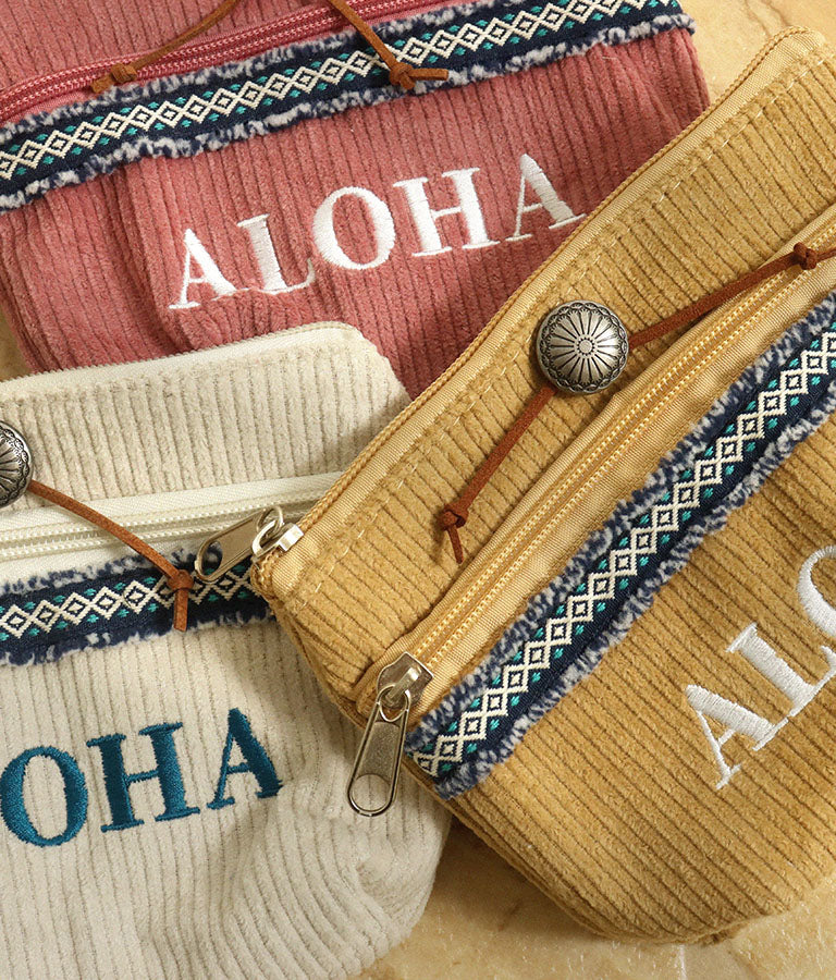 ALOHA刺繍 コンチョ付き コーデュロイ ミニ ポーチ -