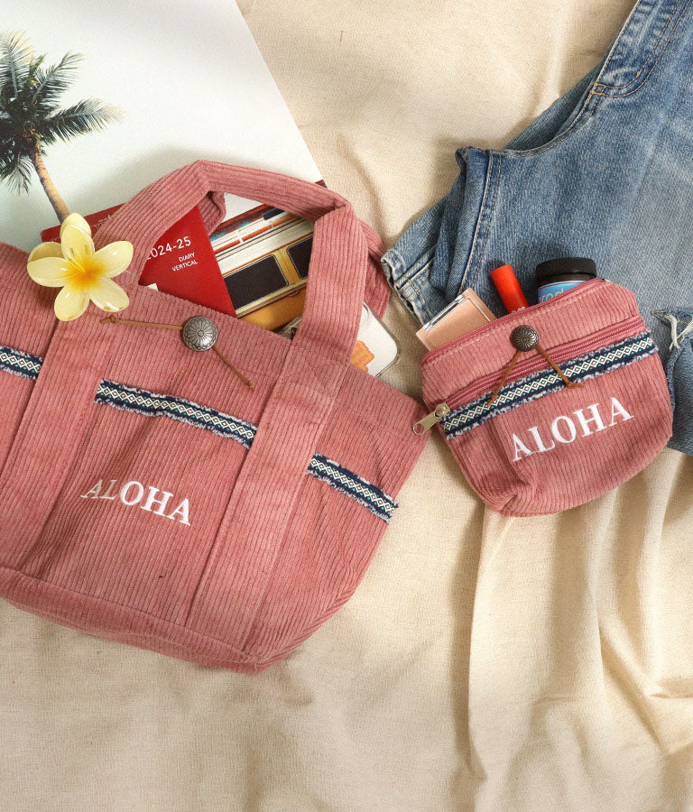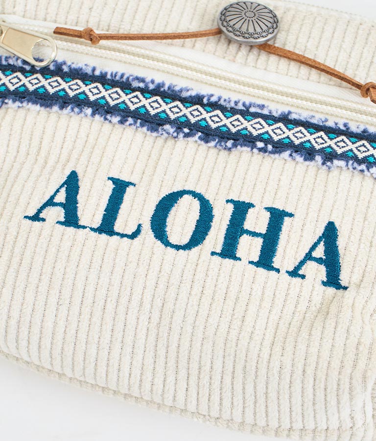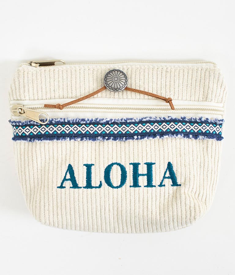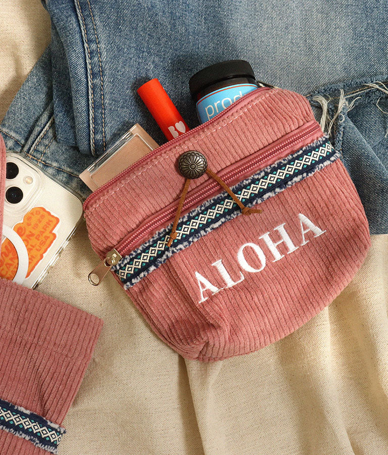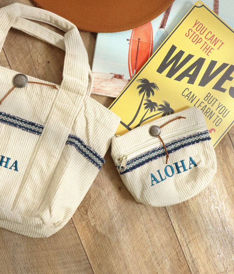 ALOHA刺繍 コンチョ付き コーデュロイ ミニ ポーチ -
