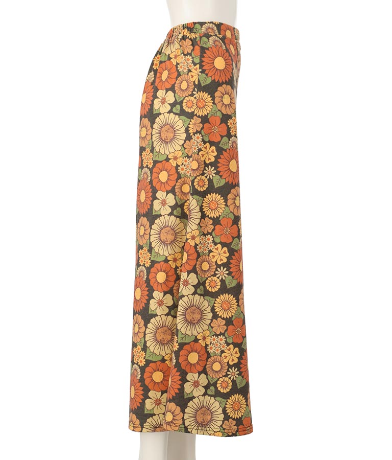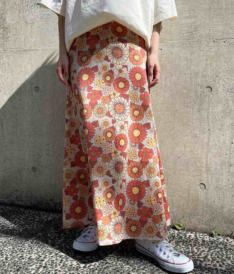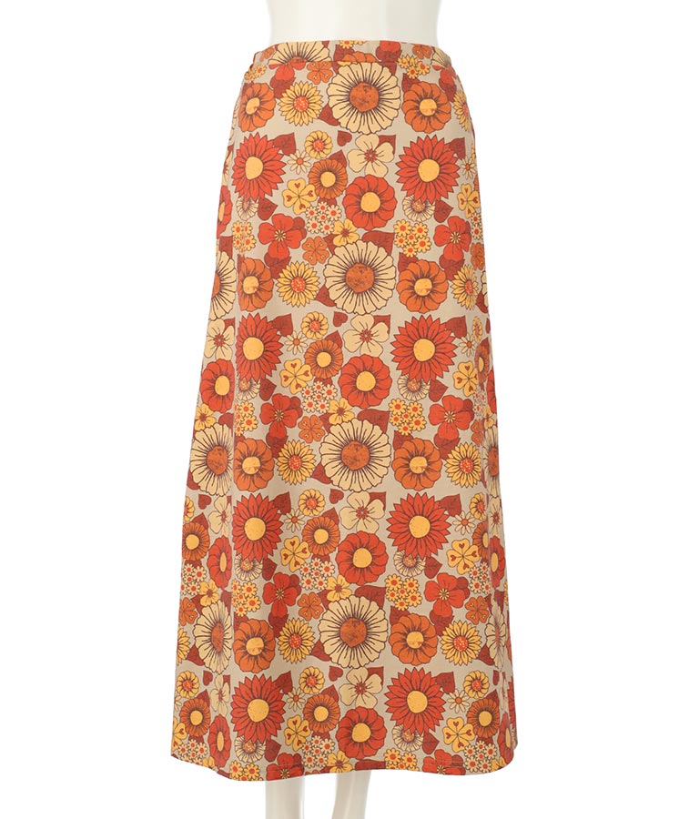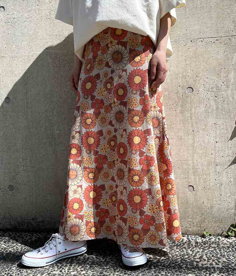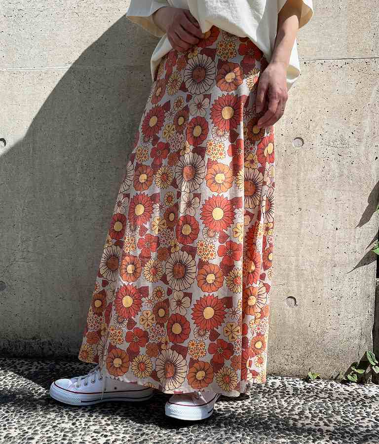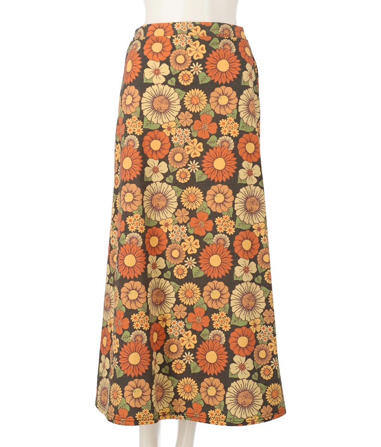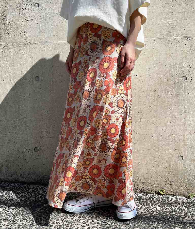 レトロなフラワー柄が目を引くセミフレアスカート。