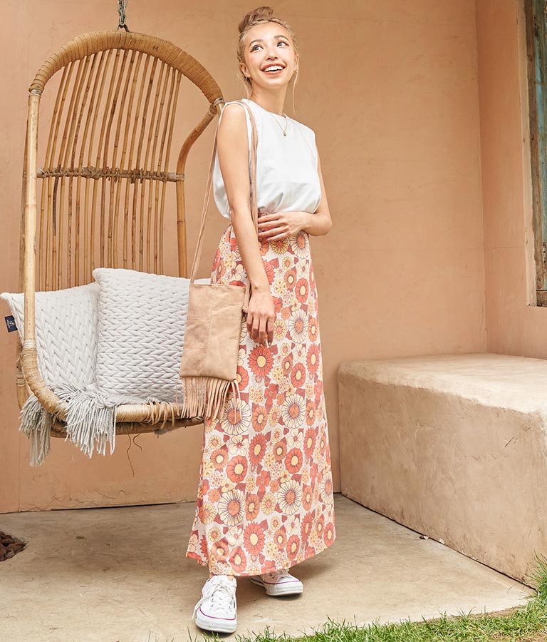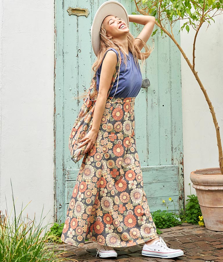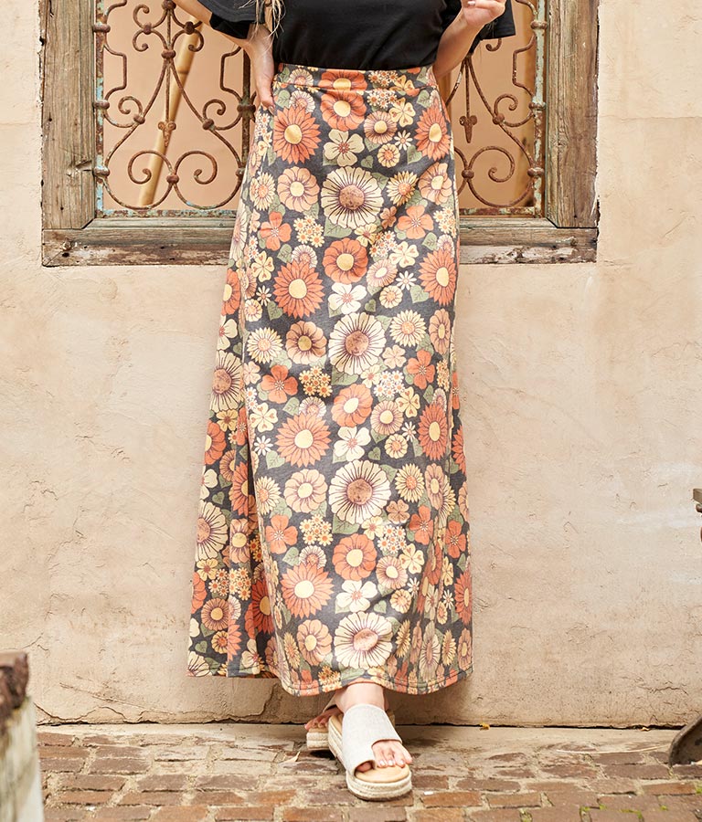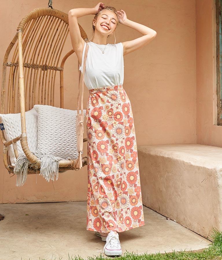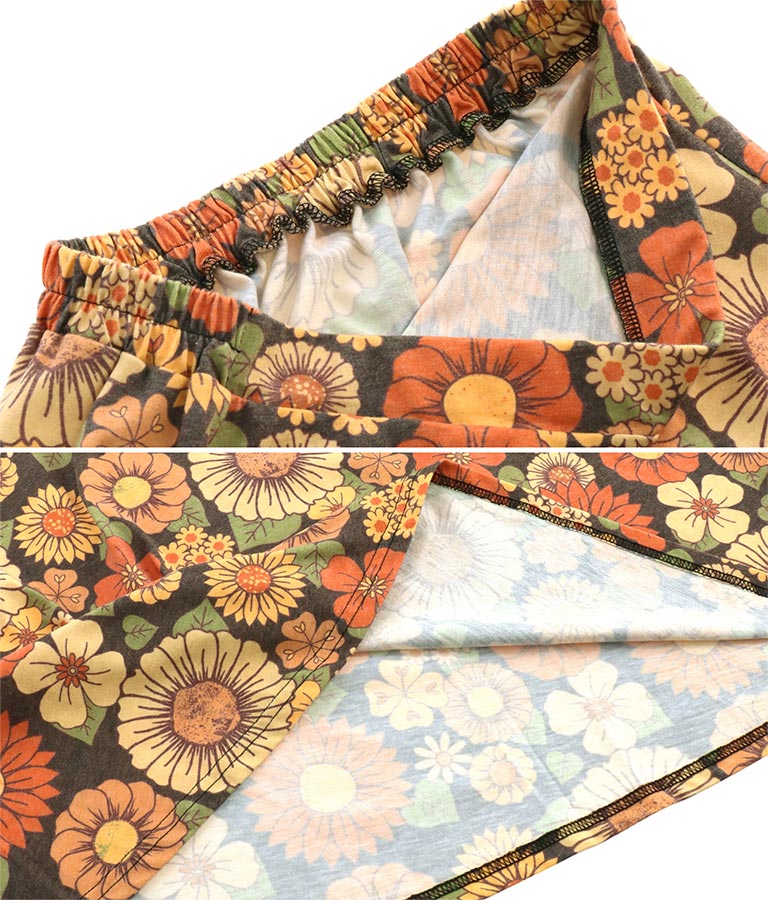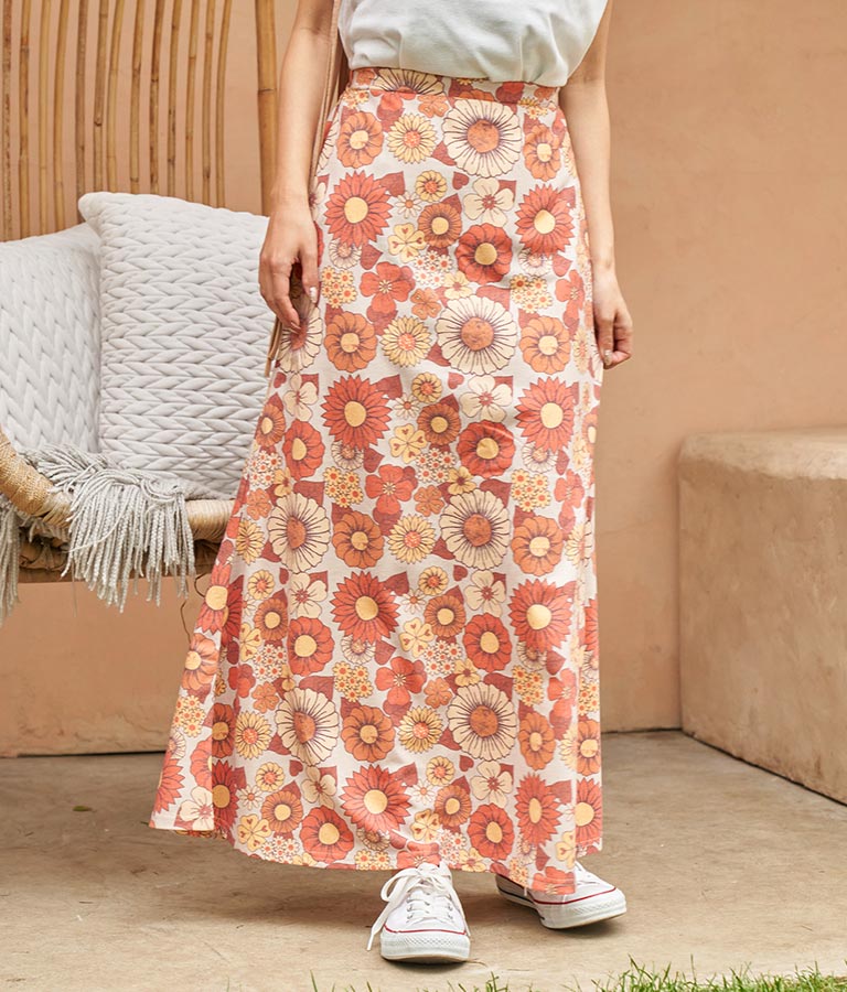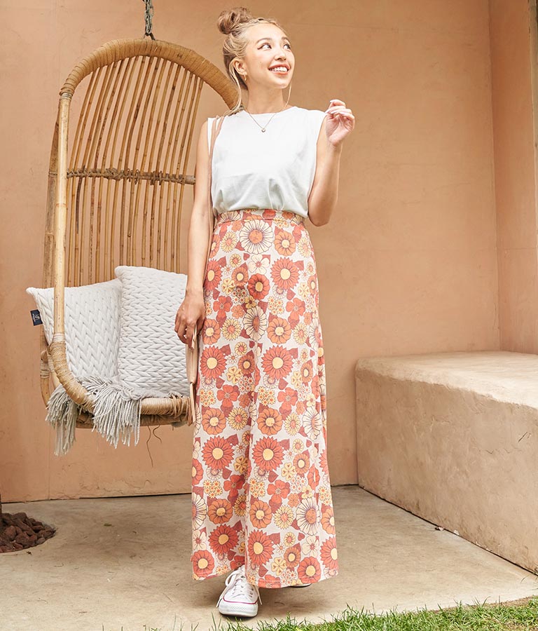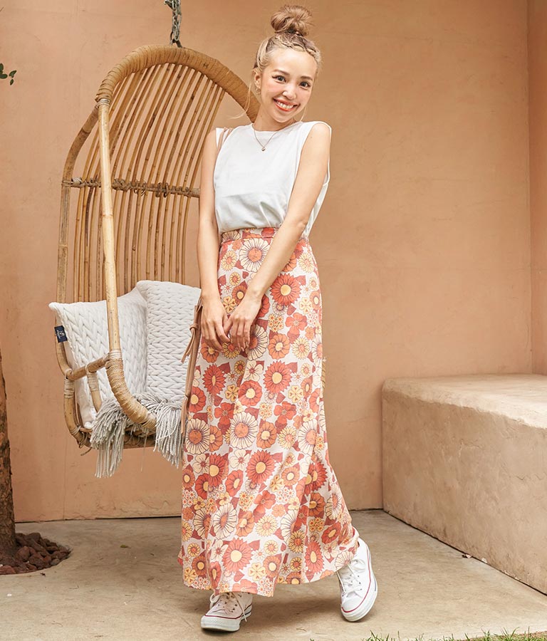 レトロなフラワー柄が目を引くセミフレアスカート。