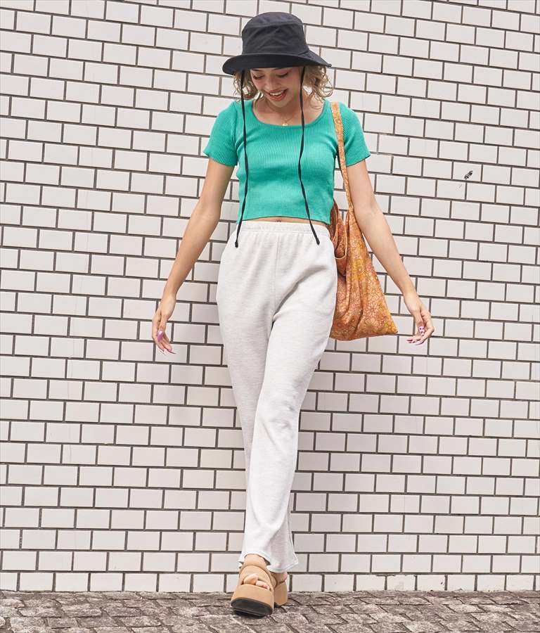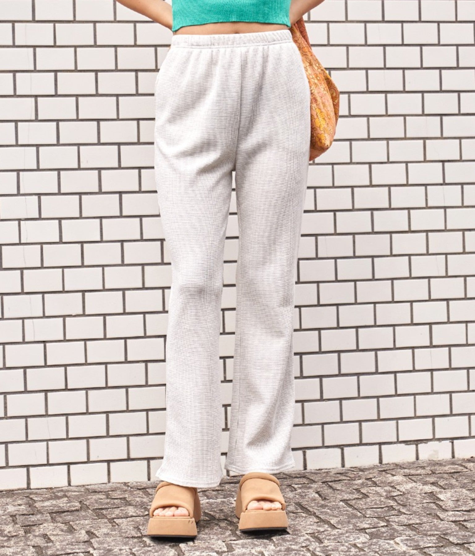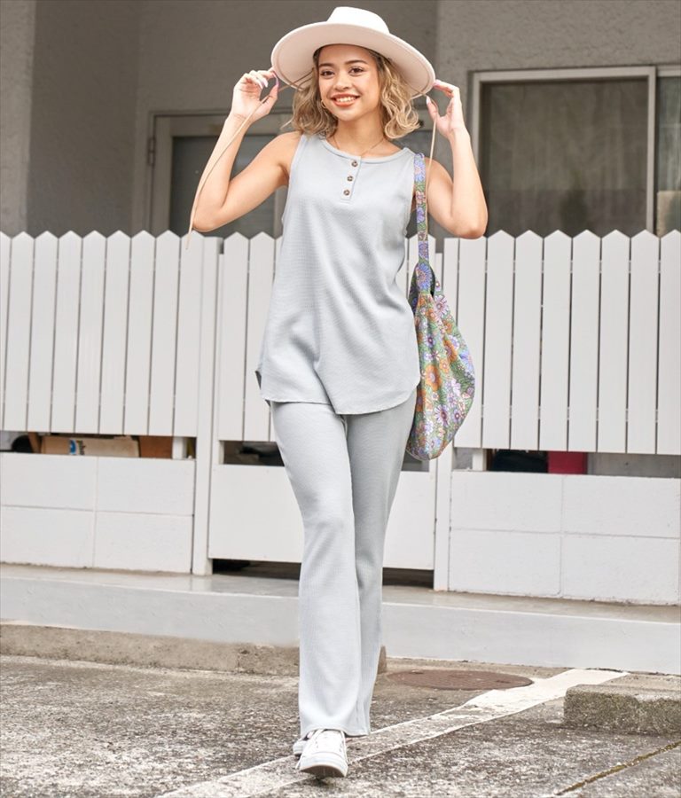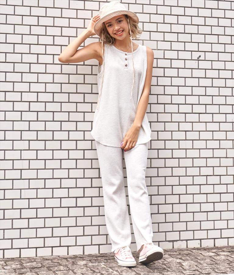 同じワッフル素材を使用したトップスを合わせたセットアップ風の着こなしもおすすめです。