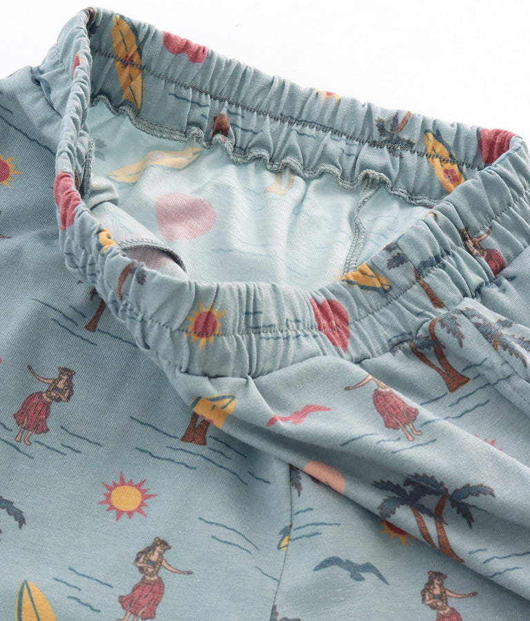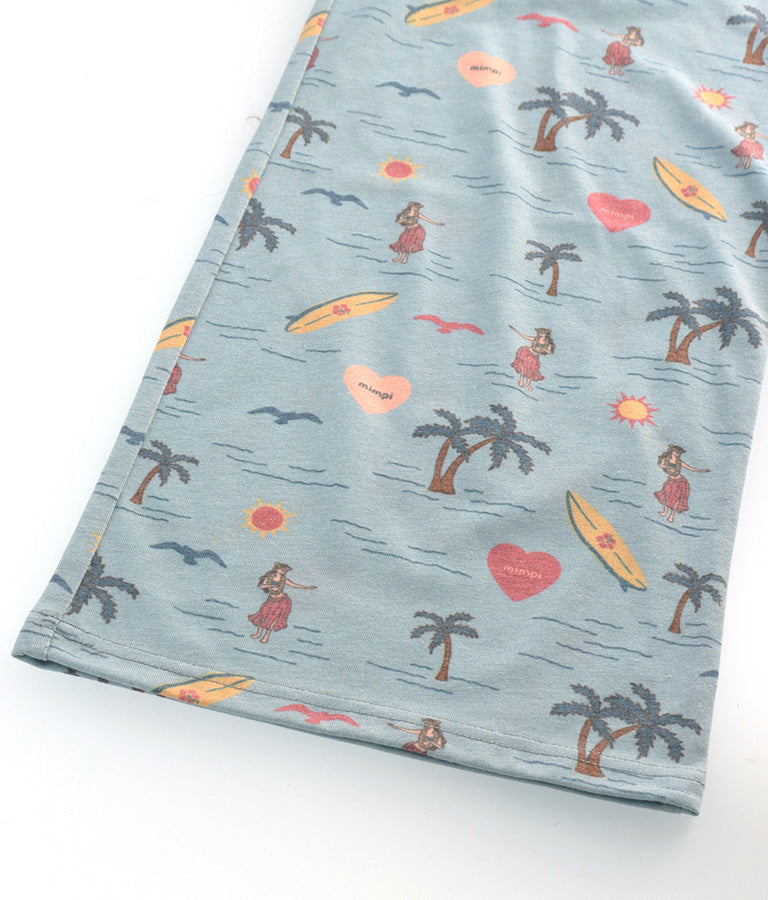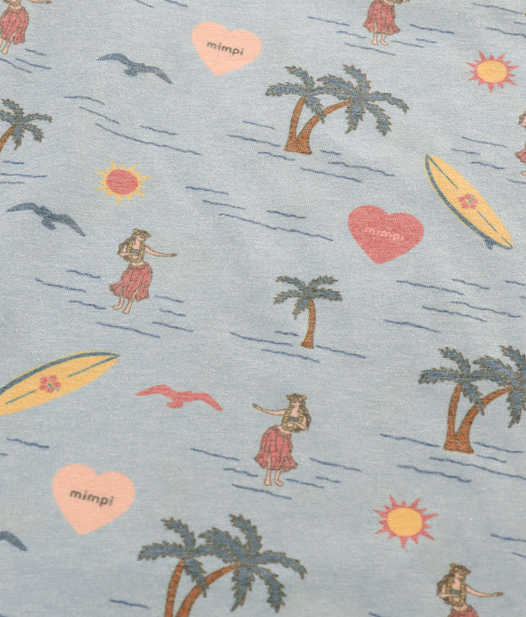 フラガールやサーフボードなど海を感じさせるモチーフを散りばめたパターンが飛び切りキュートな一枚。