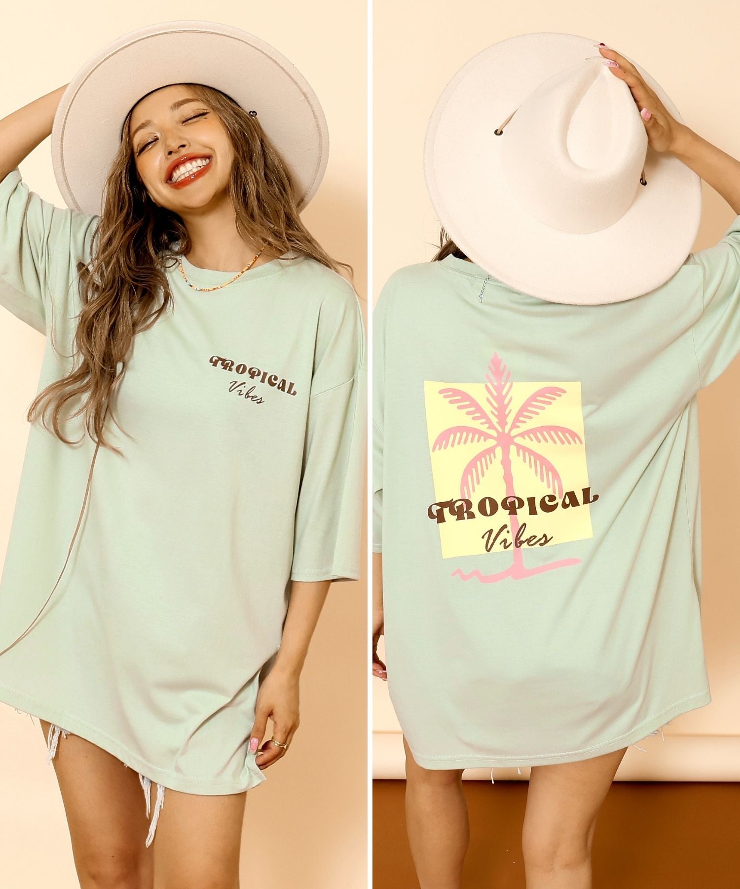 カラー パームツリー プリント オーバーサイズ Tシャツ 853-6027
