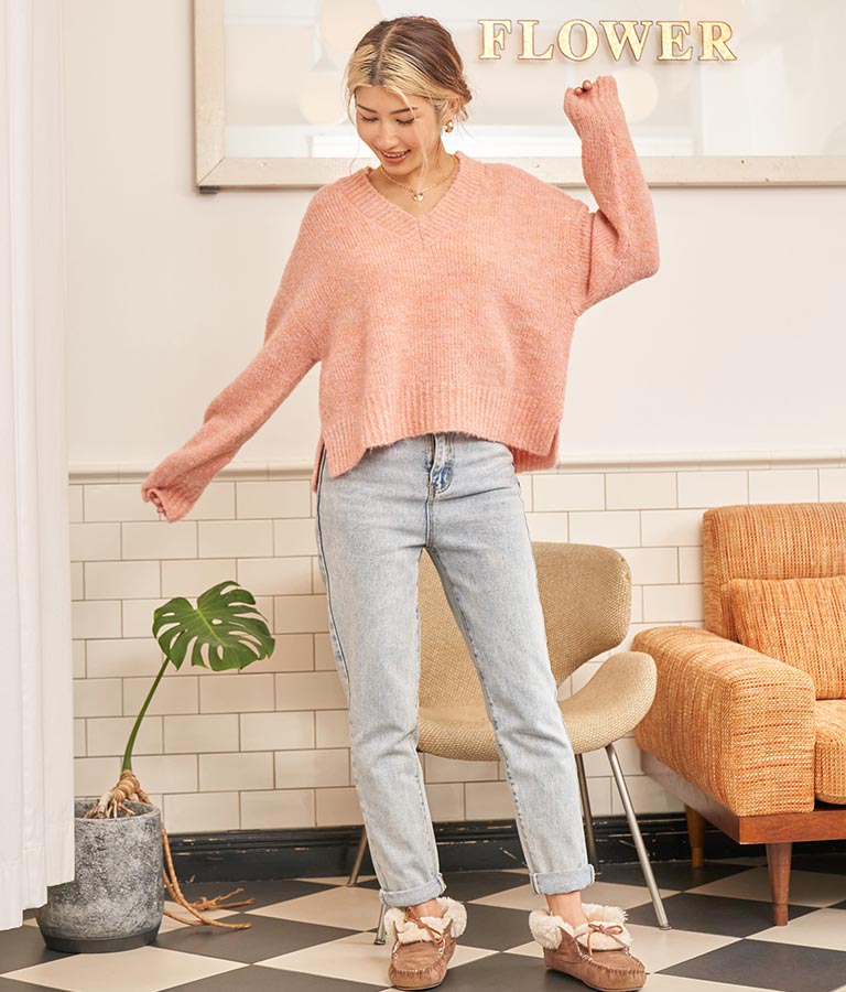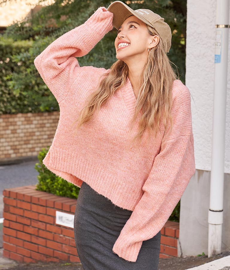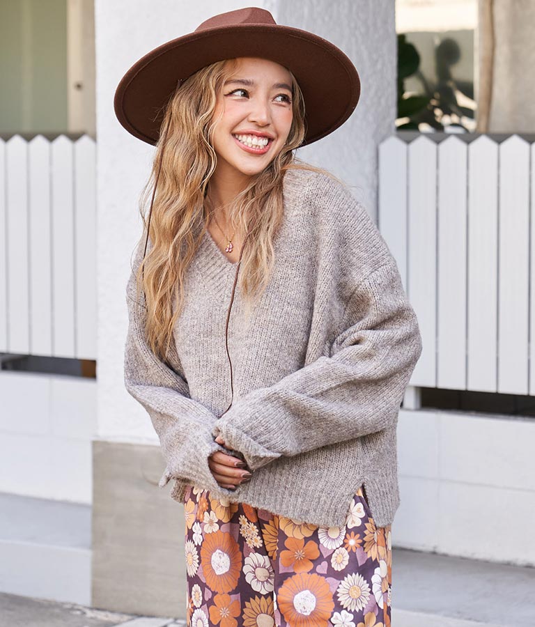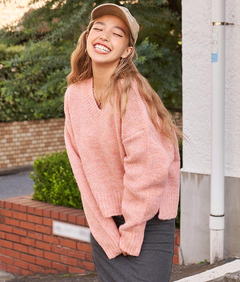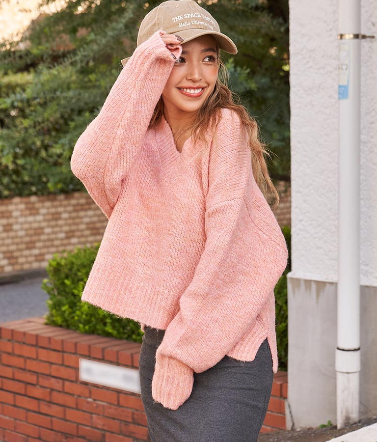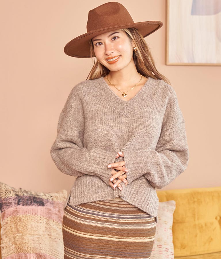 大きめにざっくり開いたVネックには、キャミで抜け感を出したり、ハイネックのインナーをレイヤードしたりと、スタイリングの幅が出せるポイントに。
