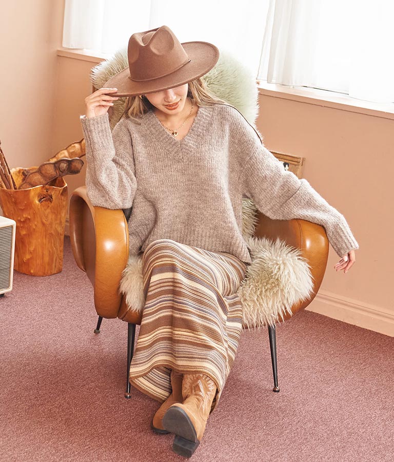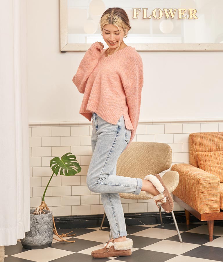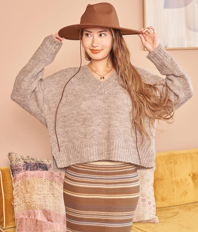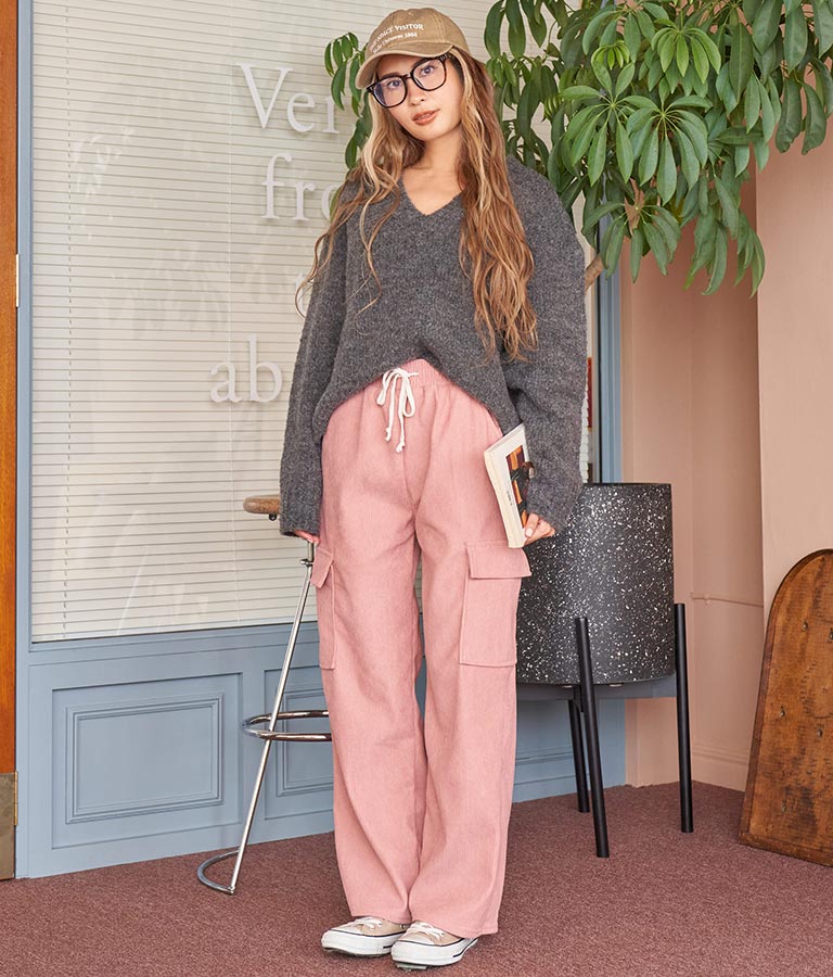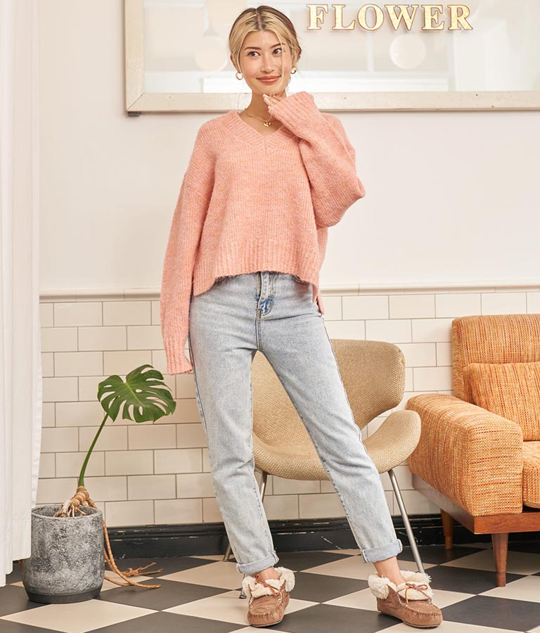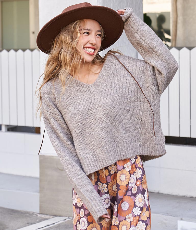 大きめにざっくり開いたVネックには、キャミで抜け感を出したり、ハイネックのインナーをレイヤードしたりと、スタイリングの幅が出せるポイントに。