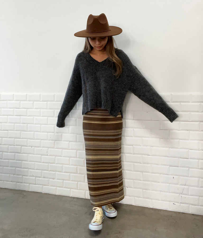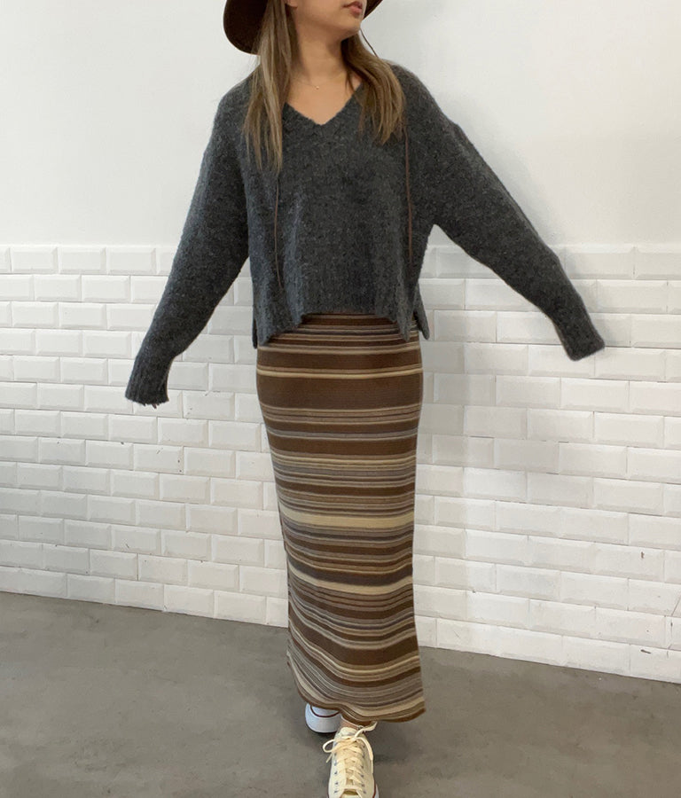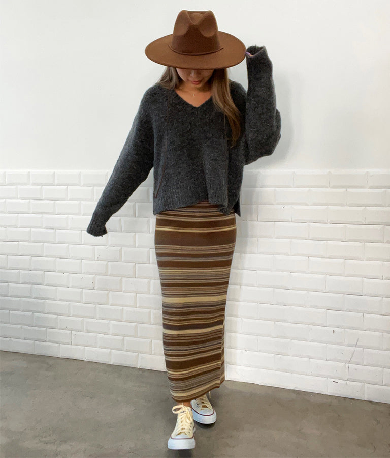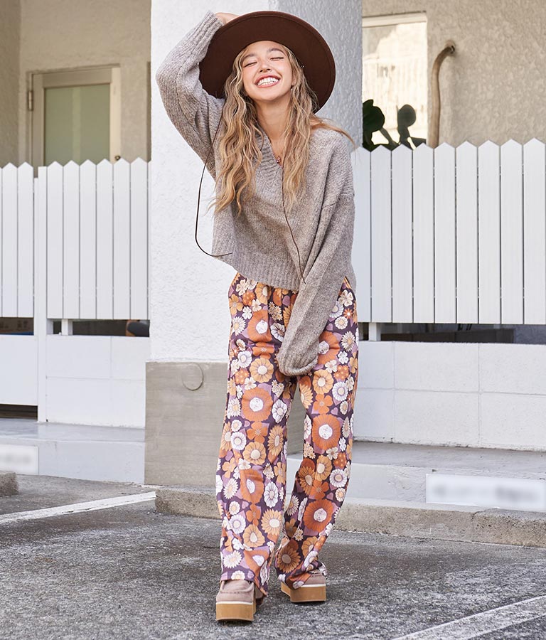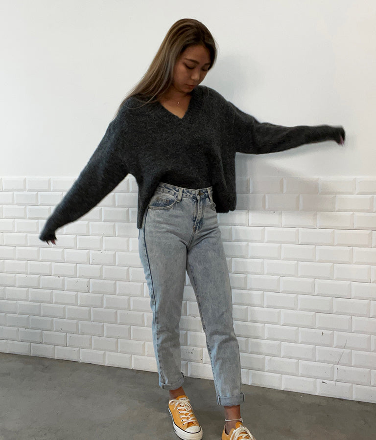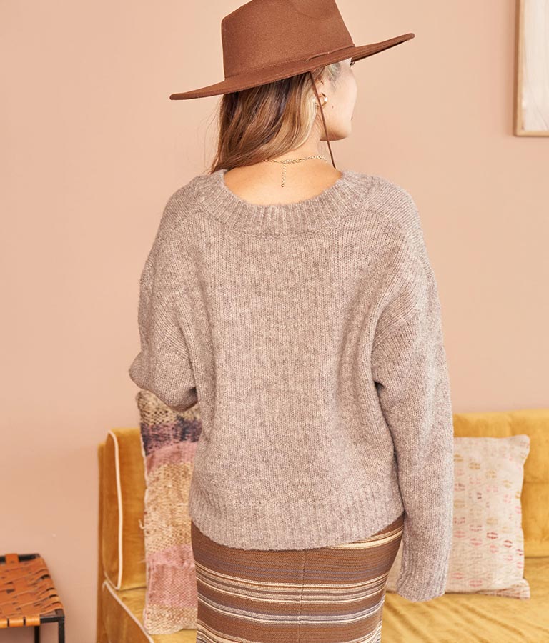 大きめにざっくり開いたVネックには、キャミで抜け感を出したり、ハイネックのインナーをレイヤードしたりと、スタイリングの幅が出せるポイントに。