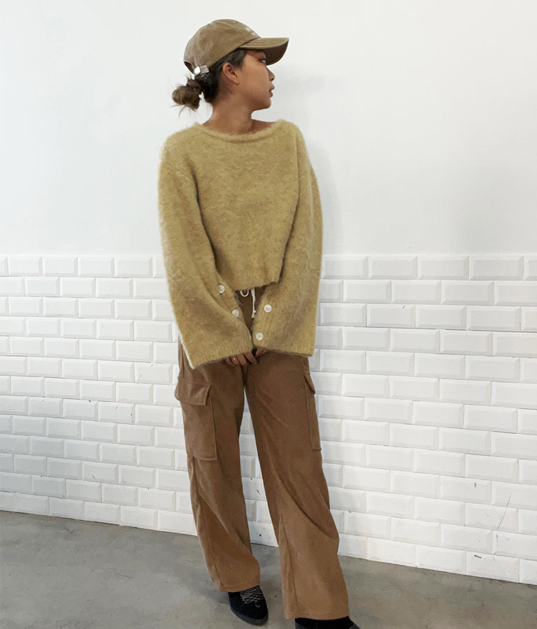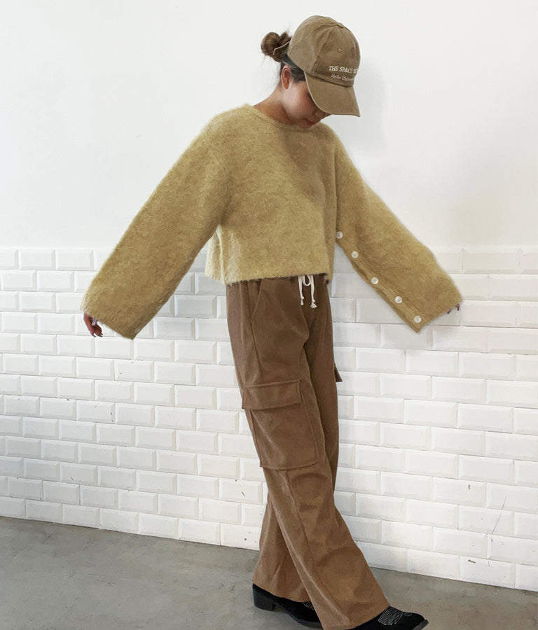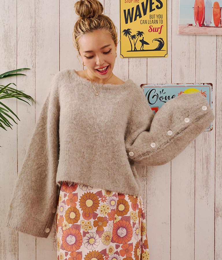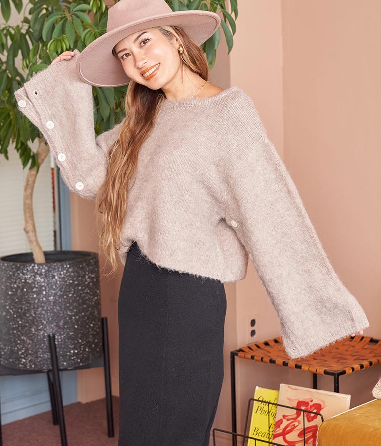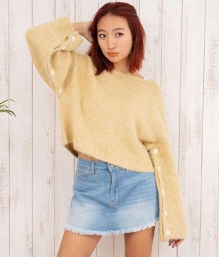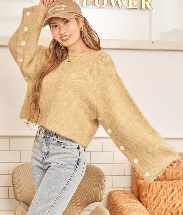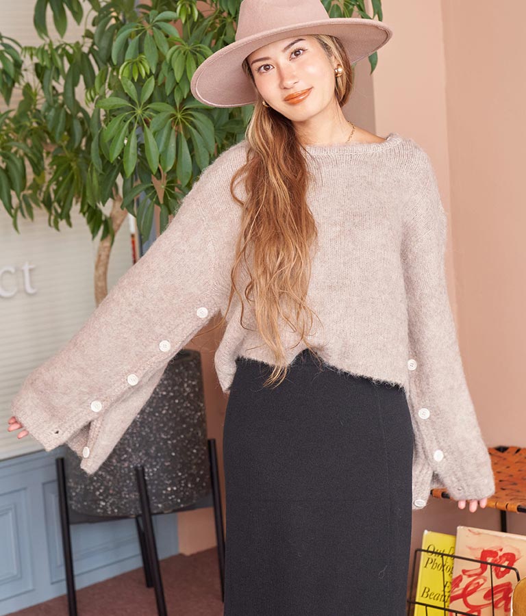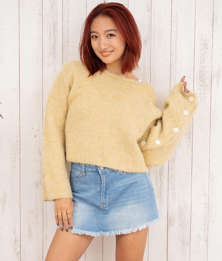 シンプルなデザインにアームボタンがアクセントになったニット。