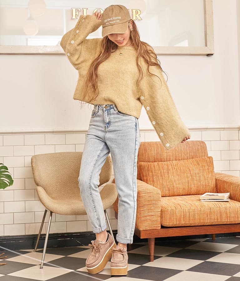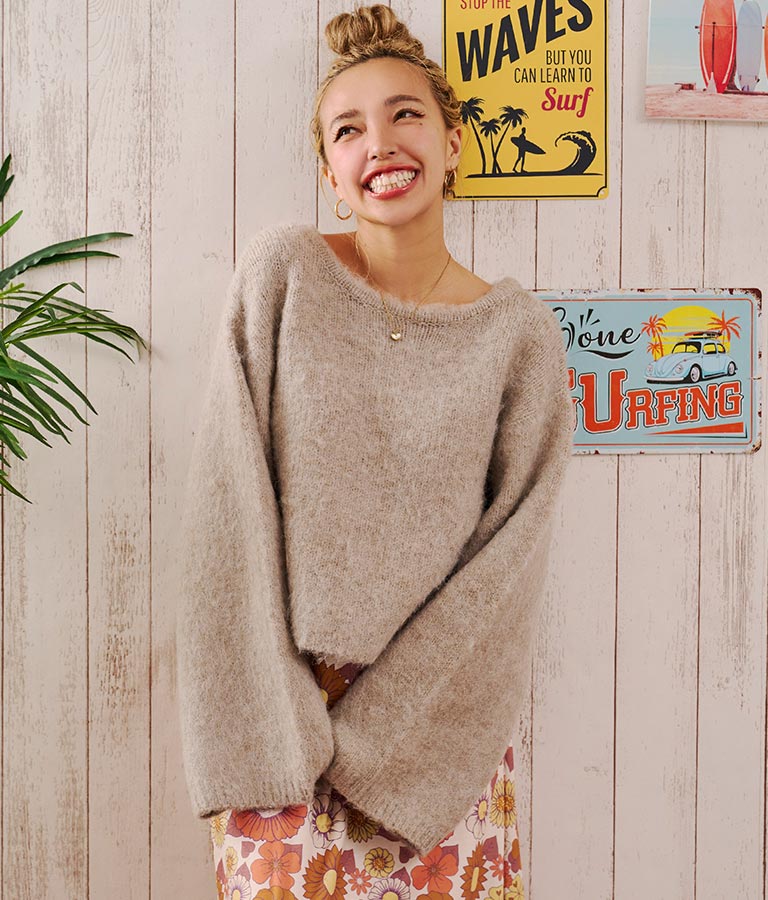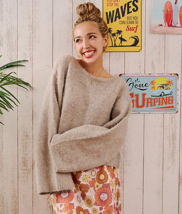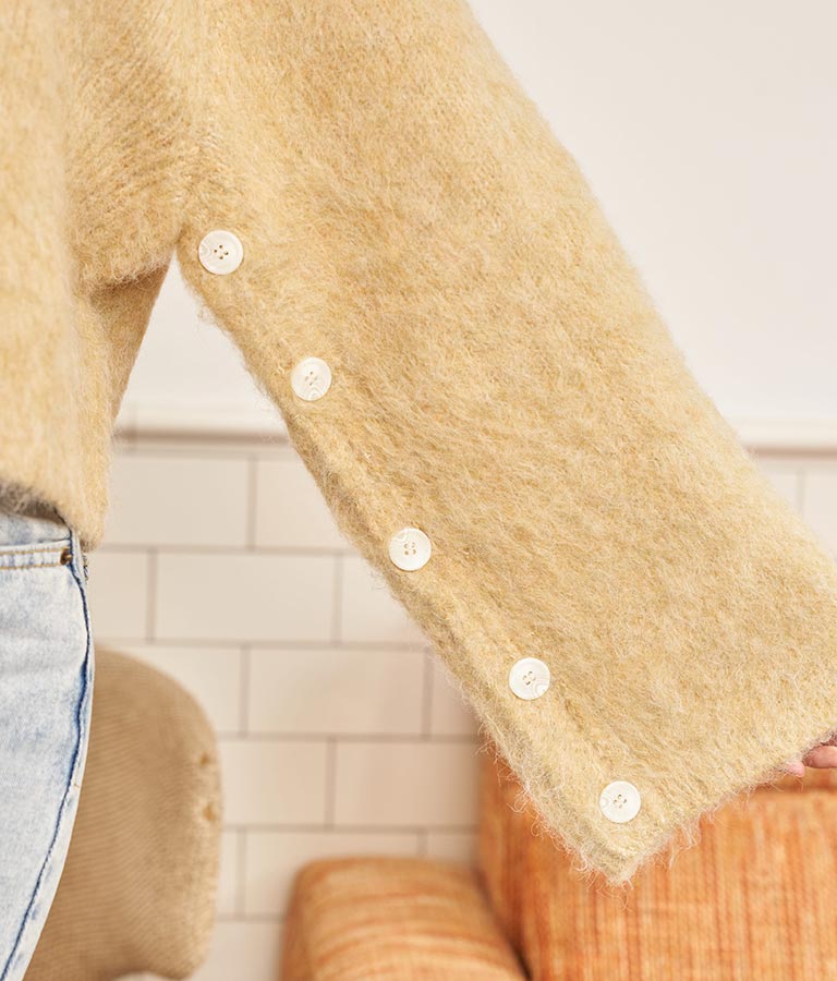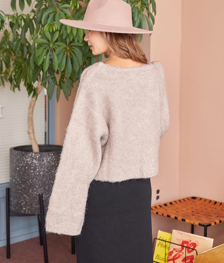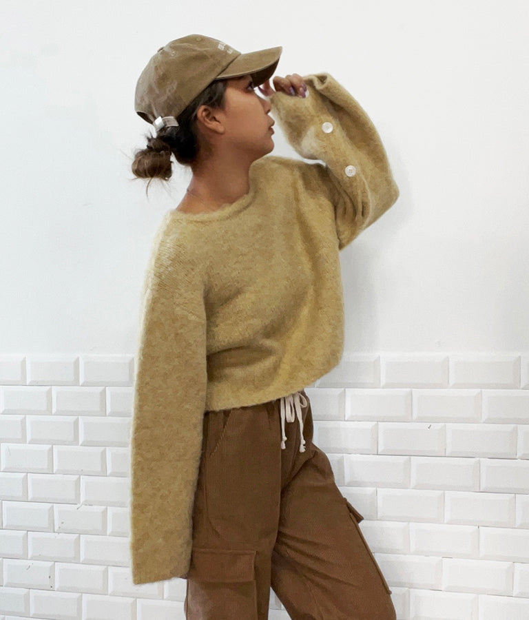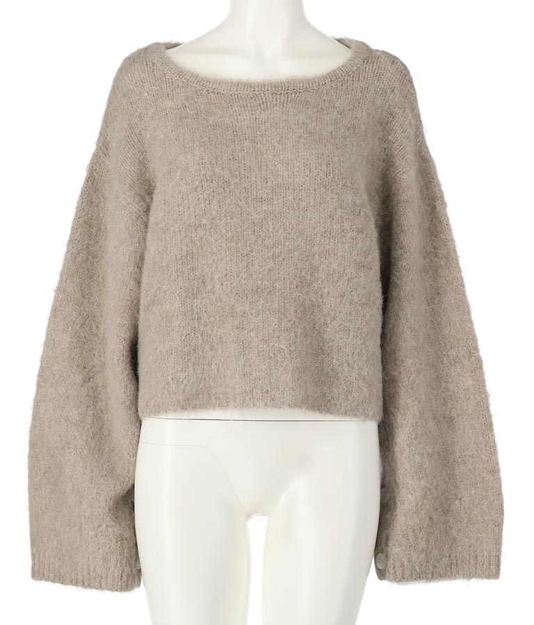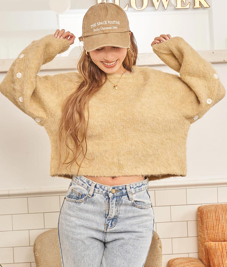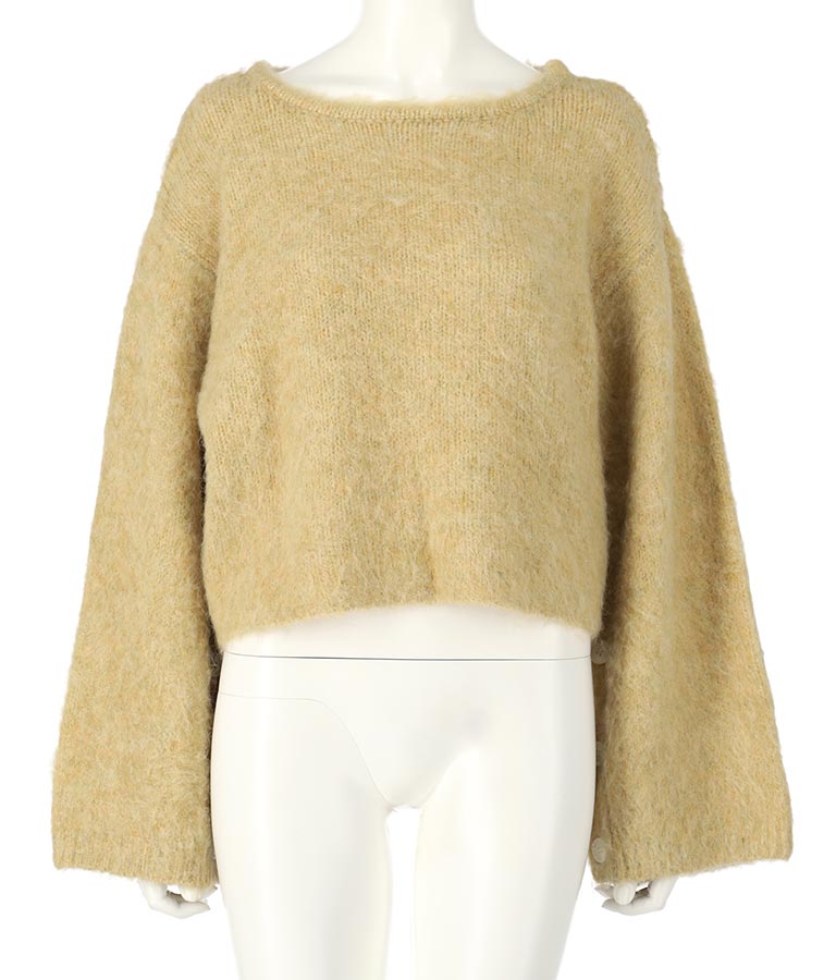 シンプルなデザインにアームボタンがアクセントになったニット。