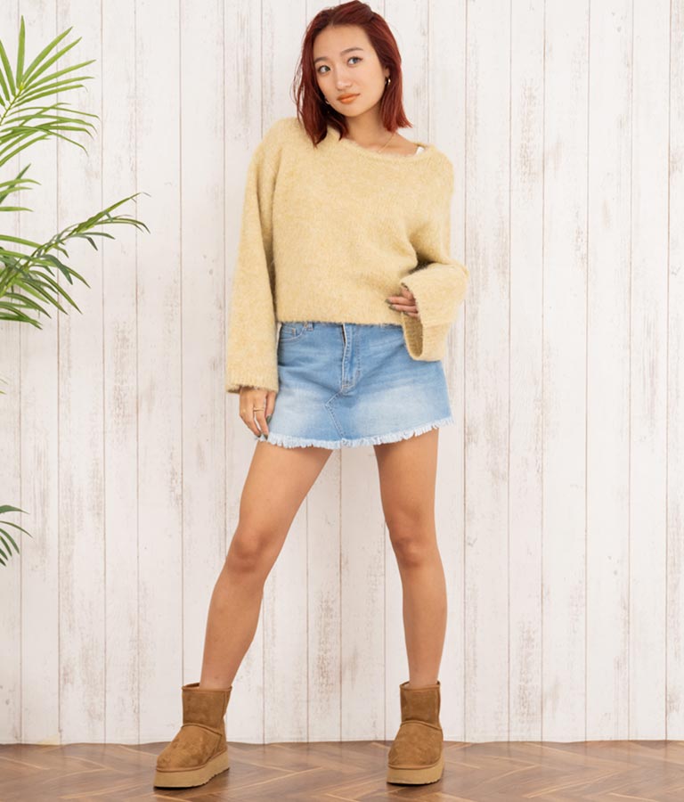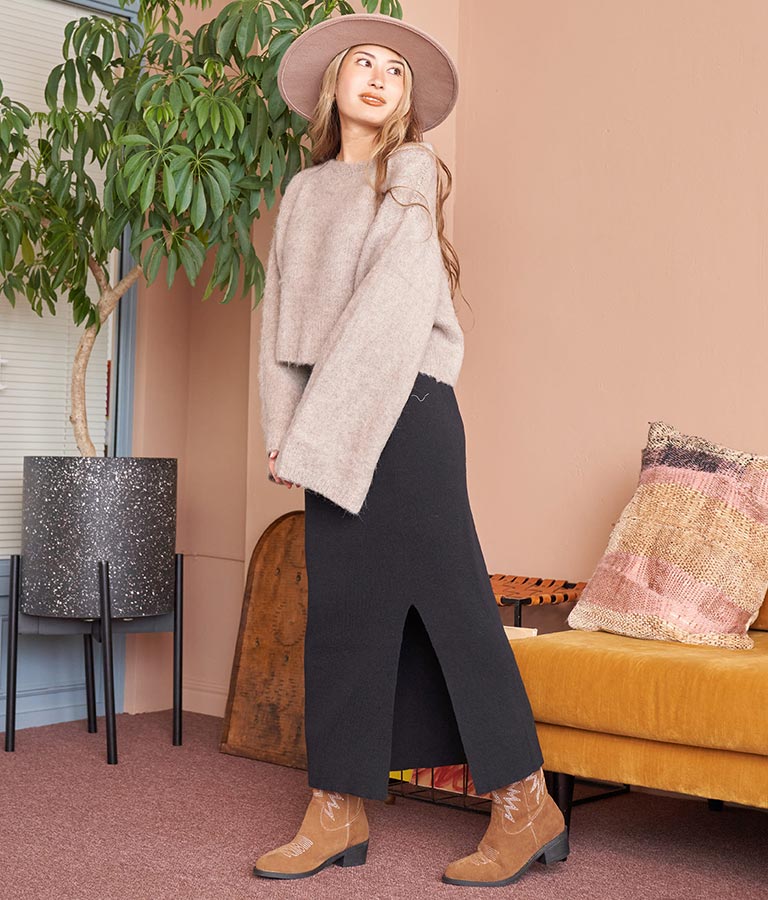 シンプルな無地なので、定番のデニムやフェミニンなタイトスカートなどとの相性が抜群◎