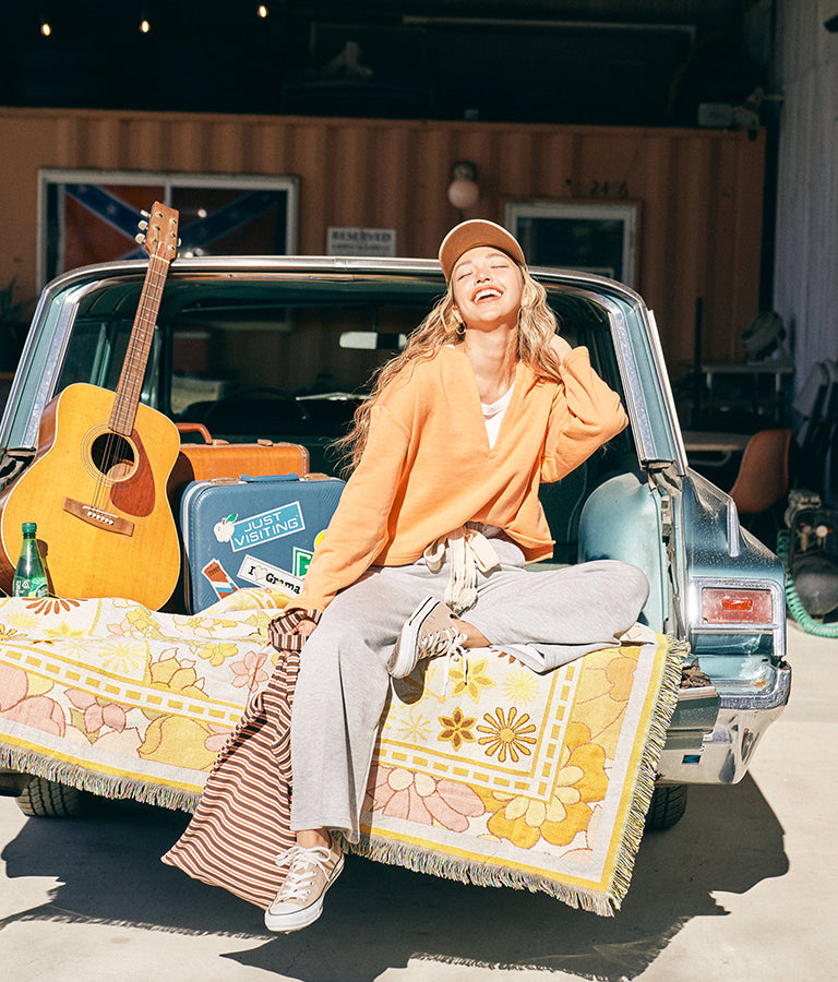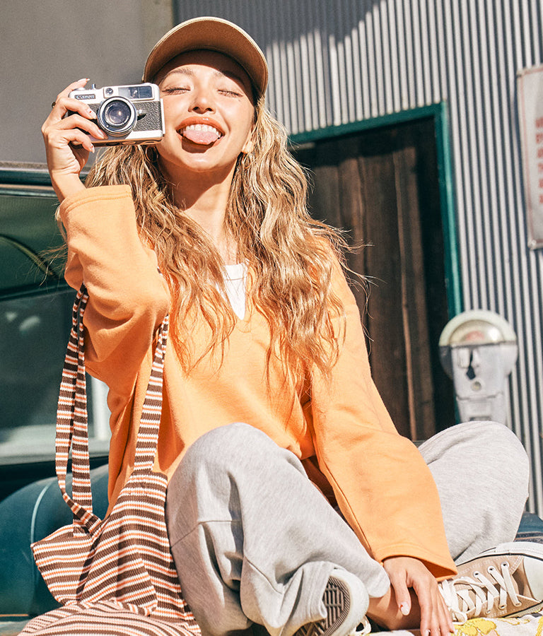 ワイドな身幅に短めの着丈が今年らしさを演出するクロップドトレーナー。