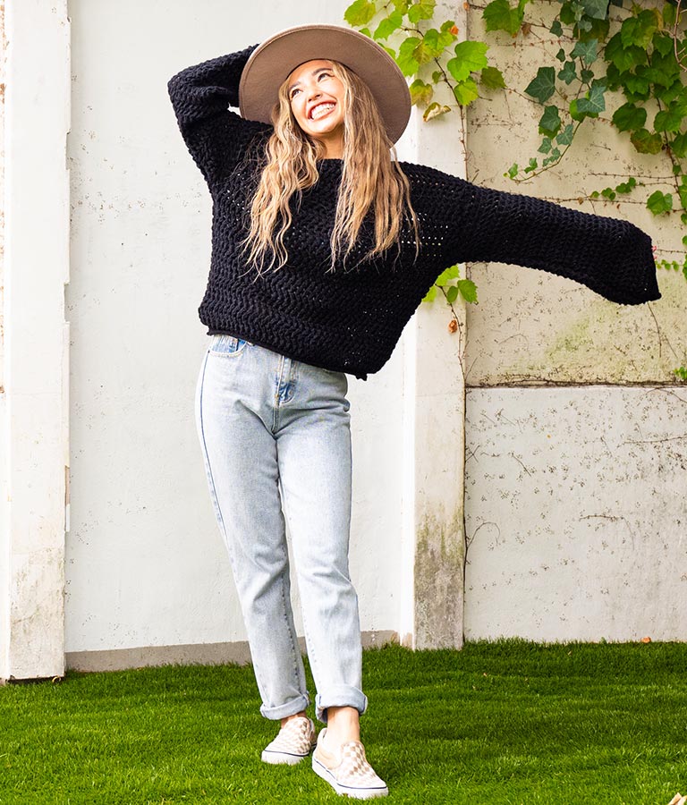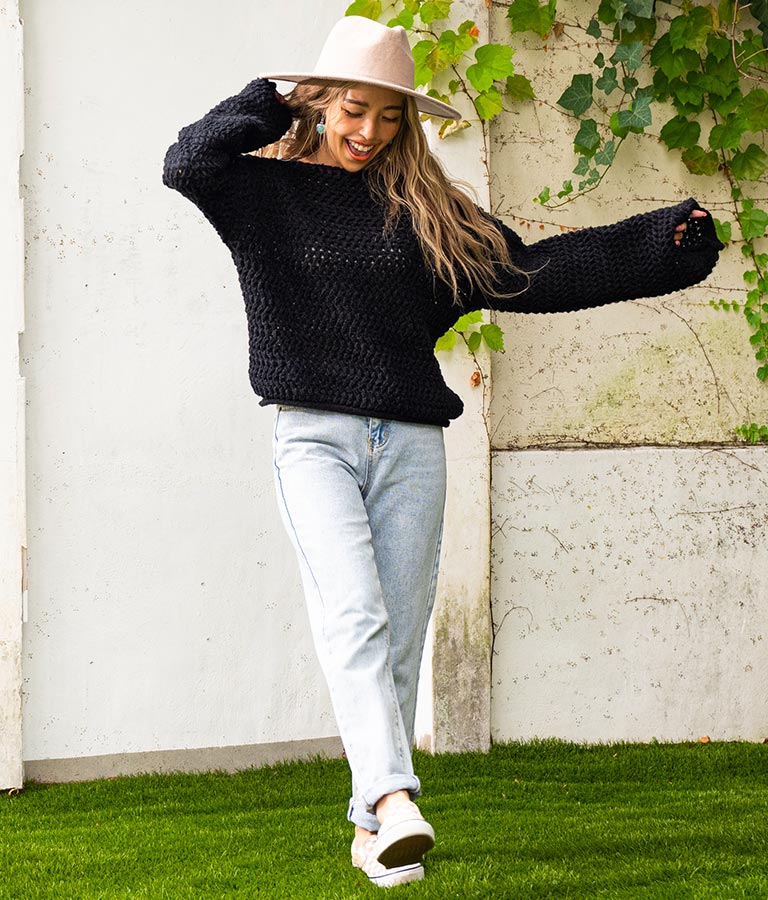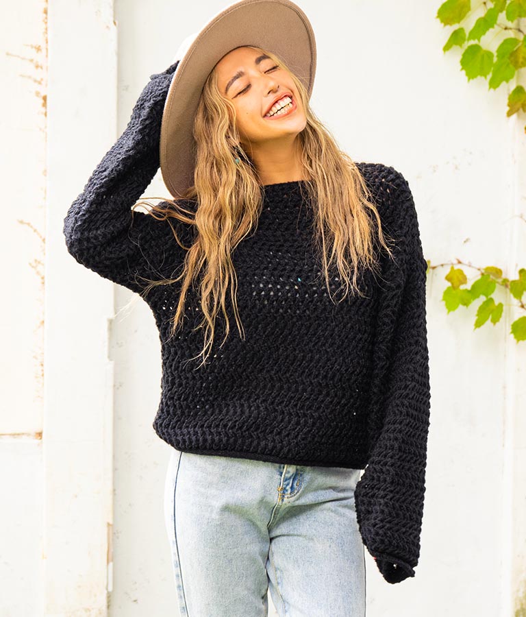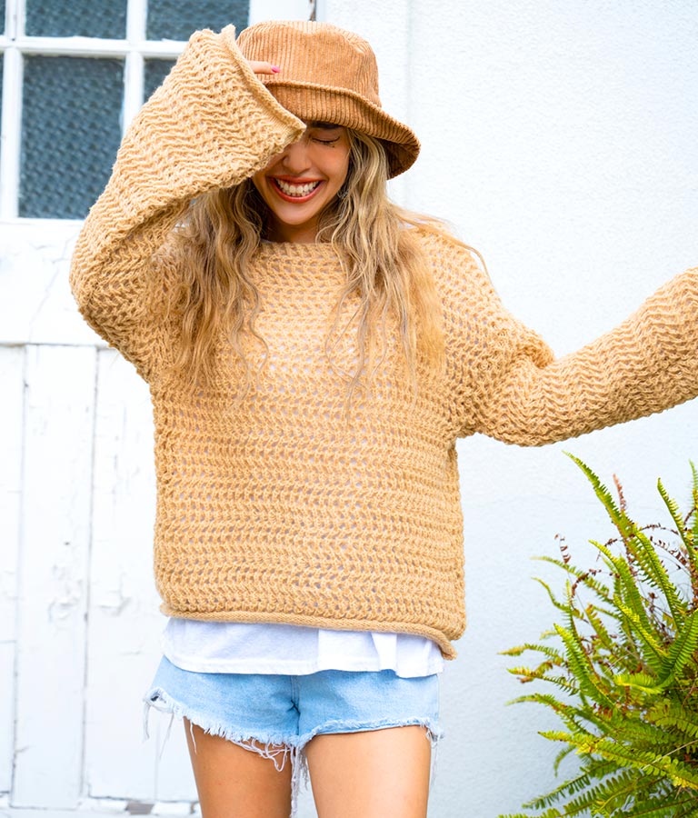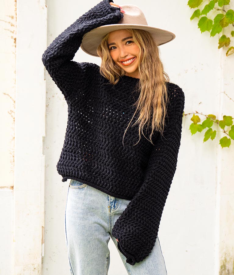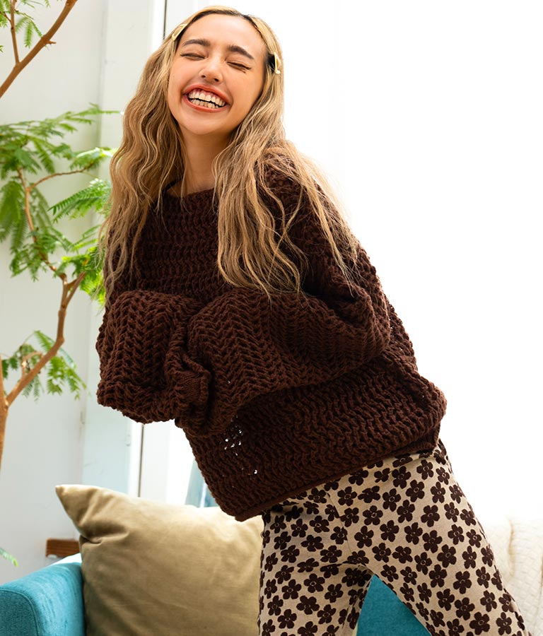 程よい透け感の編み地で、着こなしの遊びができるニット。