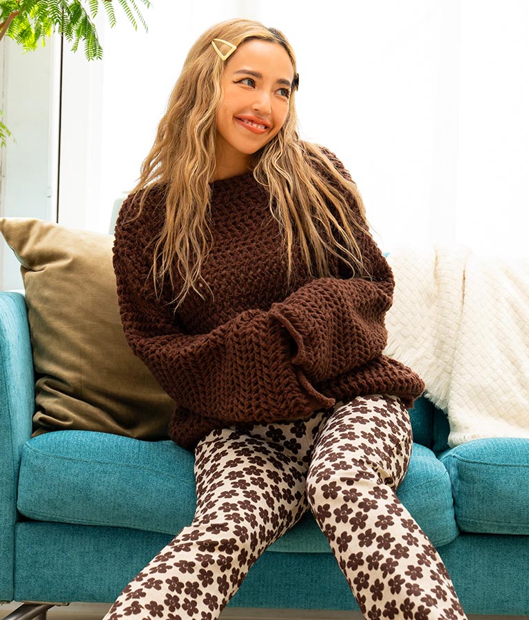 もちろん柄物との相性もよく、これ1枚で着こなしの幅が広がる万能ニットです。