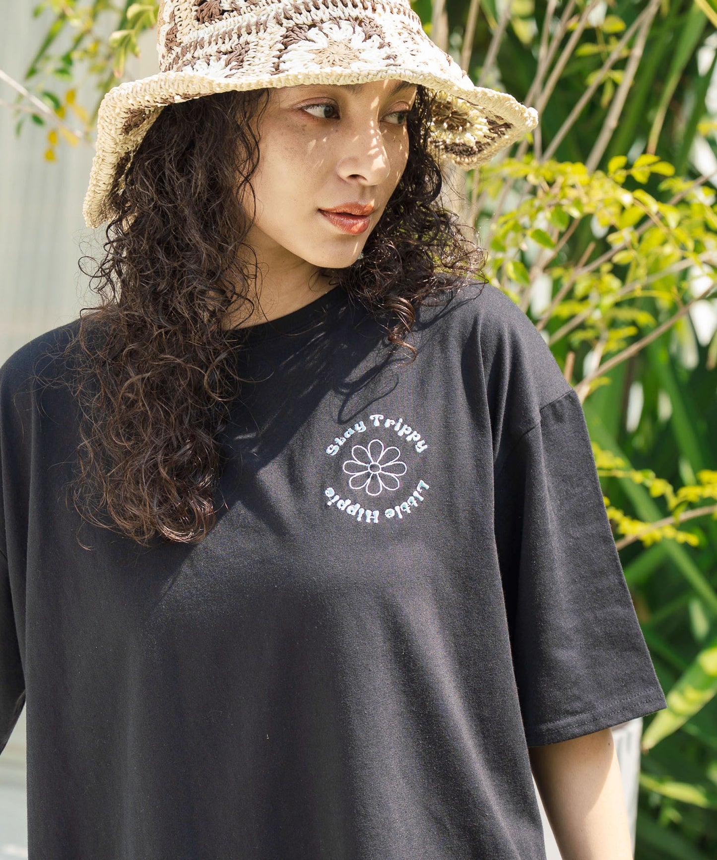 ヒッピー メッセージロゴ プリント × フラワー 刺繍 Tシャツ