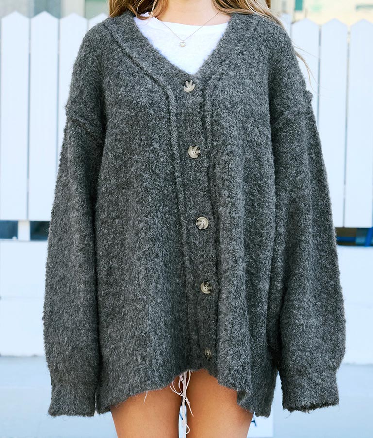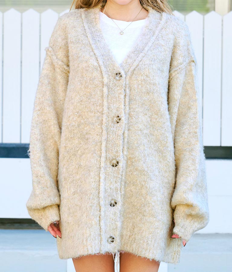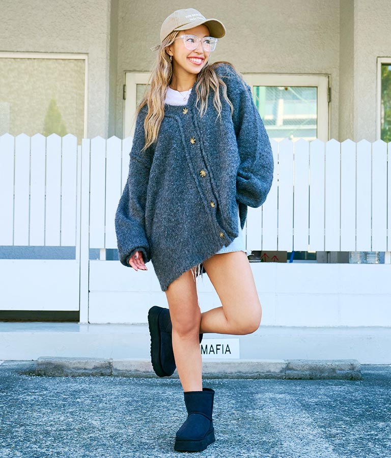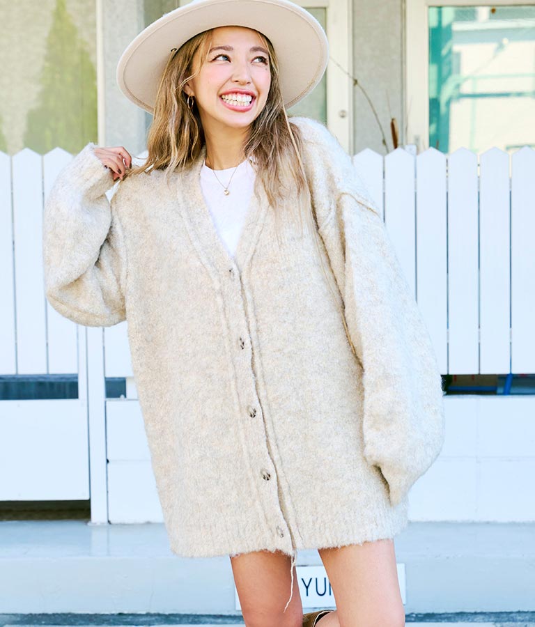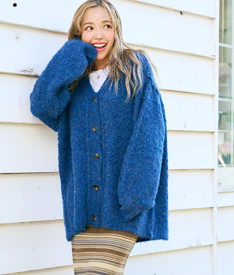 秋冬らしいもこもこブークレ素材を使用したMIXニットカーディガン。