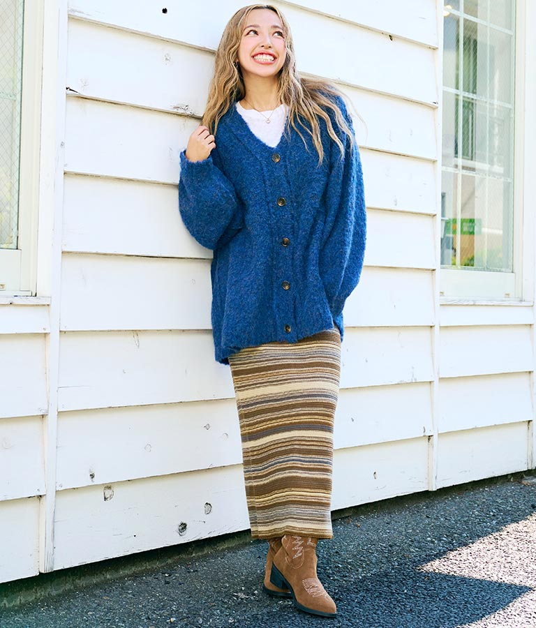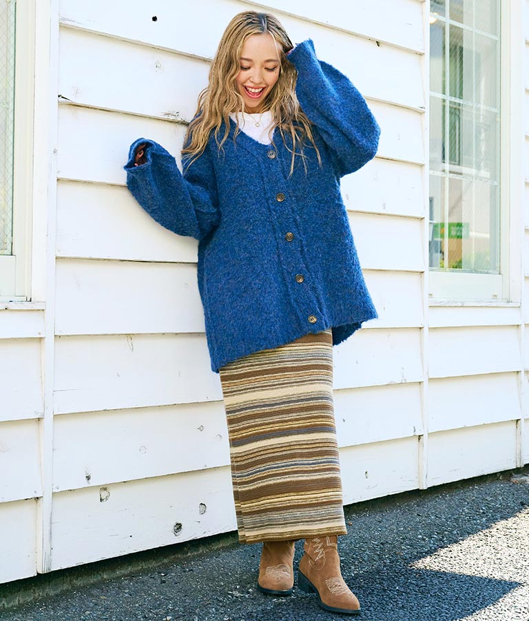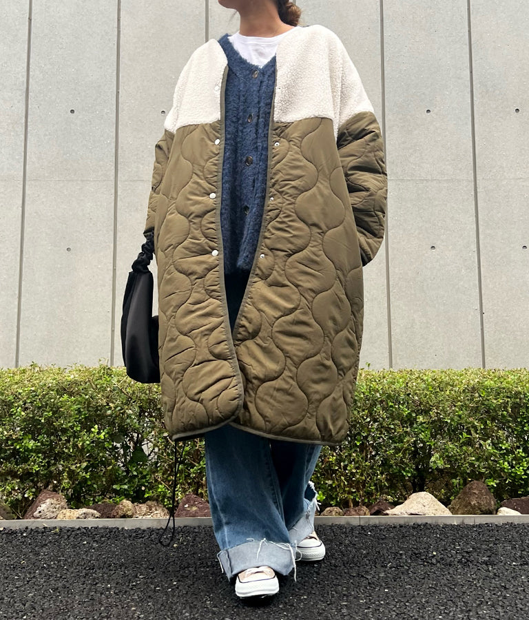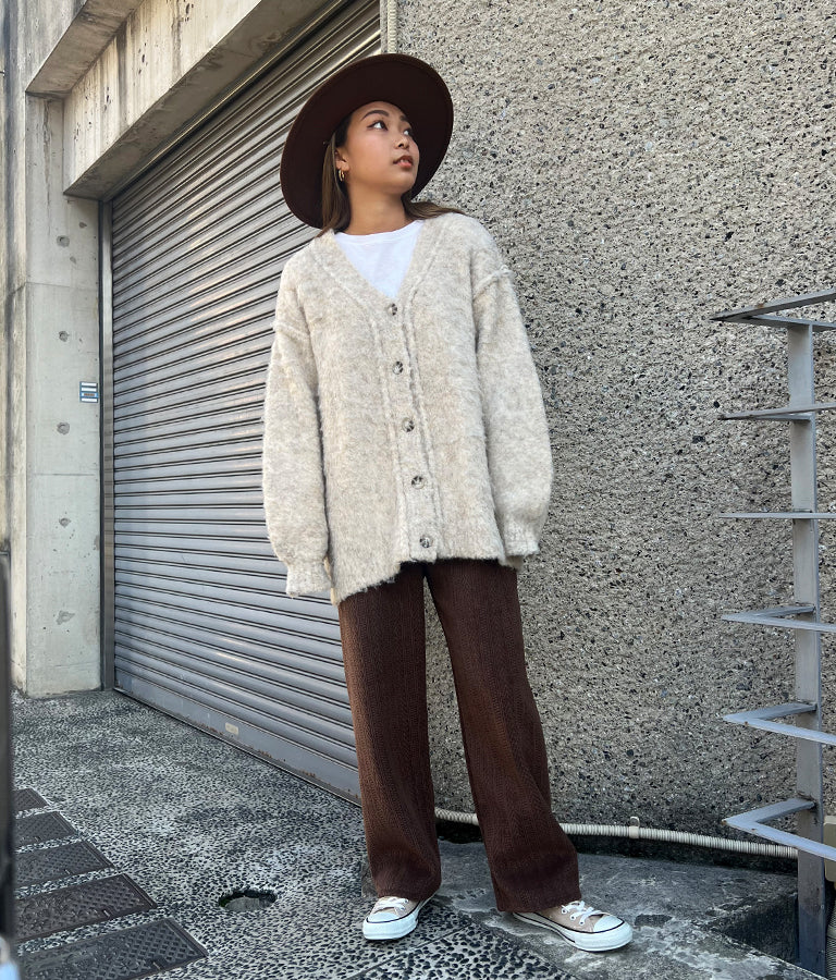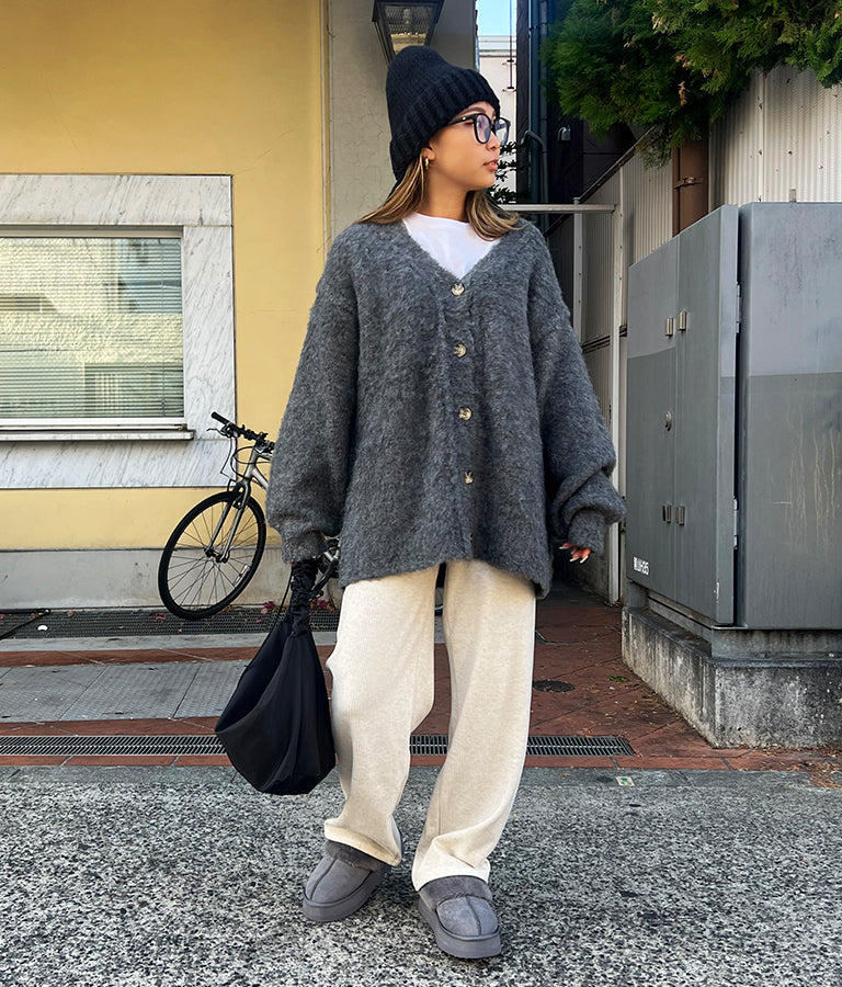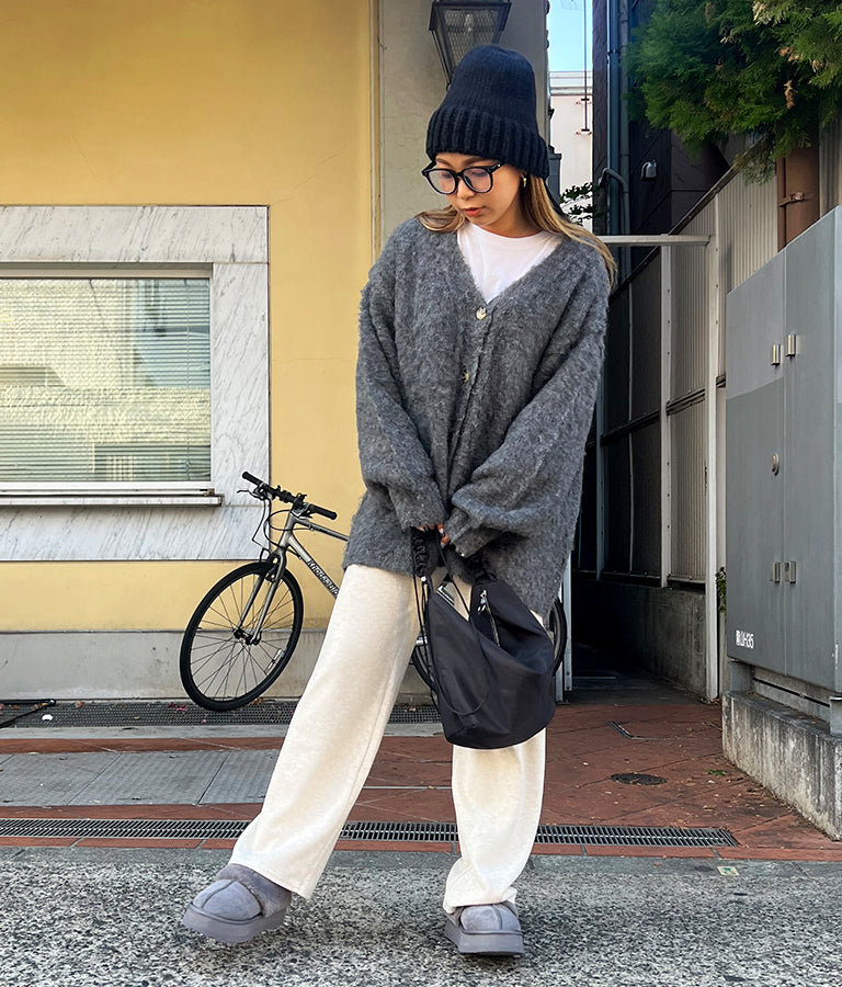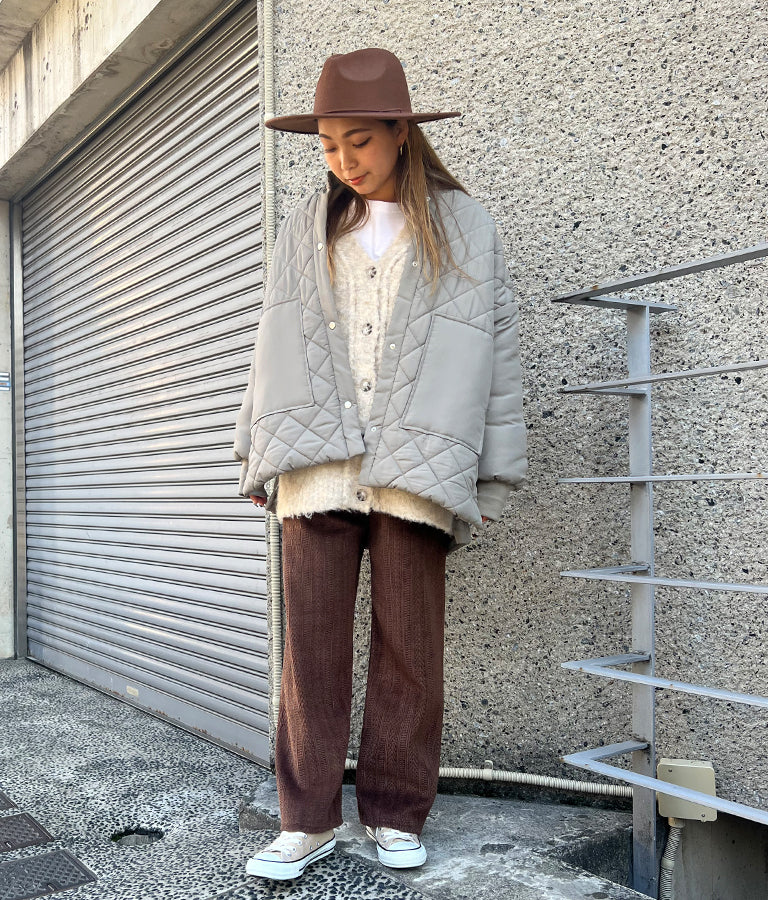ボリュームのあるシルエットなのでタイトスカートやショート丈のボトムと合わせるとより好バランスなスタイリングが完成します。