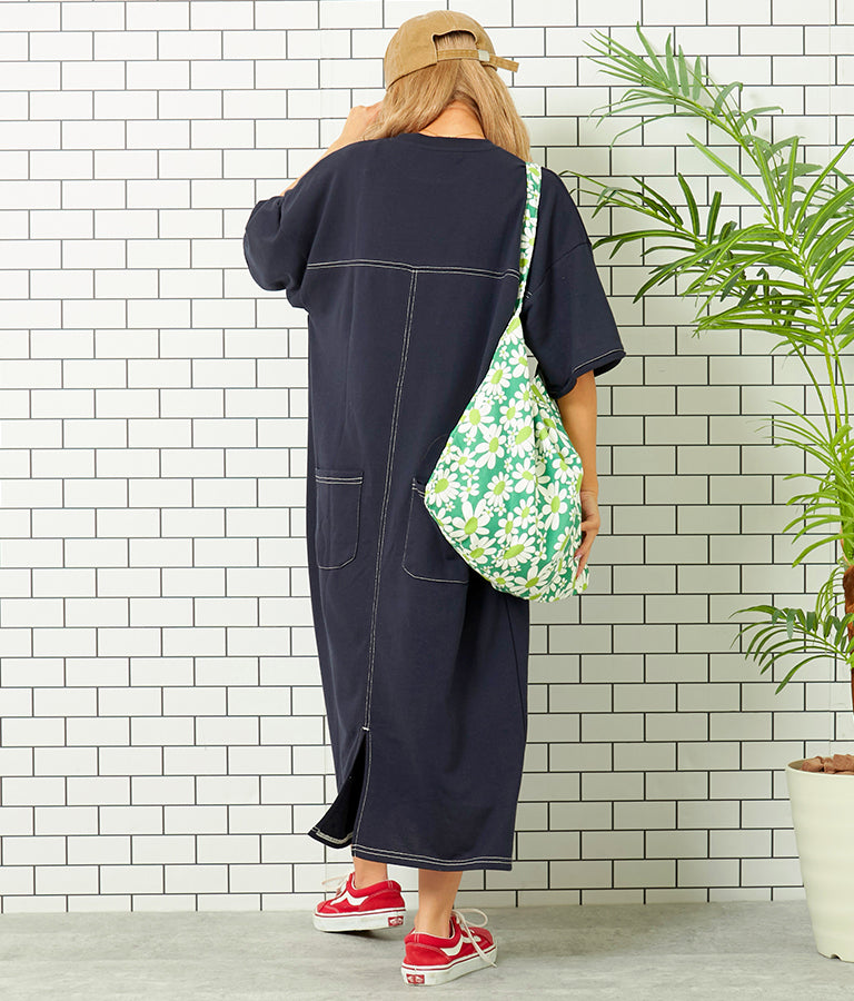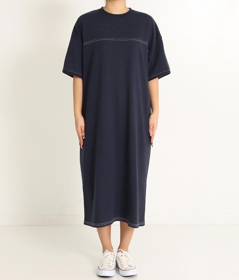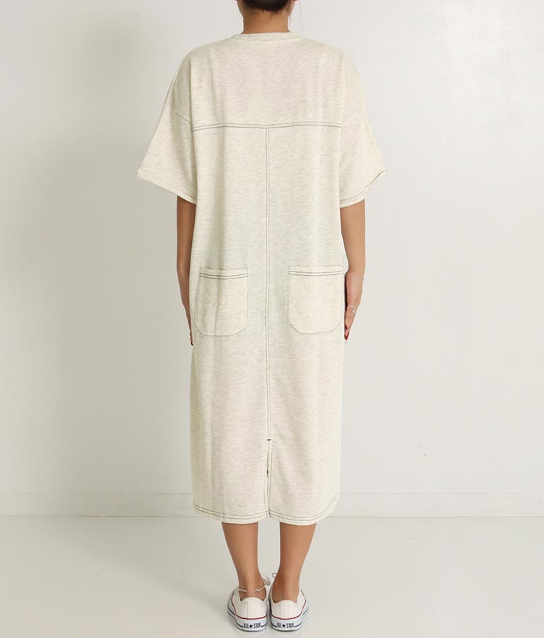 ガーゼ 裏毛 バック切替 5分袖 スウェット ワンピース -