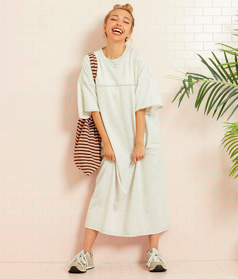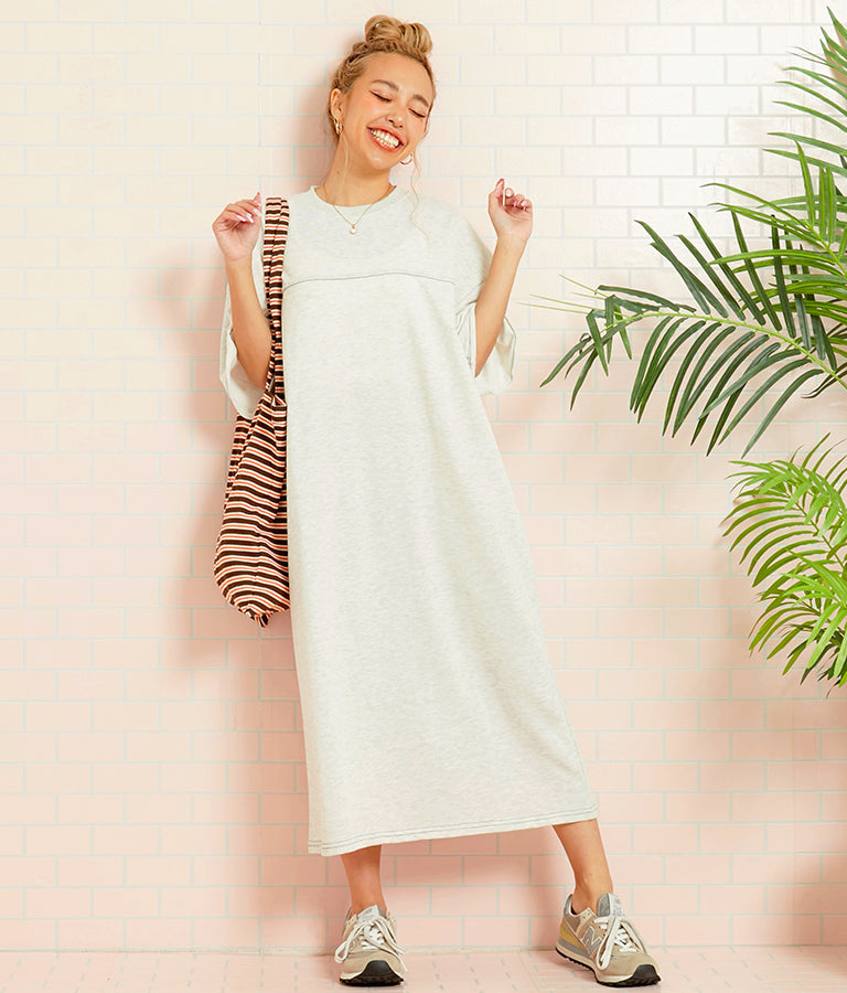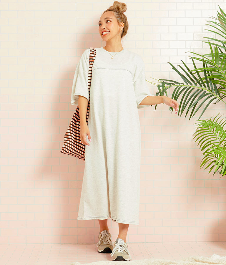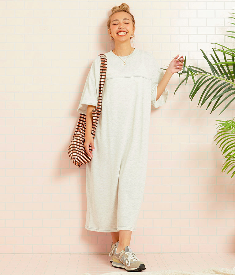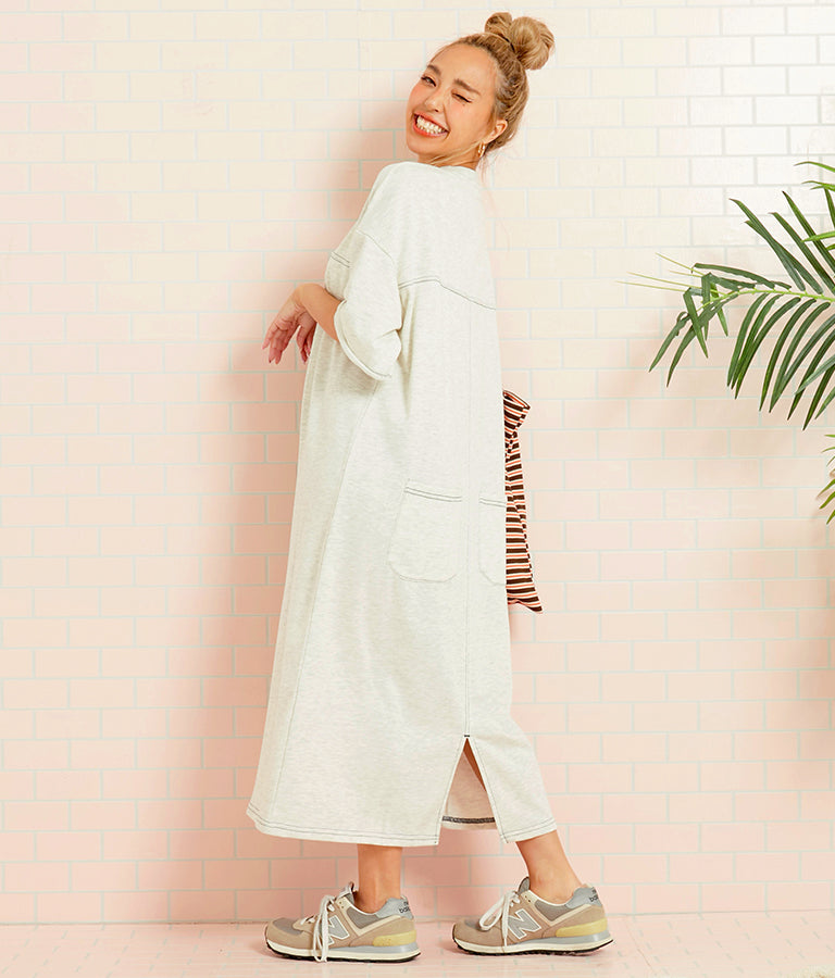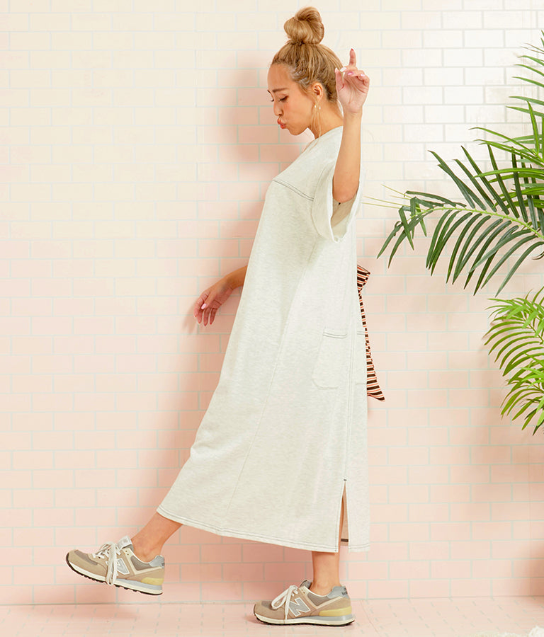 コーディネートにリラックス感をもたらすガーゼ裏毛素材のスウェットワンピース。