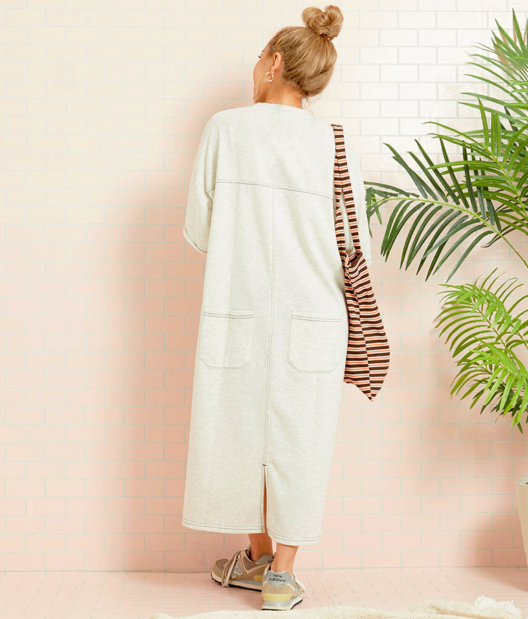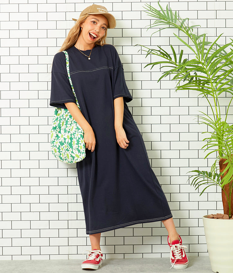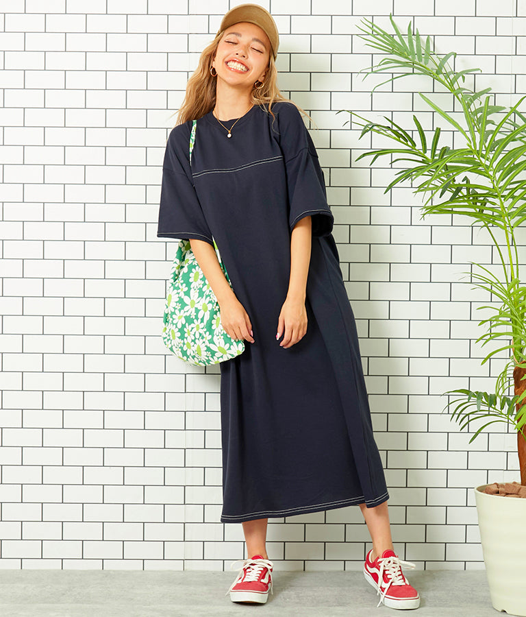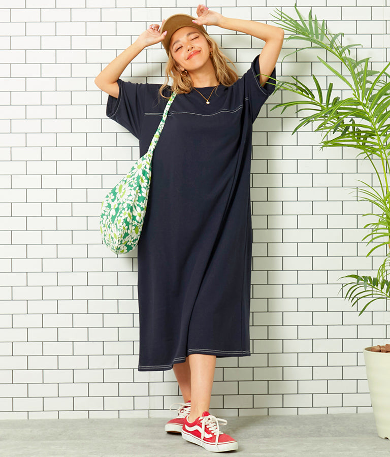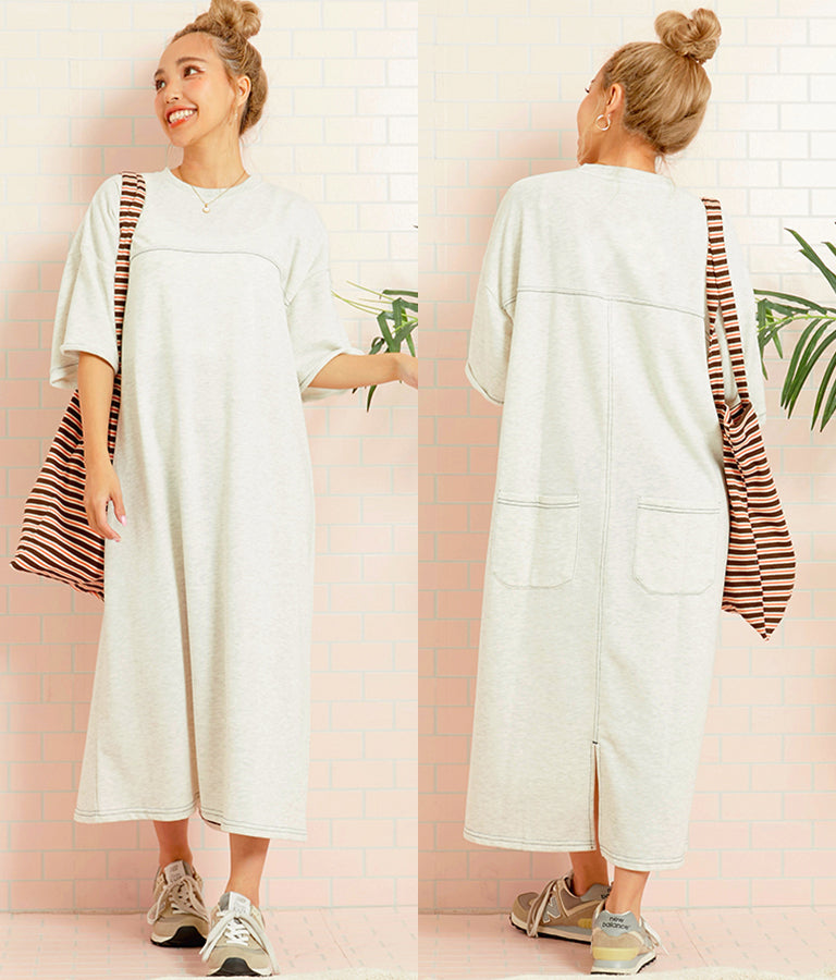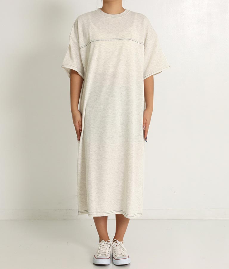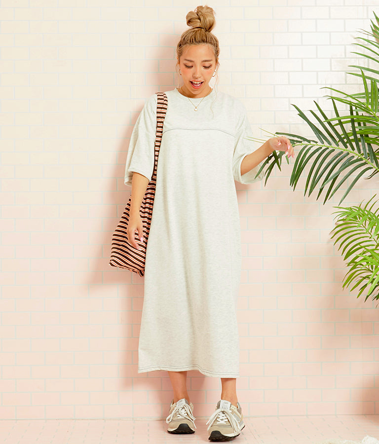 コーディネートにリラックス感をもたらすガーゼ裏毛素材のスウェットワンピース。