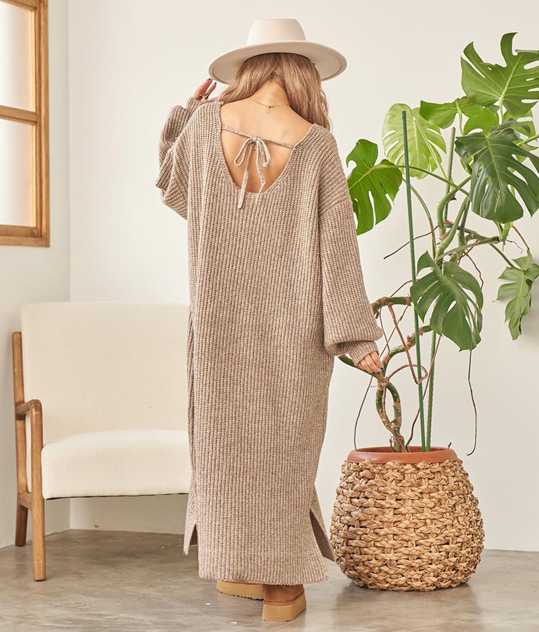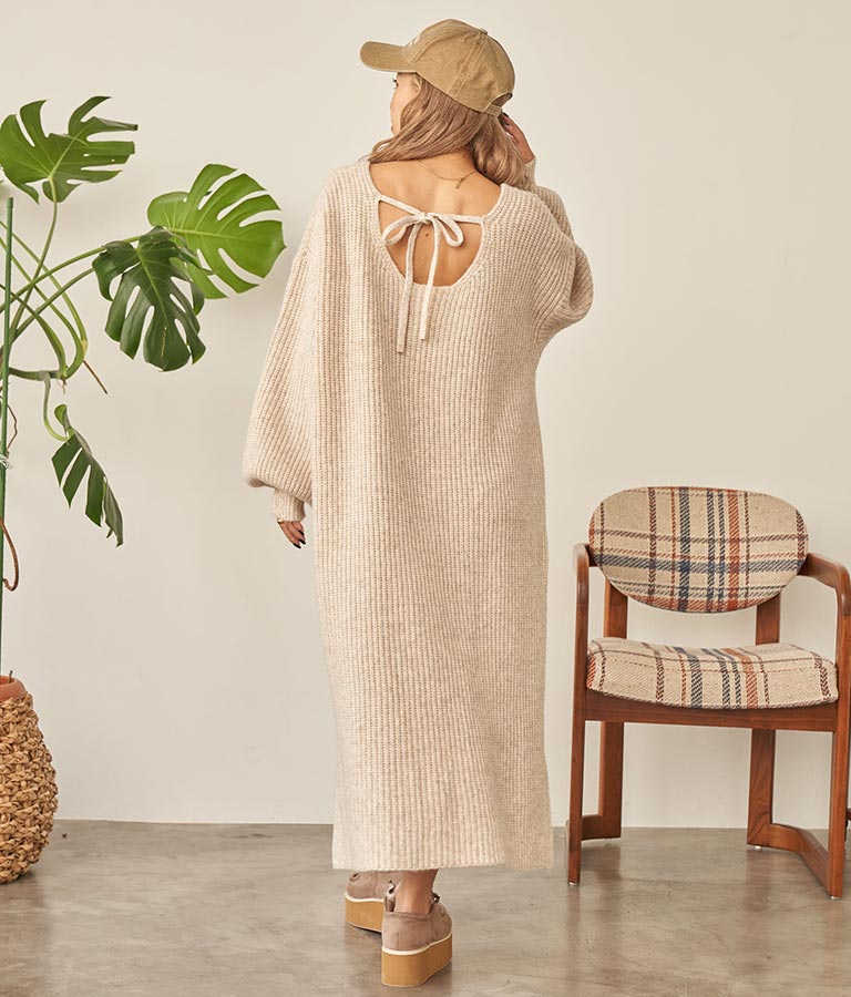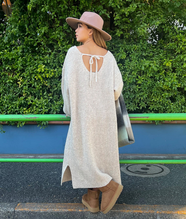 バックリボンがポイントのニットワンピース。