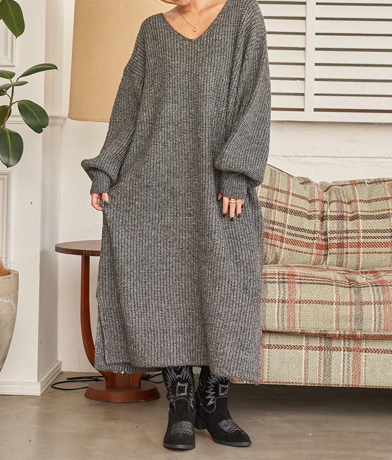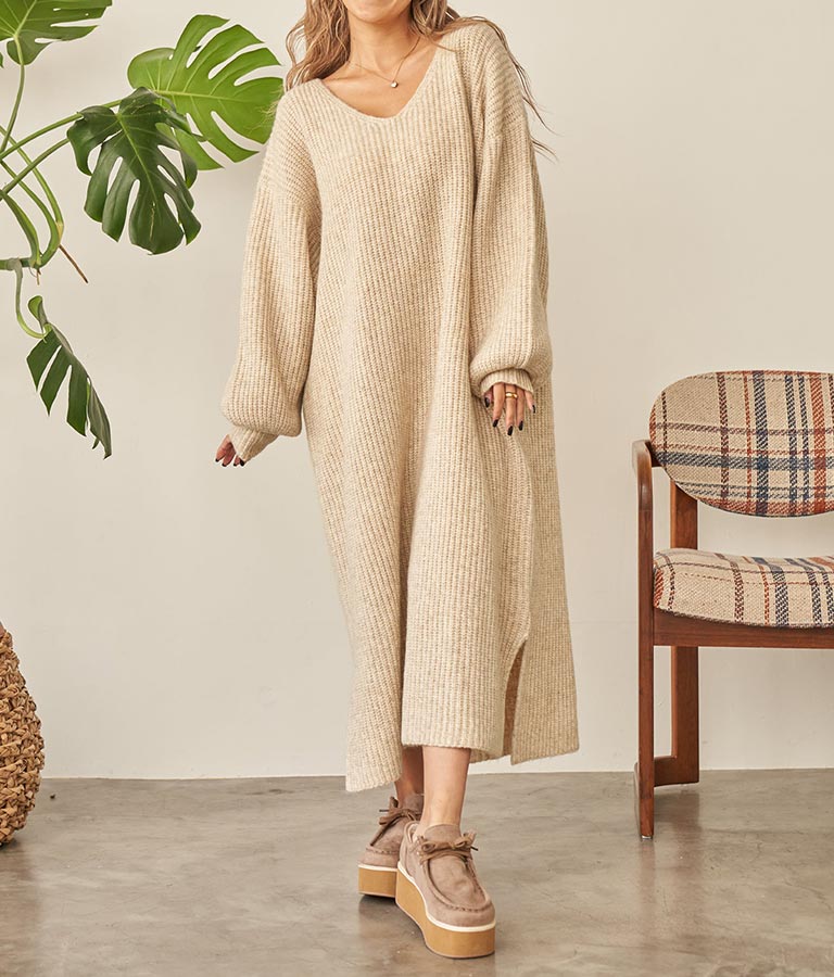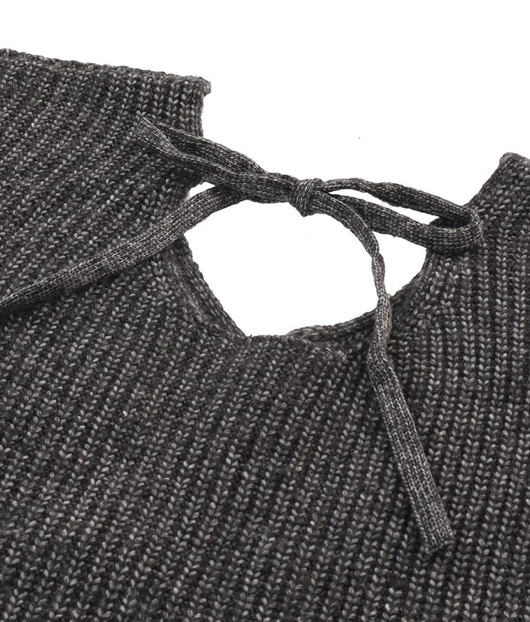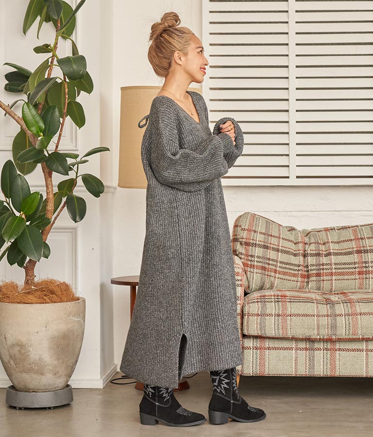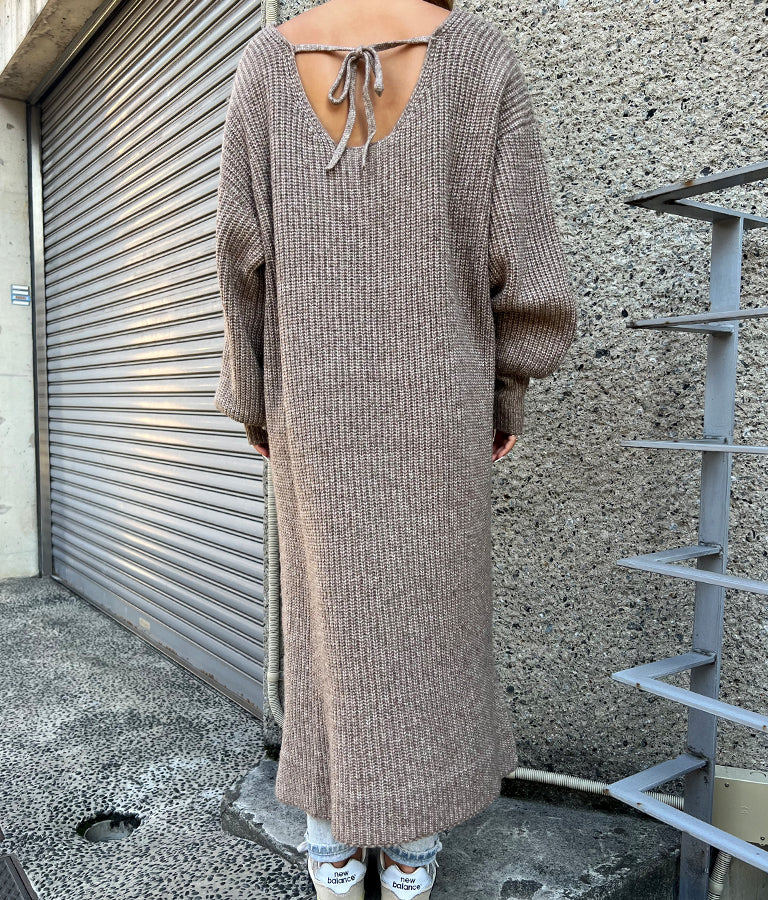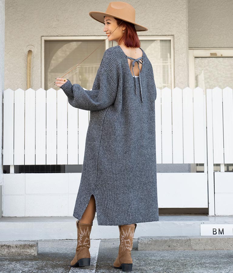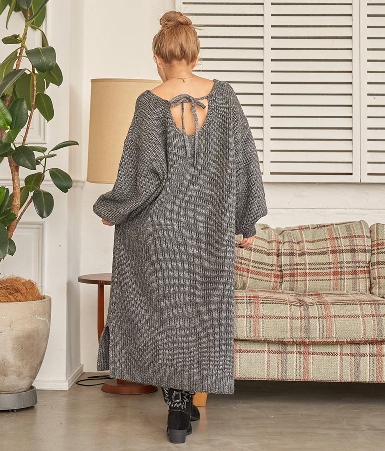 ウール混 バックリボン サイド スリット MIX ニット ワンピース