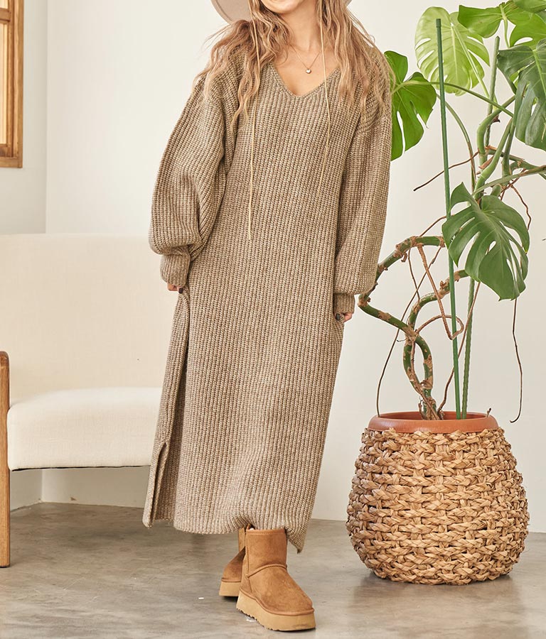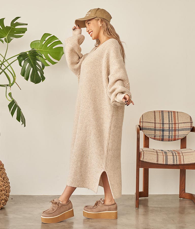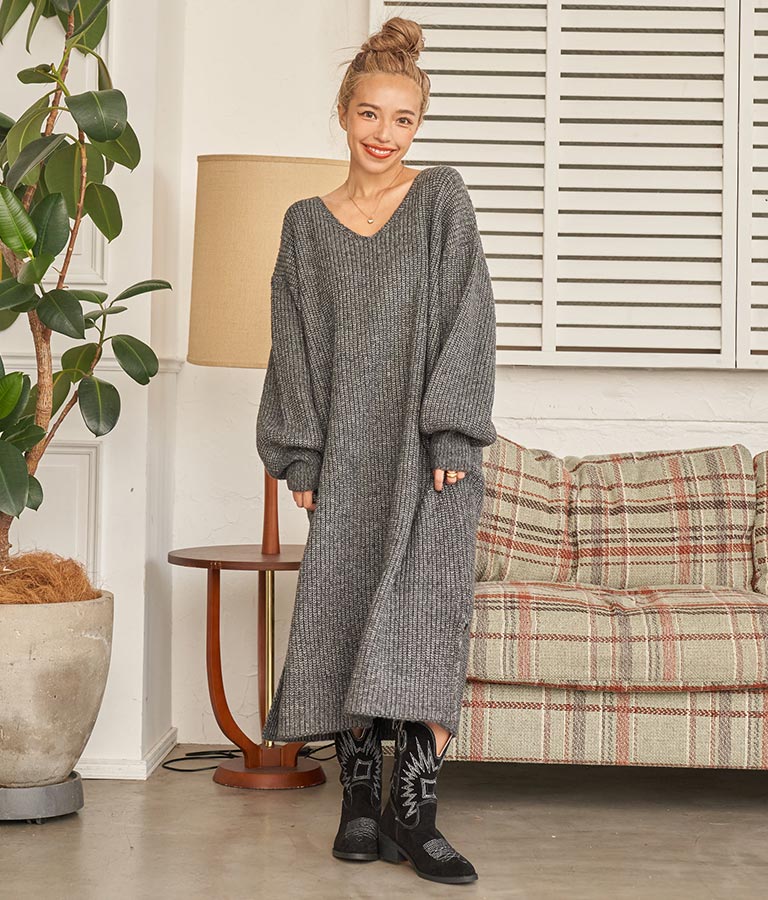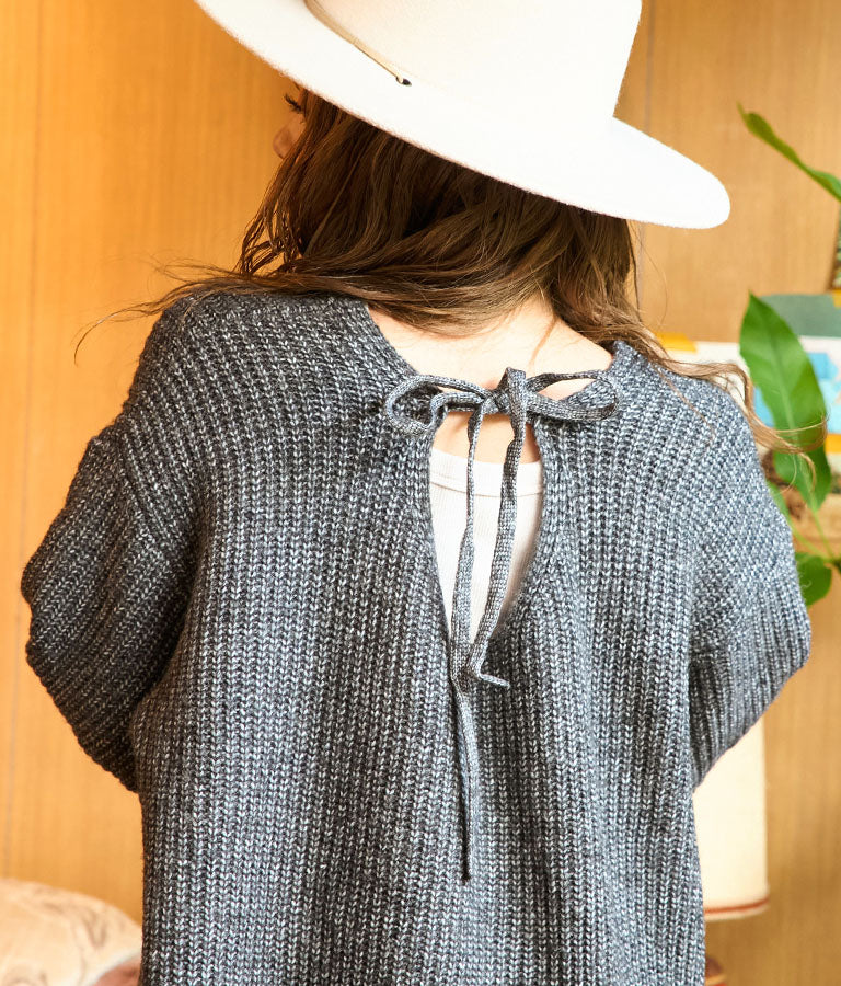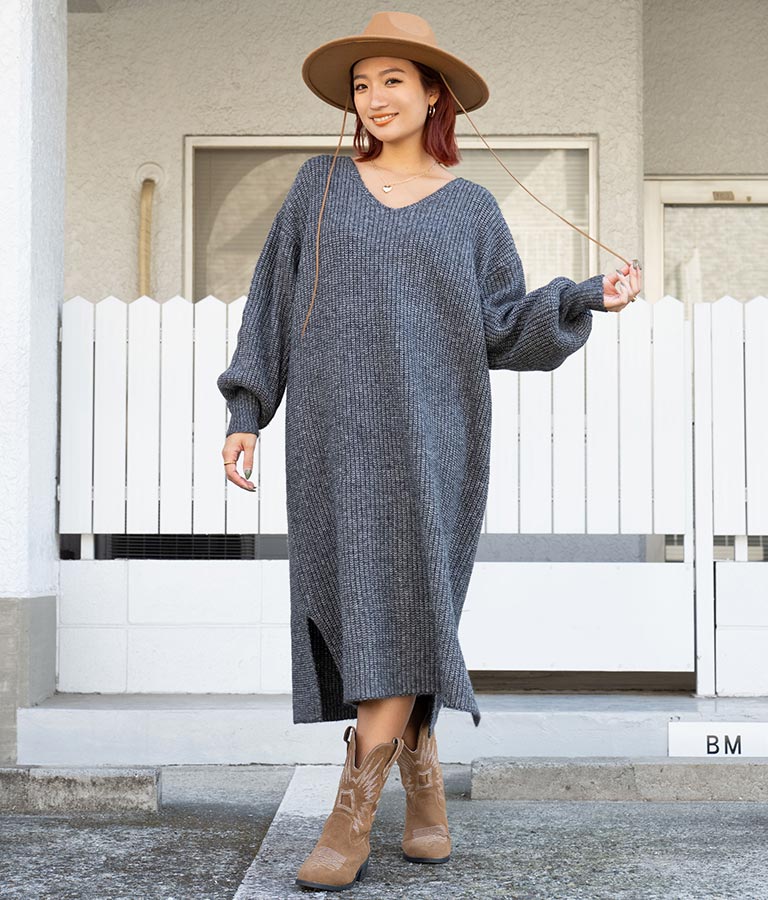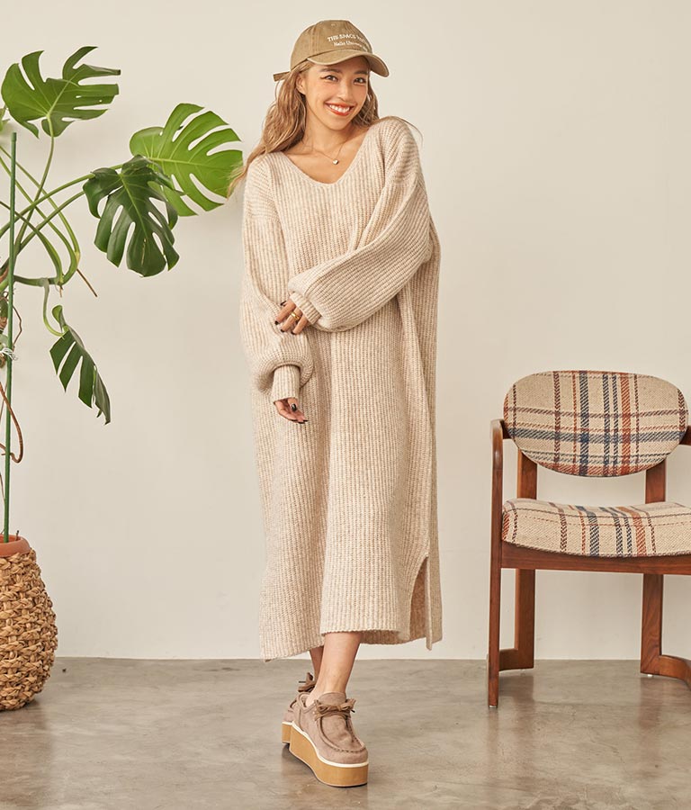 ウール混 バックリボン サイド スリット MIX ニット ワンピース