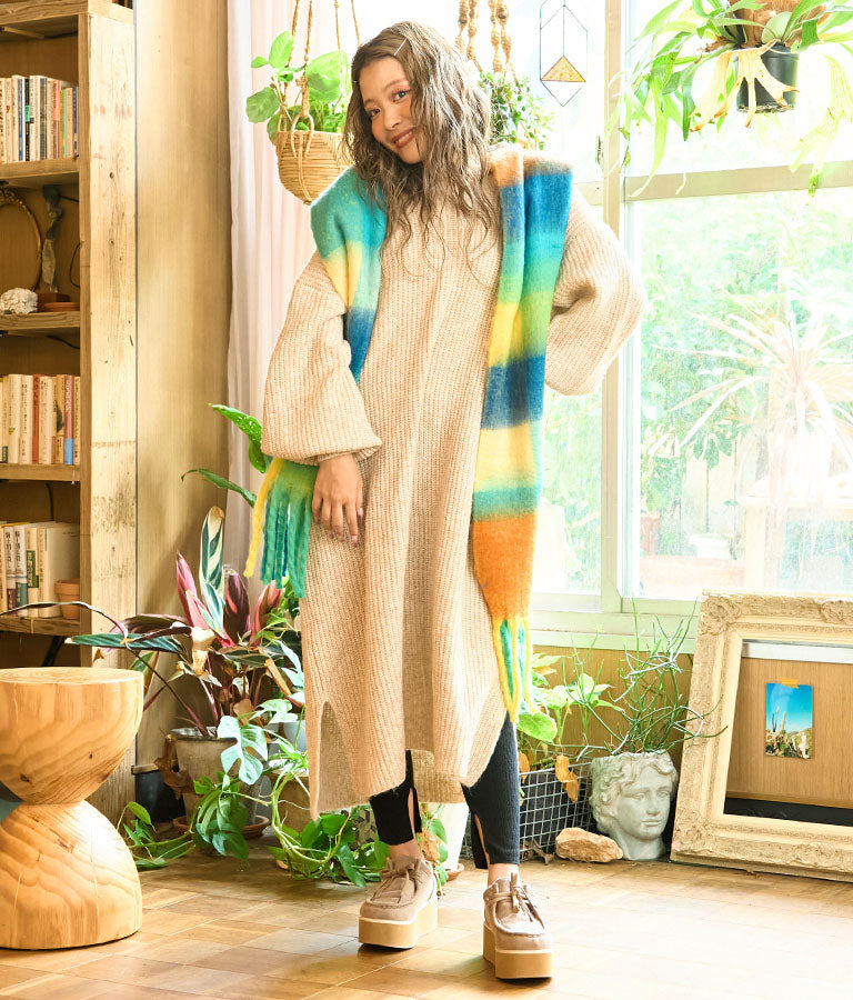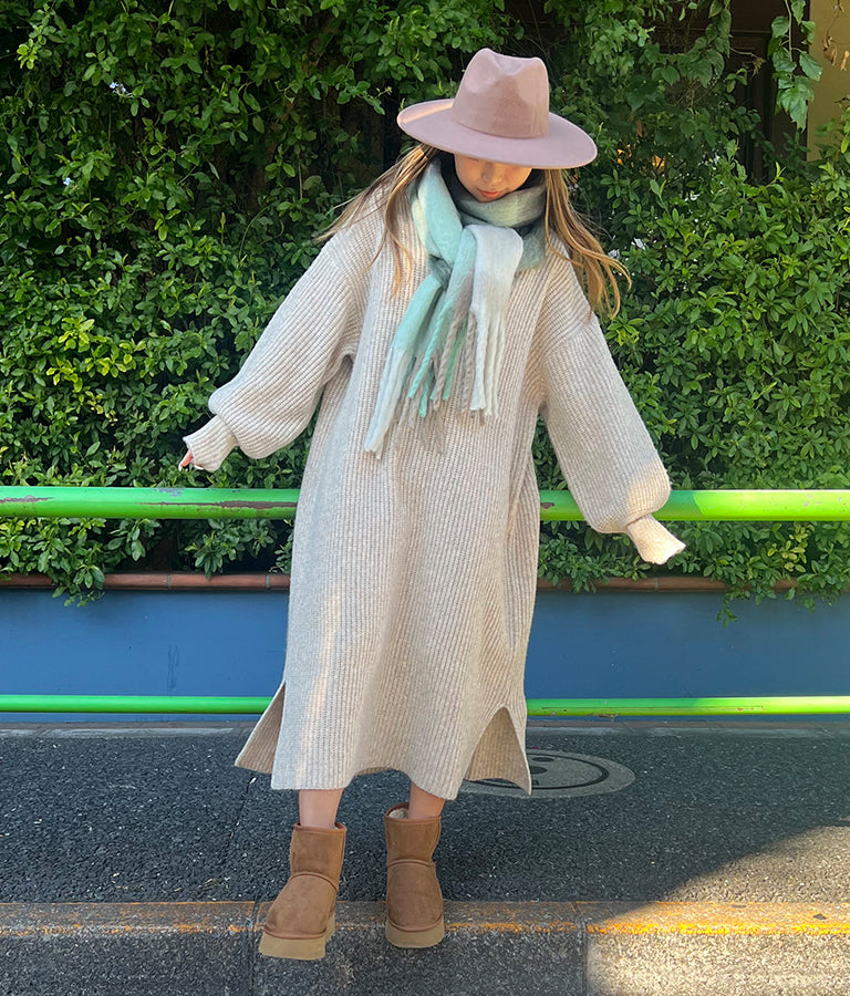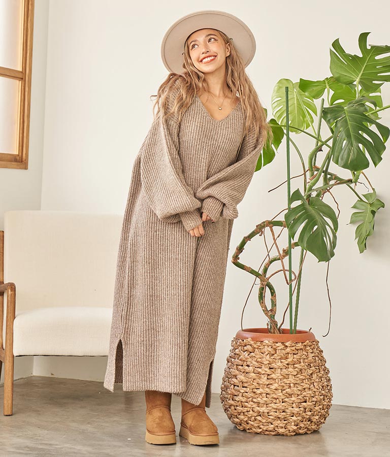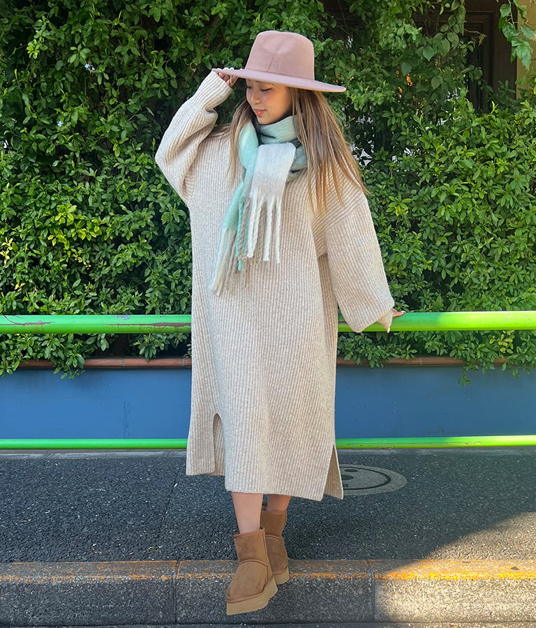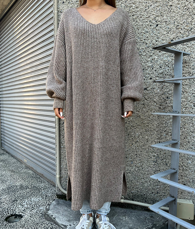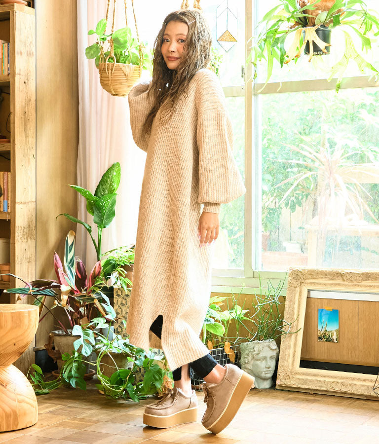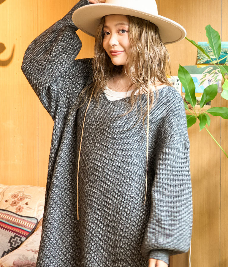 ウール混 バックリボン サイド スリット MIX ニット ワンピース