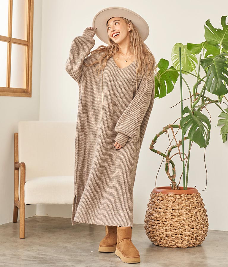 ウール混 バックリボン サイド スリット MIX ニット ワンピース 857-5719