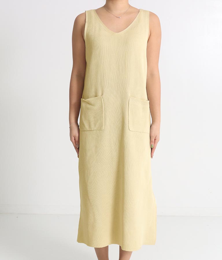 伸縮性のあるリブ生地を使用した、イージーに着られるロングニットワンピース。