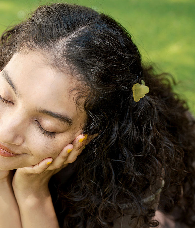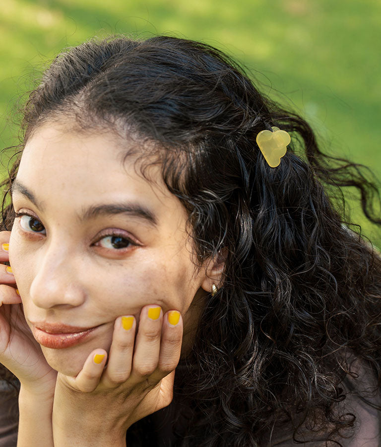 〇ナチュラルフェミニンに→ゆるくまとめたローポニーに、イエローやアイボリーのクリップをプラス。やわらかく優しい雰囲気を演出しつつ、大人の余裕も漂います。