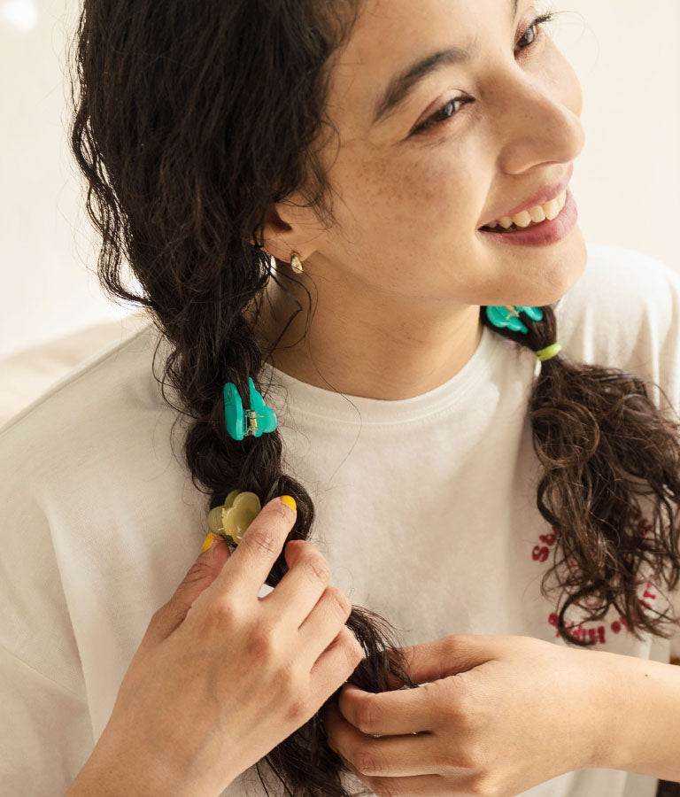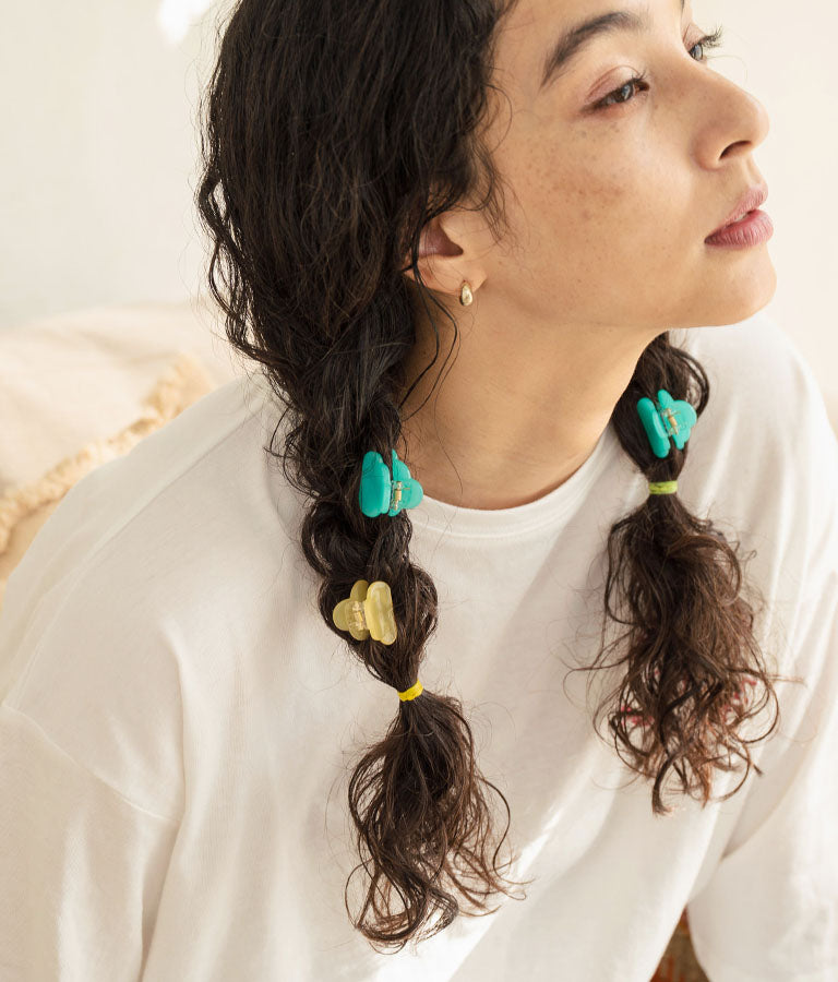 〇カジュアルママコーデにアクセントを加えたい→Tシャツ×デニムの日常スタイルに、ピンクやターコイズのクリップで遊び心を。シンプルな装いにほんの少しの可愛げが加わることで、一気に華やかな印象に。