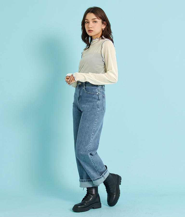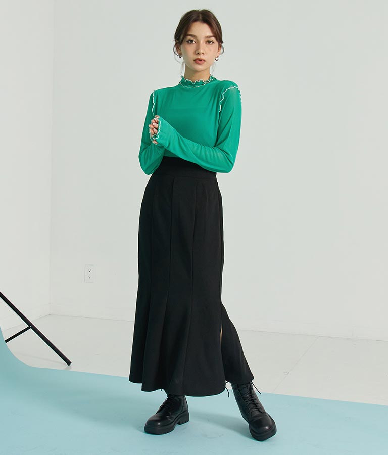 上品な印象を与えてくれるハイネックでレイヤードスタイルも楽しめます。