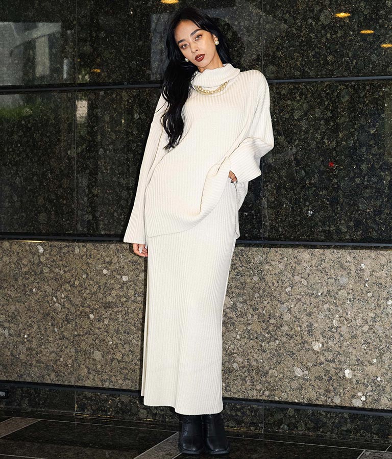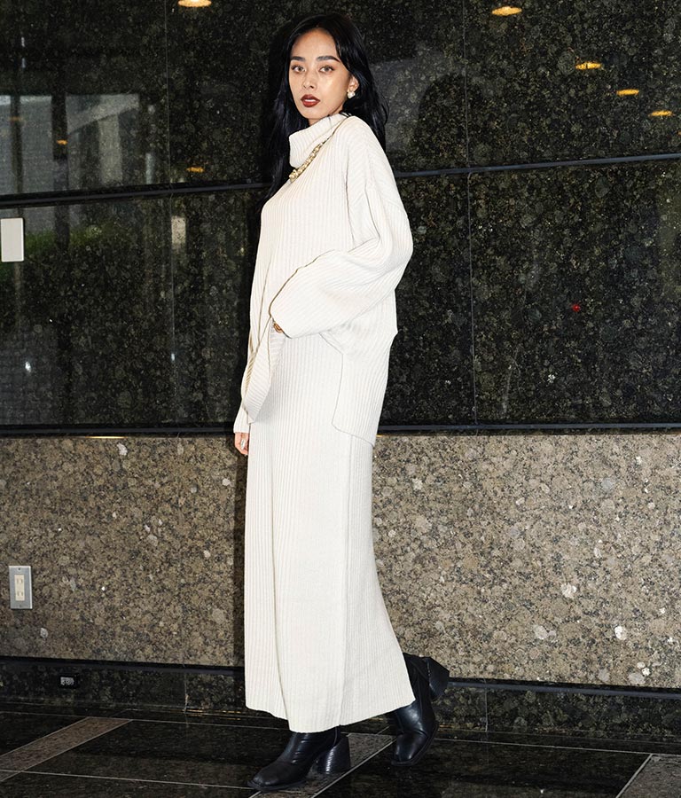 同素材を使用した【オフタートルリブニットチュニック】とのセットアップでの着用もオススメ。