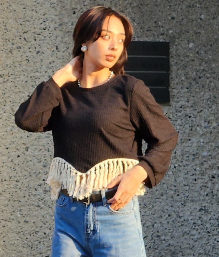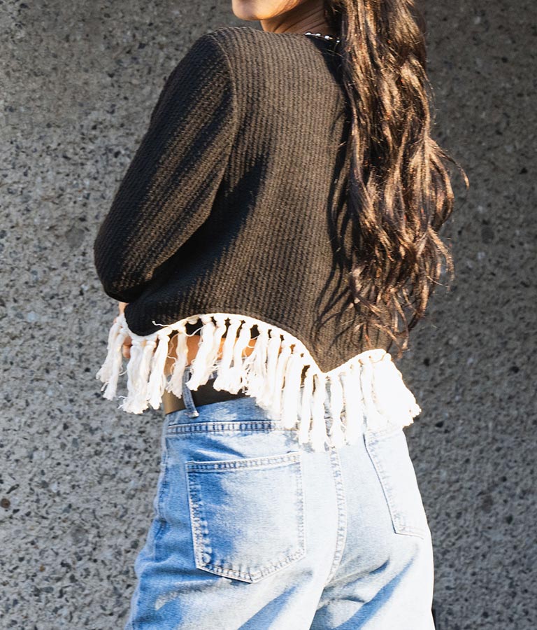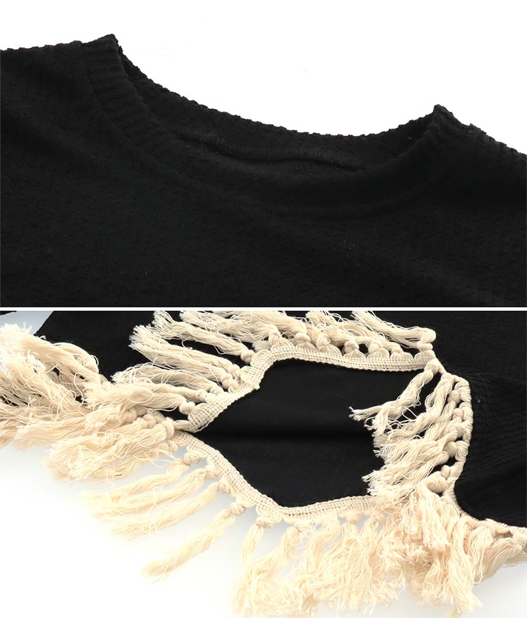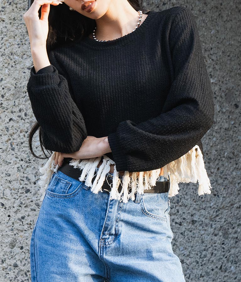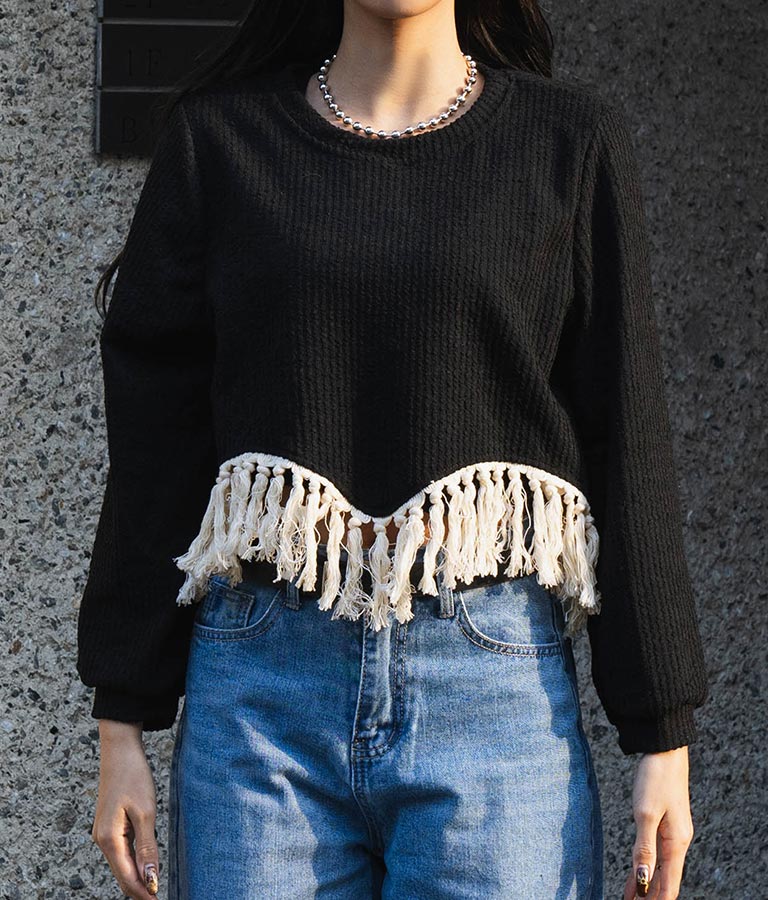 表情感のある編地に裾のフリンジがアクセントになったトップス。