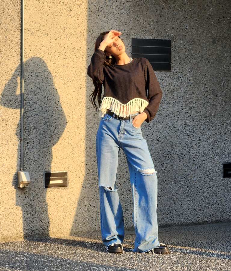 個性的なヘムライン+フリンジで個性がありつつもベーシックなシルエットで合わせやすい◎