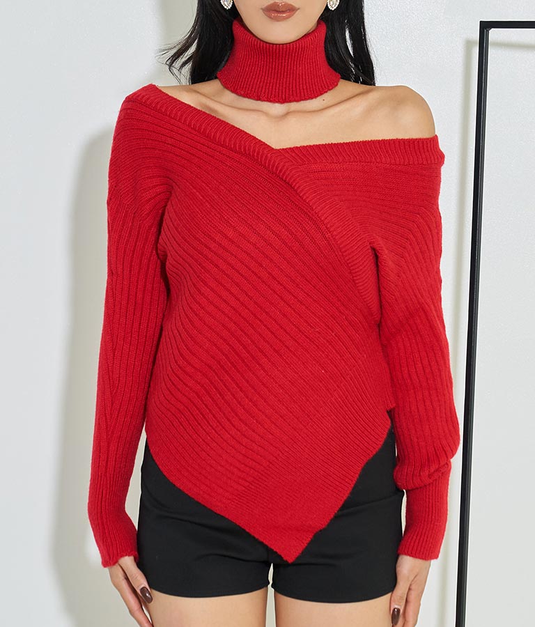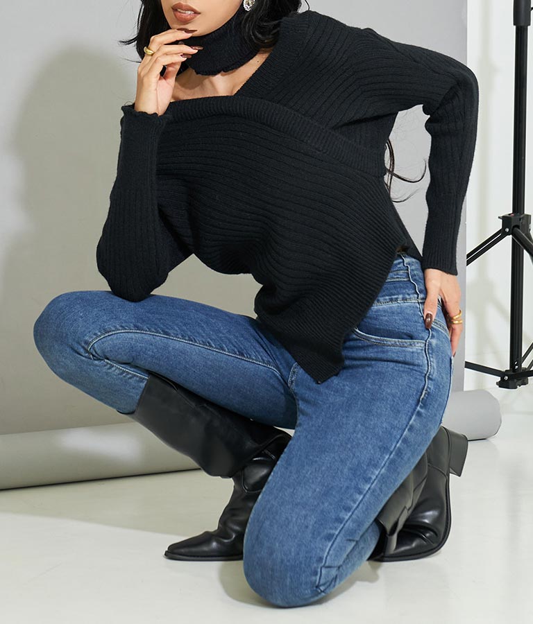 ざっくり空いたVラインとチョーカーの程よい肌見せがセンシュアルな雰囲気漂うニットトップス。
