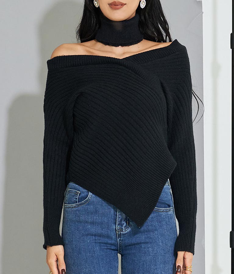カシュクールアシンメトリー Vネック チョーカー付 セーター ニット 長袖 403-8469